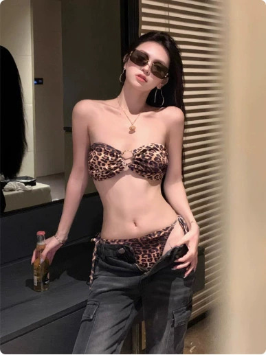유럽과 미국의 3 점 스트랩리스 레오파드 무늬 비키니 수영복 여성 스플릿 트라이앵글 스트랩리스 섹시 비키니 수영복스토어 가기