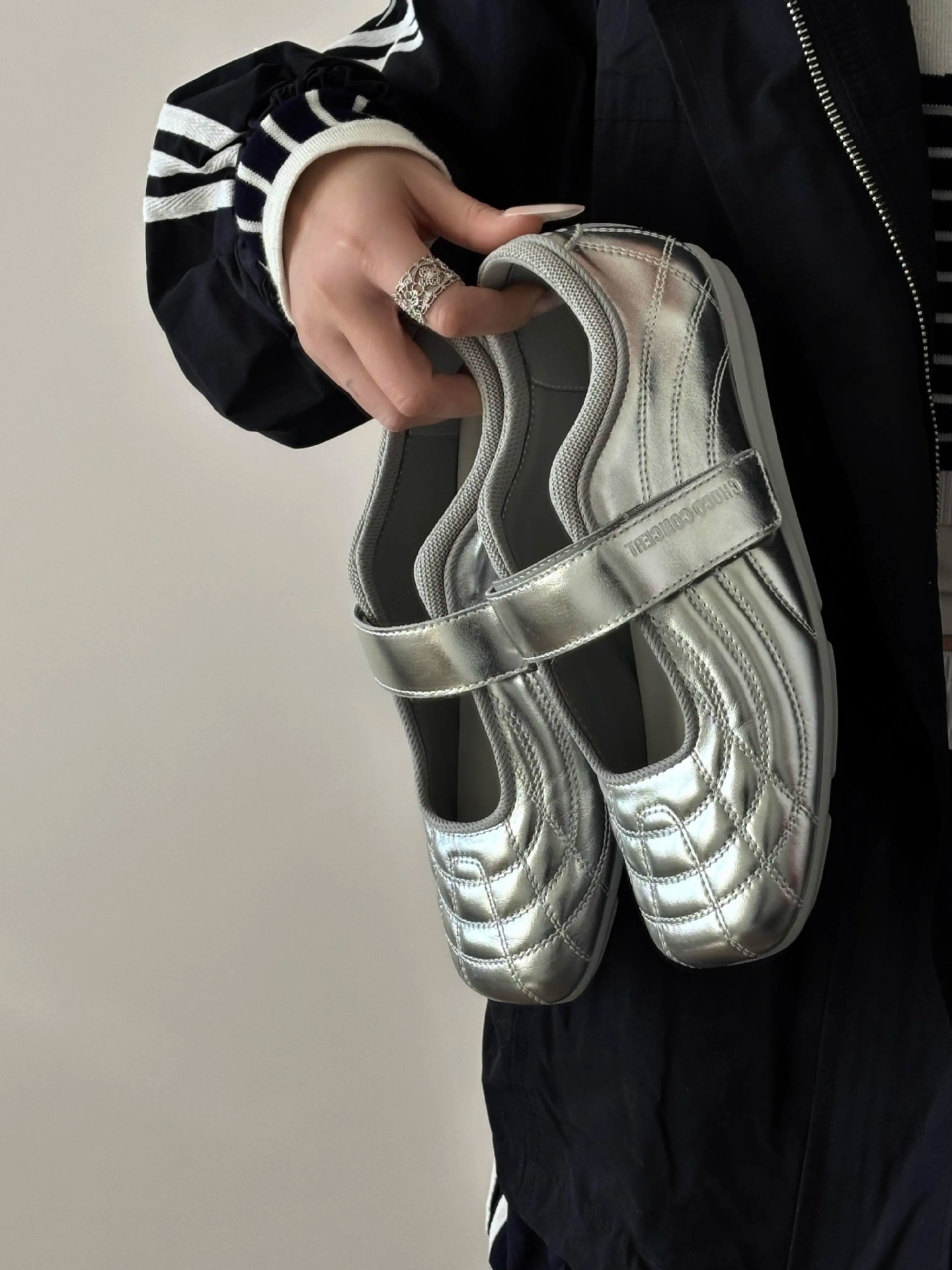 양가죽 버전 2025 새로운 한국 스타일 벨크로 발레 신발 플랫 하단 메리 제인 여성 실버 신발 스포츠 캐주얼 신발