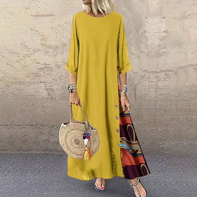 아마존 유럽과 미국의 봄과 가을 복고풍 꽃 둥근 목 대비 단추 면화 및 리넨 7 점 소매 원피스스토어 가기