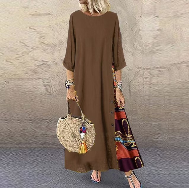 아마존 유럽과 미국의 봄과 가을 복고풍 꽃 둥근 목 대비 단추 면화 및 리넨 7 점 소매 원피스