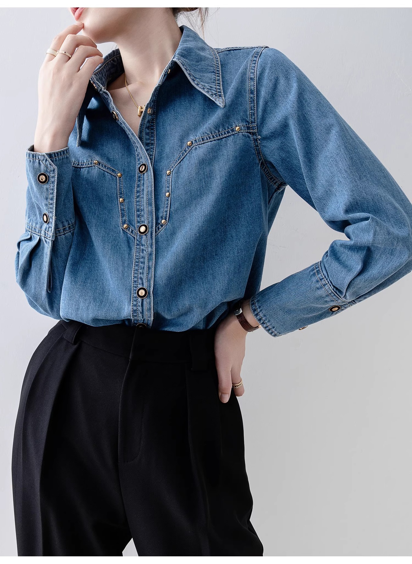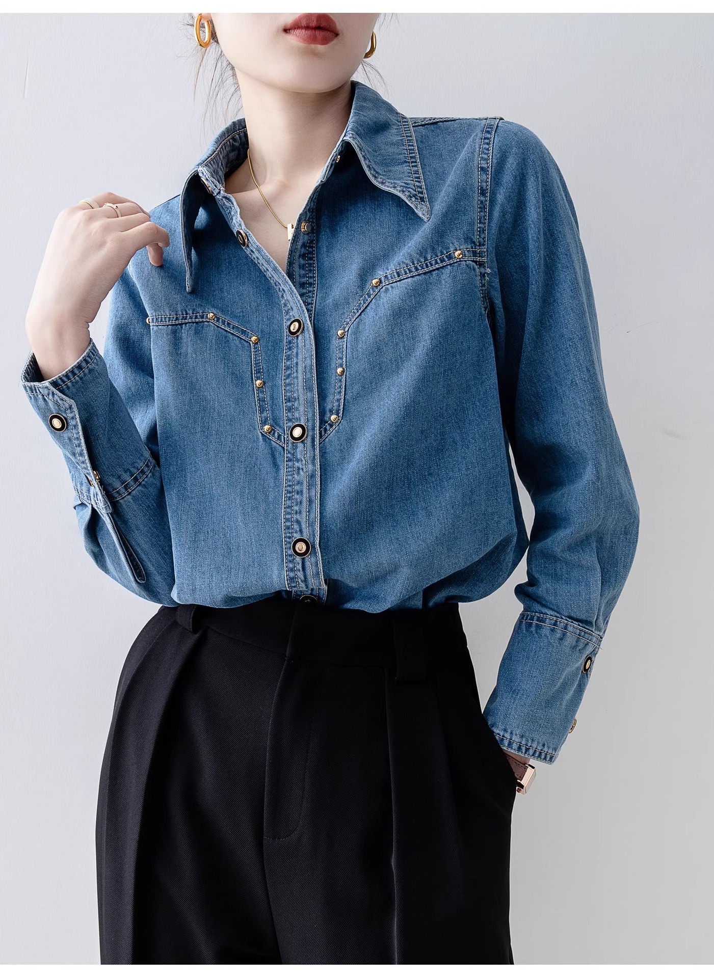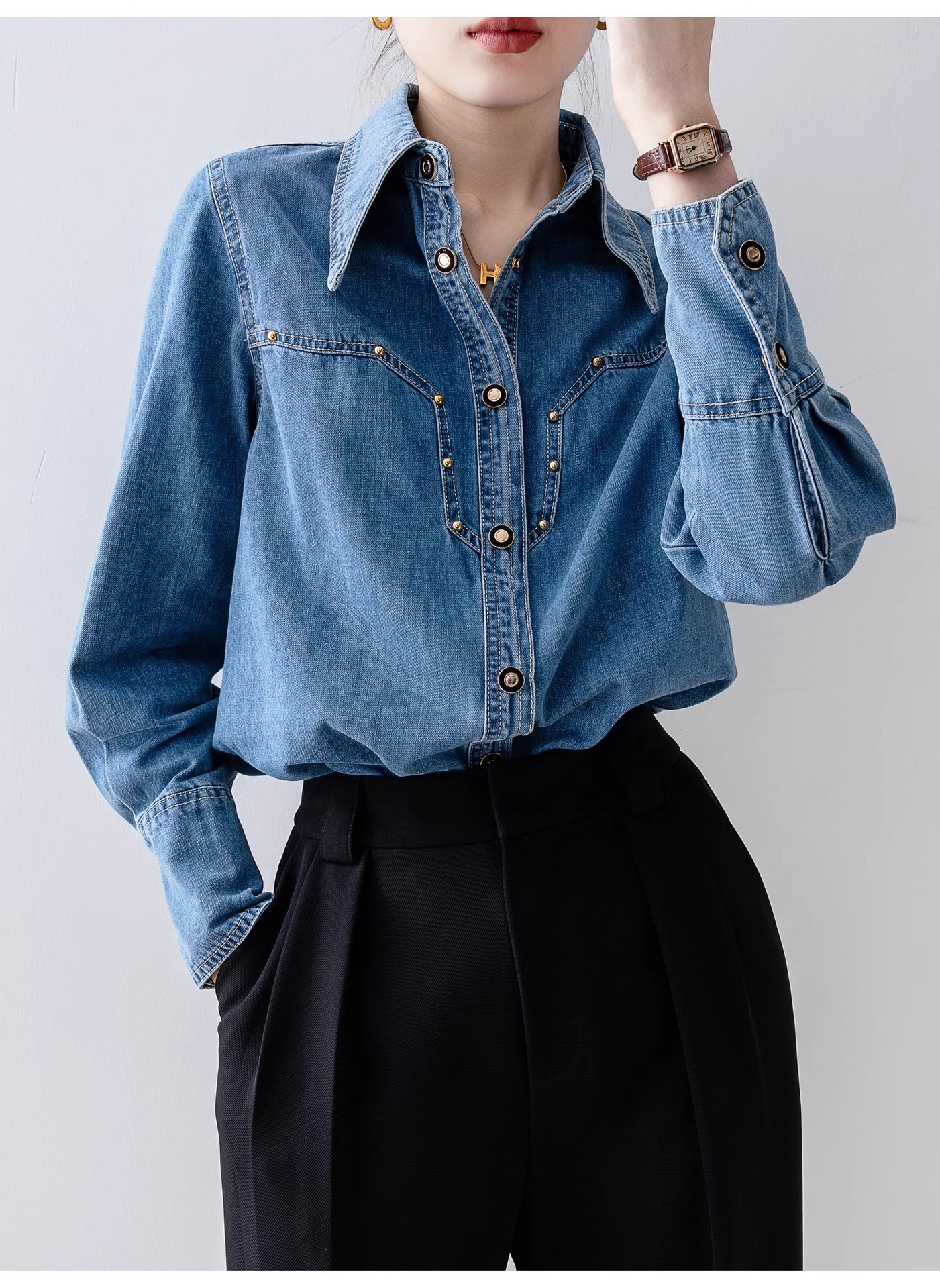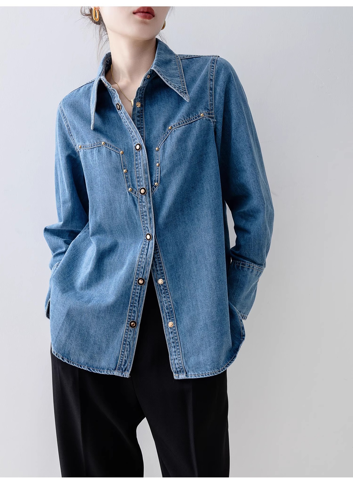 새로운 유럽 스타일 레트로 데님 셔츠 여성용 봄 프렌치 스타일 루즈핏 셔츠 다용도 긴팔 상의 여성 의류 A2971
