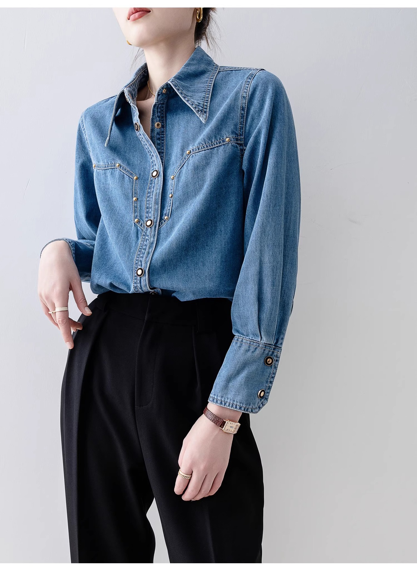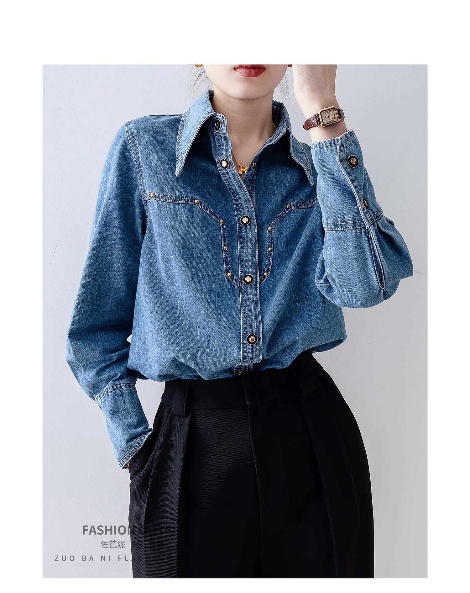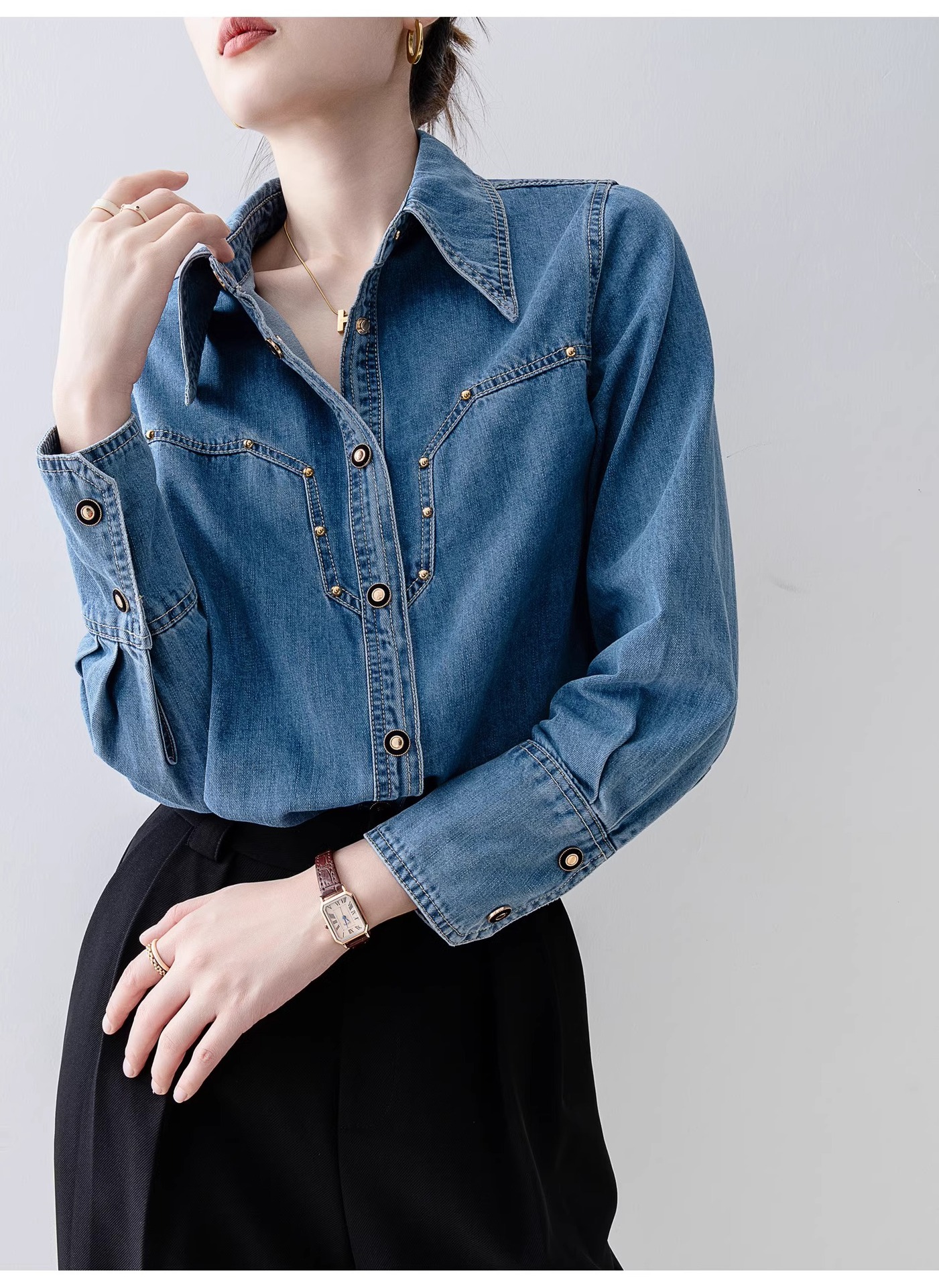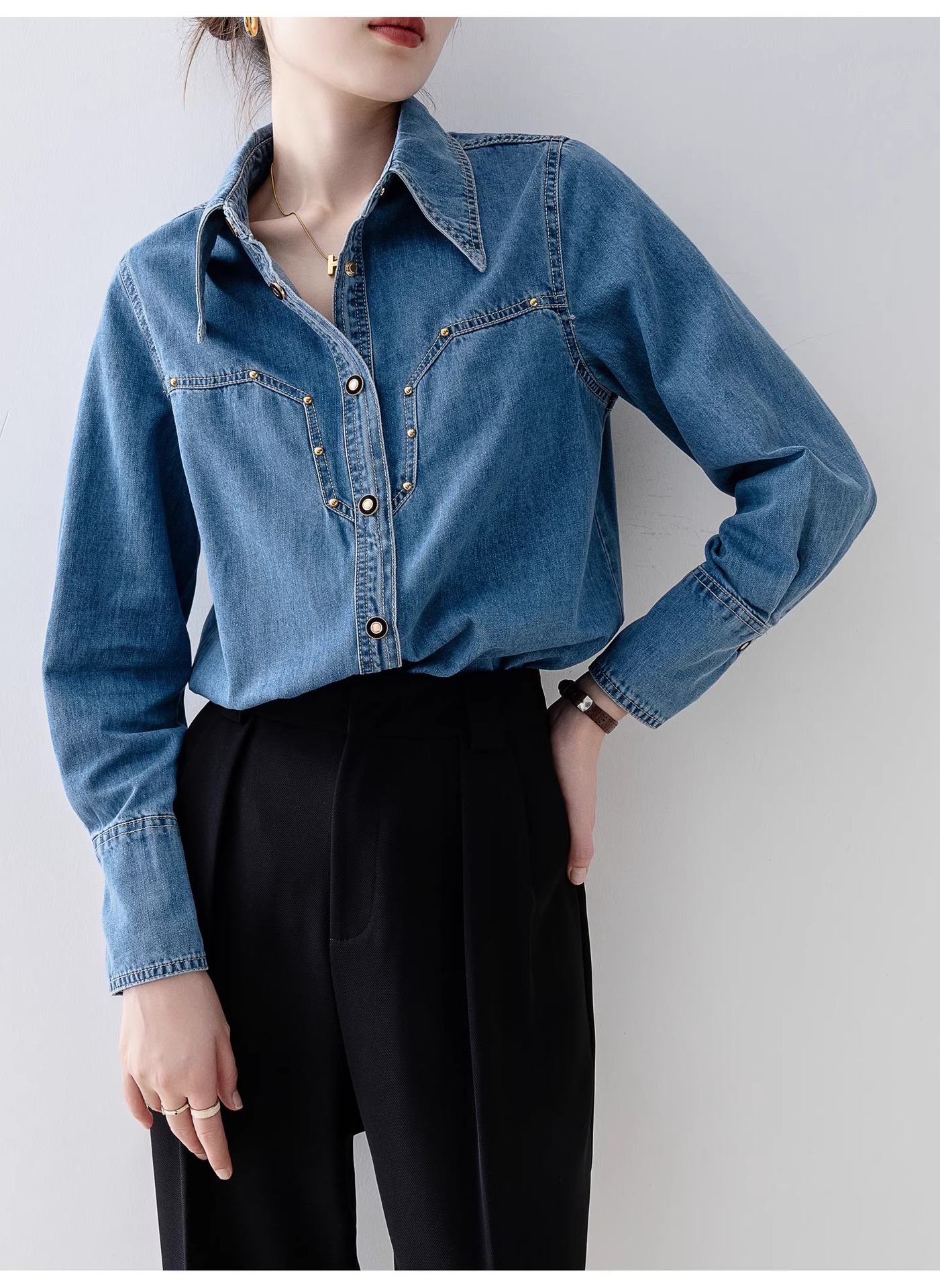 새로운 유럽 스타일 레트로 데님 셔츠 여성용 봄 프렌치 스타일 루즈핏 셔츠 다용도 긴팔 상의 여성 의류 A2971