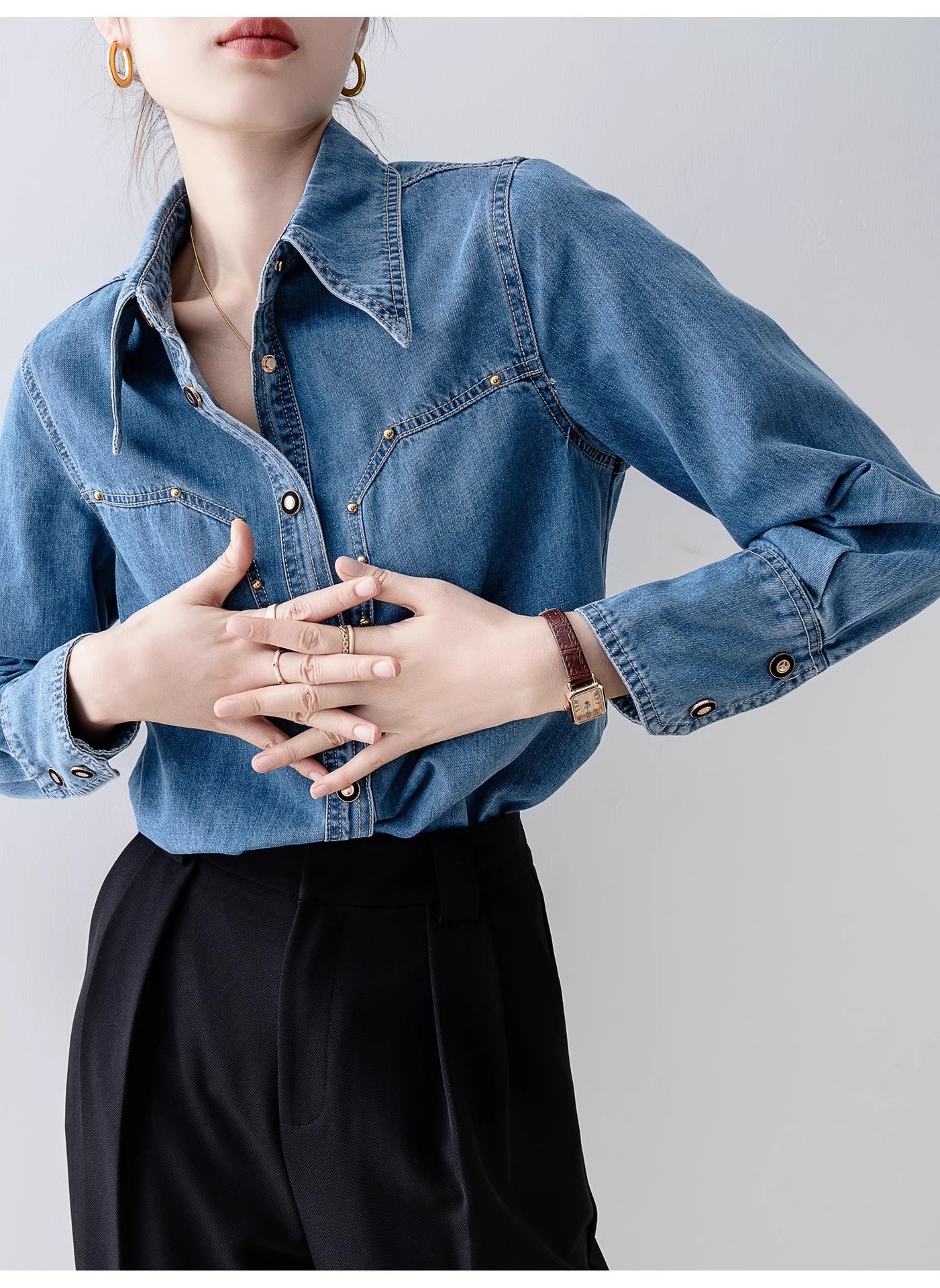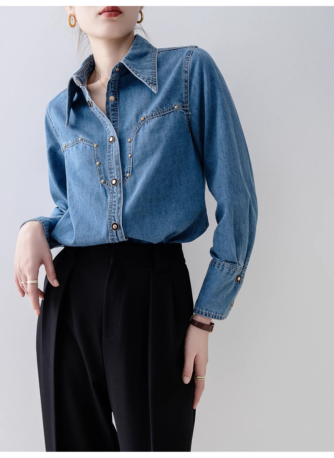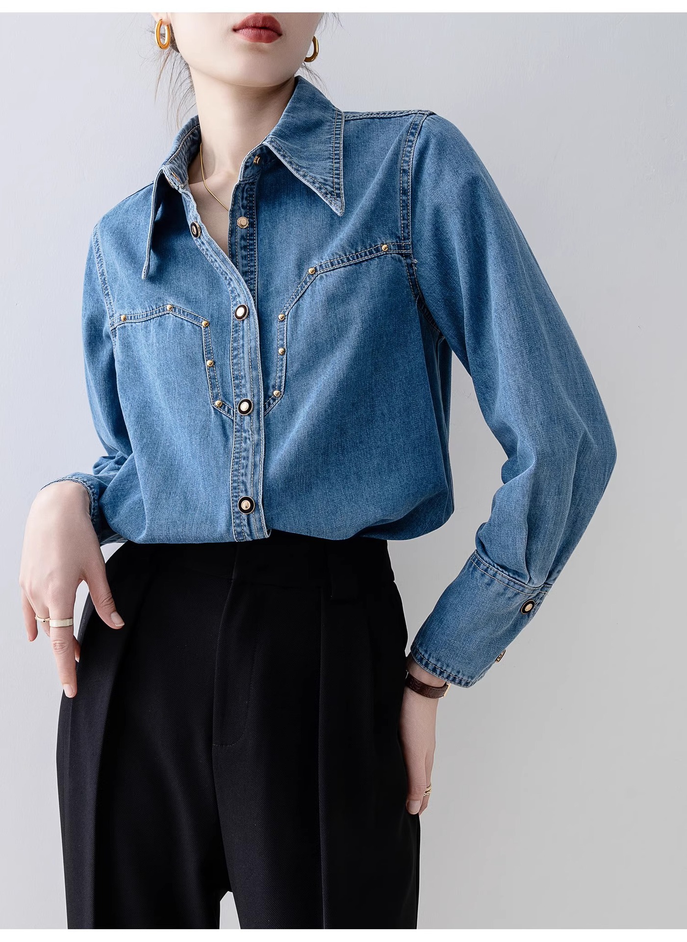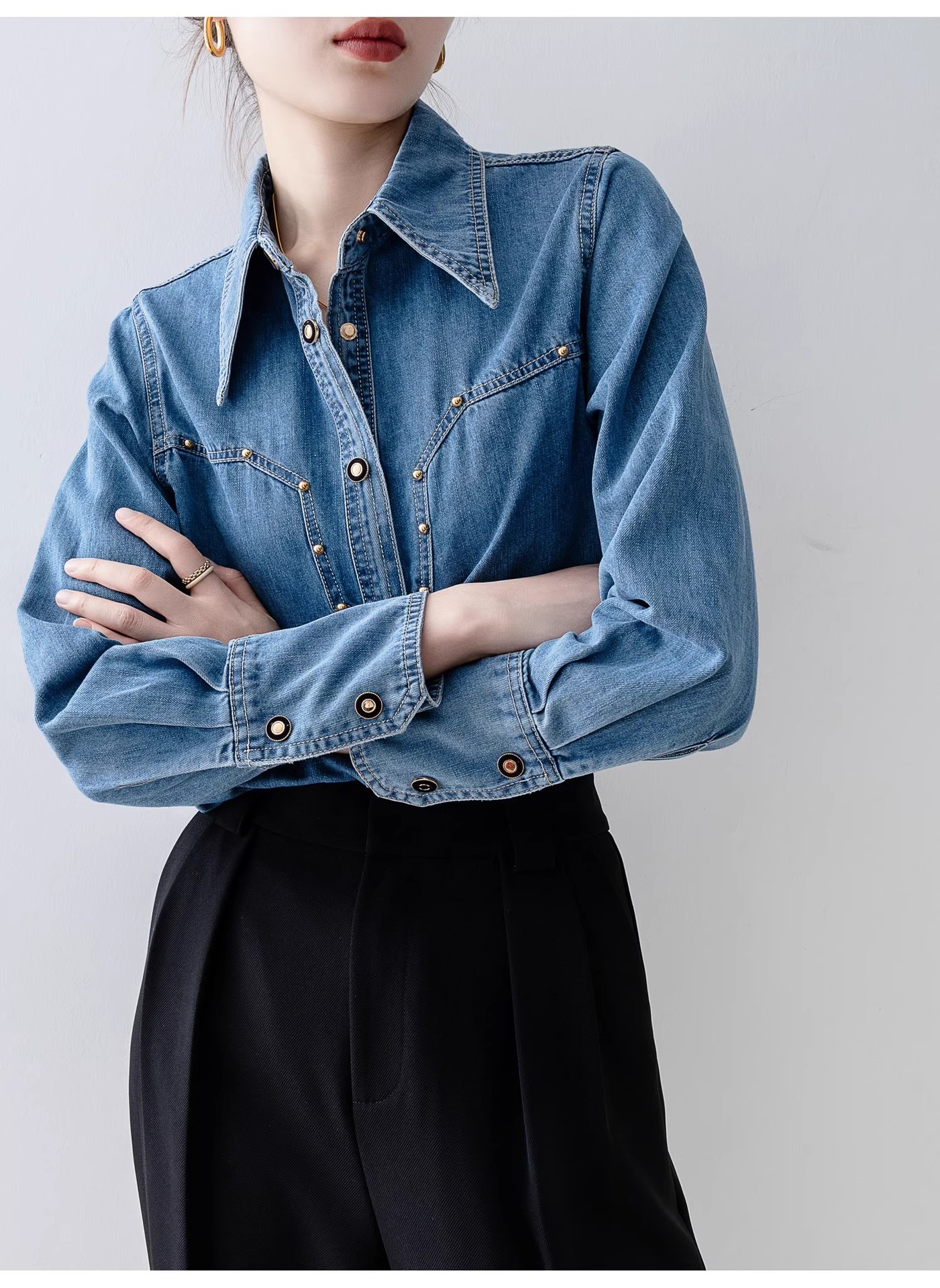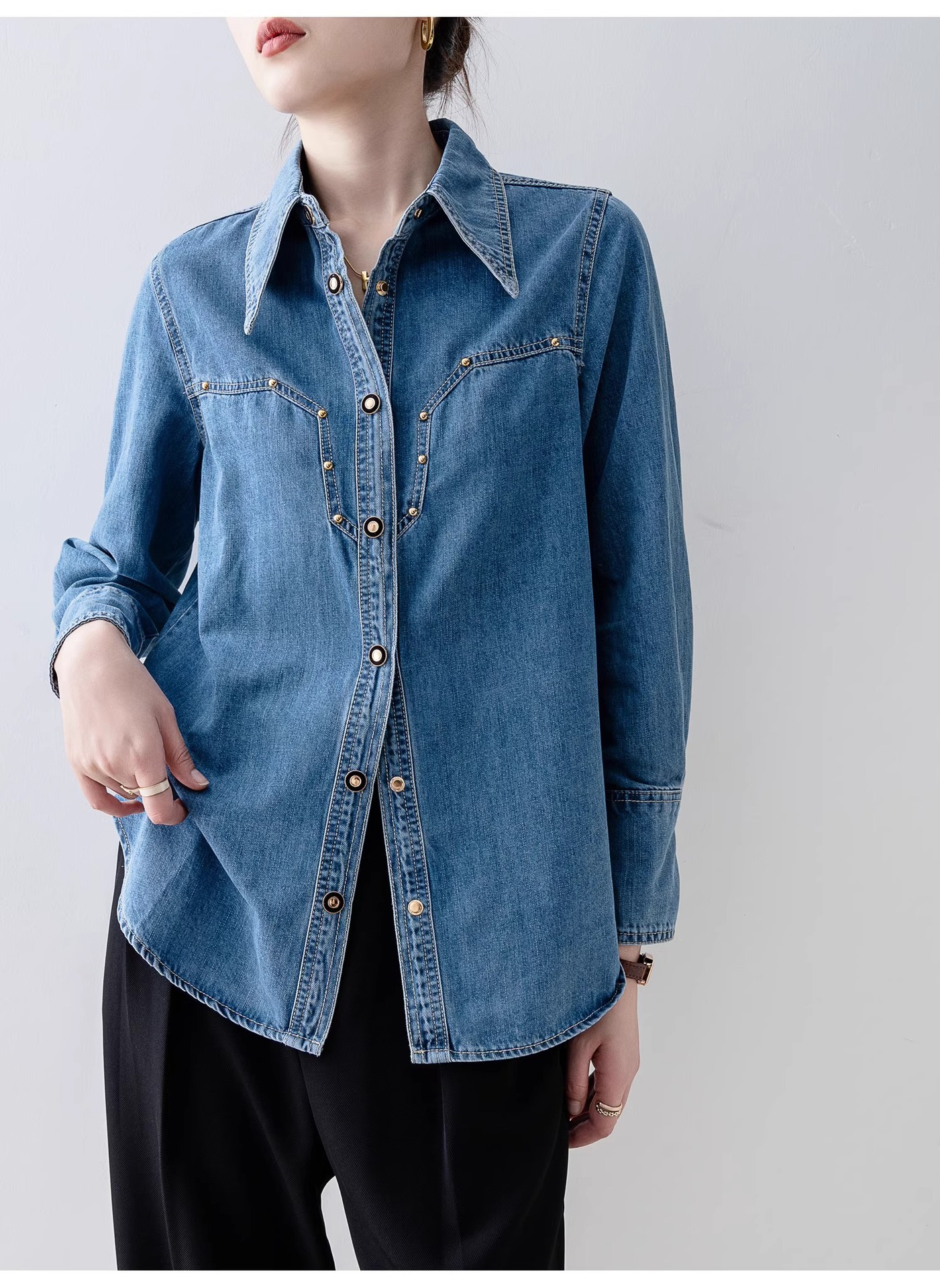 새로운 유럽 스타일 레트로 데님 셔츠 여성용 봄 프렌치 스타일 루즈핏 셔츠 다용도 긴팔 상의 여성 의류 A2971스토어 가기