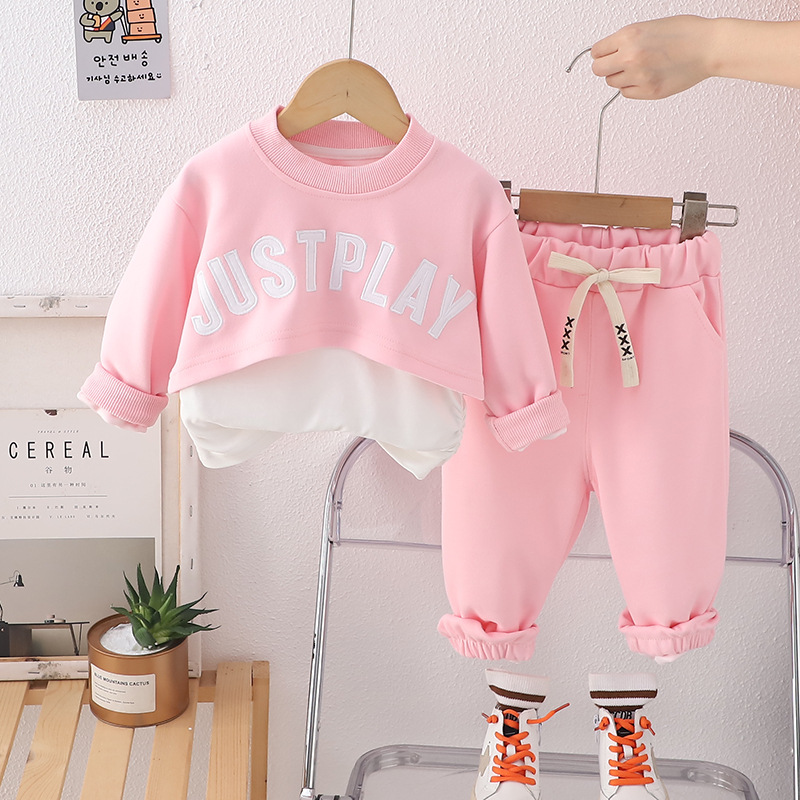 2025 새로운 서양식 어린이 유행 아기의 봄과 가을 편지 둥근 목 긴 소매 3 조각 세트 소녀의 봄 패션 세트