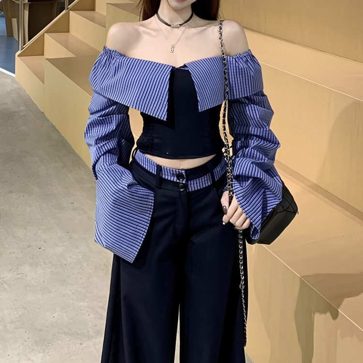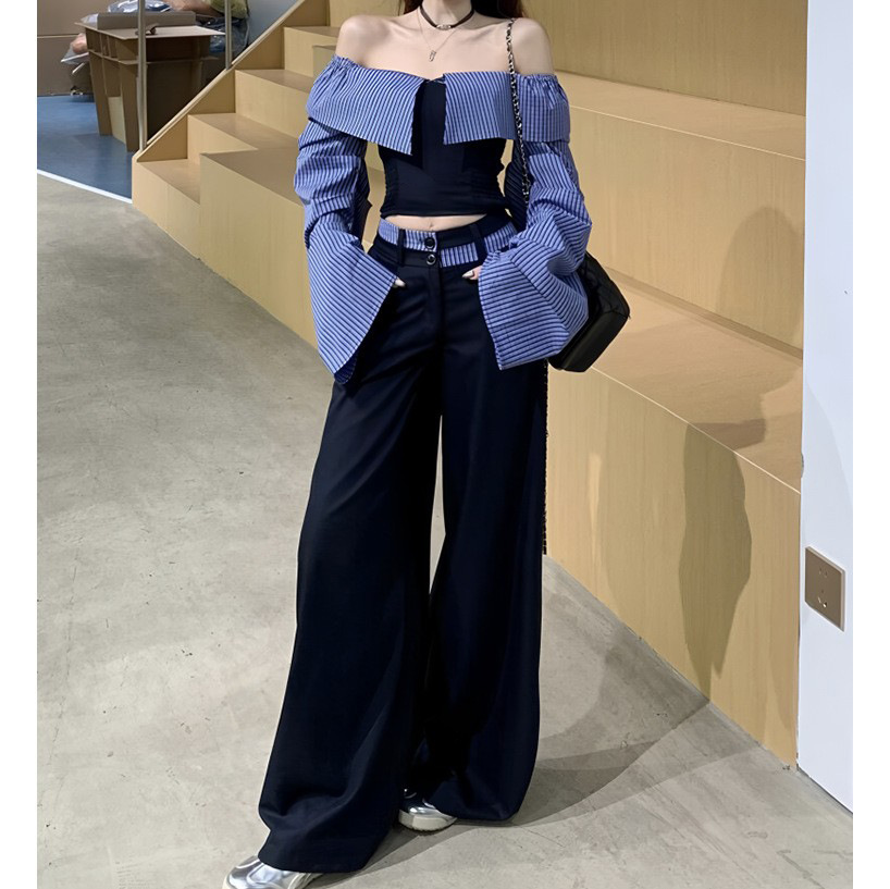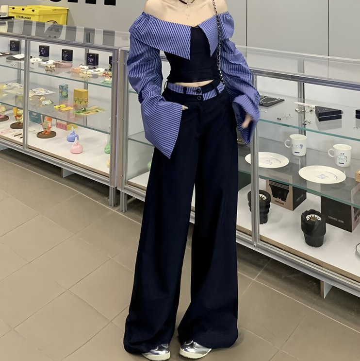 빈티지 명암 어깨 줄무늬 바느질 긴팔 셔츠 여성용 봄 프레피 캐주얼 와이드 레그 바지 투피스 세트스토어 가기