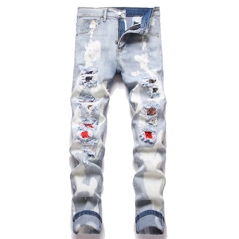 대외 무역 스타일 펑크 블루 헤비 크래프트 슬림 핏 스트레치 리핑 테이프 남성 청바지 트렌디 3879