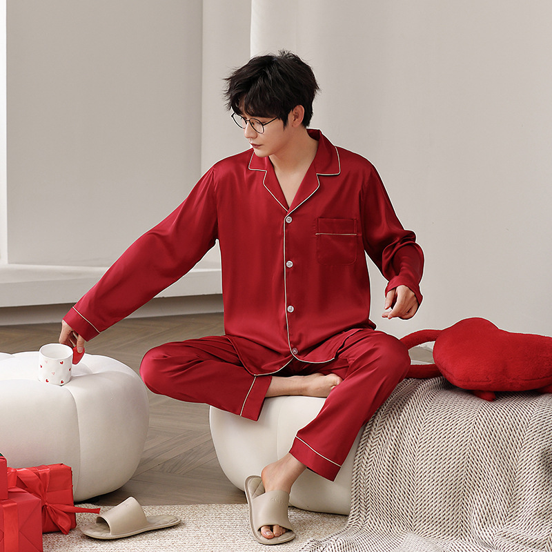 한 야통 커플 잠옷 카디건 세트 새틴 아이스 실크 봄과 여름 남성과 여성을위한 새로운 솔리드 컬러 의상