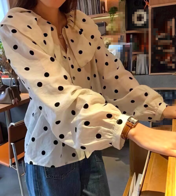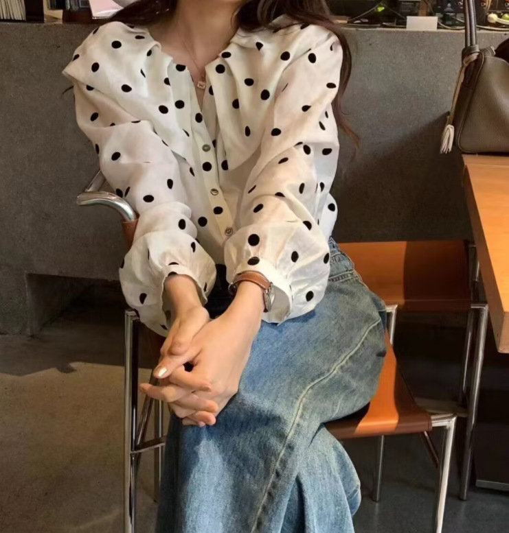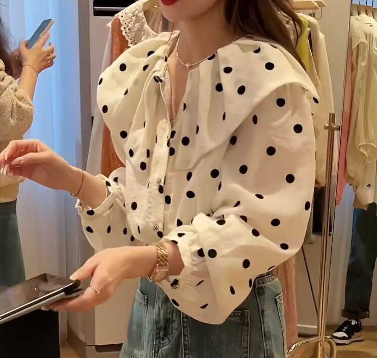 인형 칼라 긴팔 셔츠 여자 2025 봄 새로운 한국 스타일 달콤한 스타일 웨이브 싱글 브레스트 캐주얼 셔츠스토어 가기