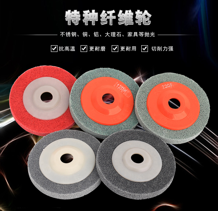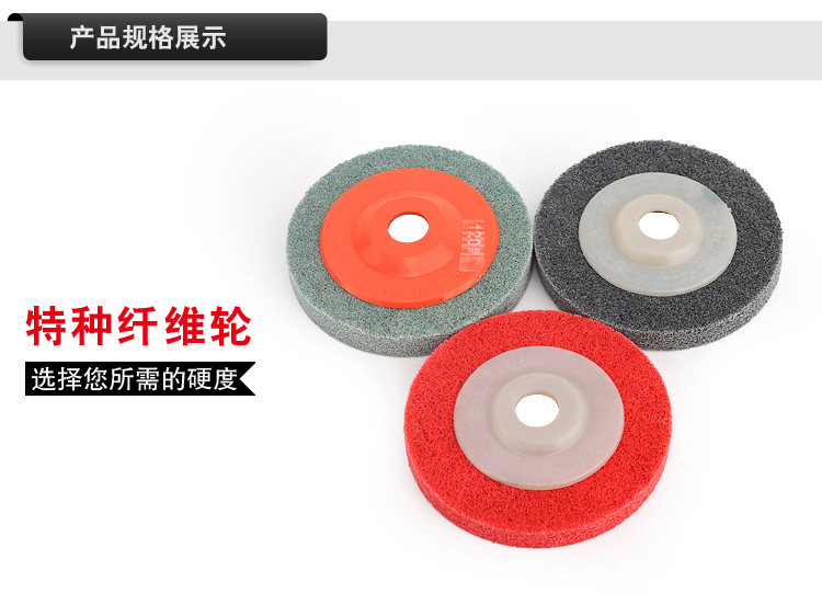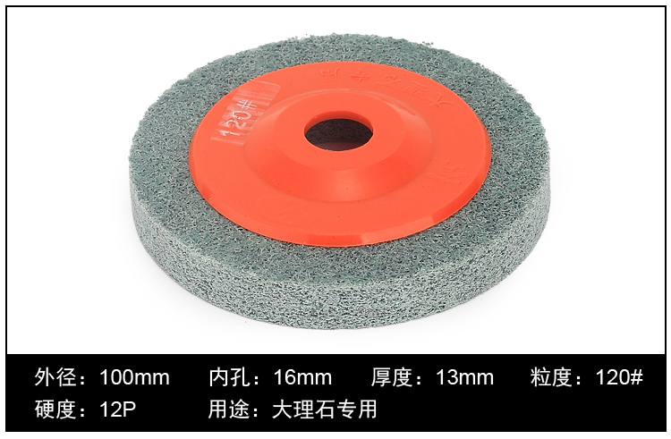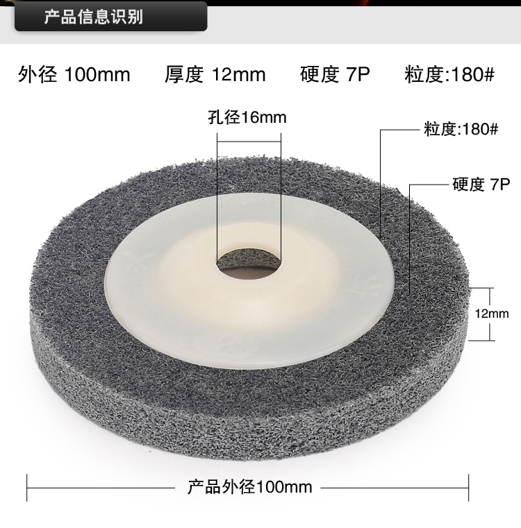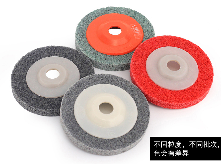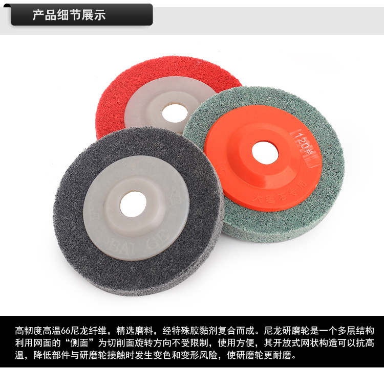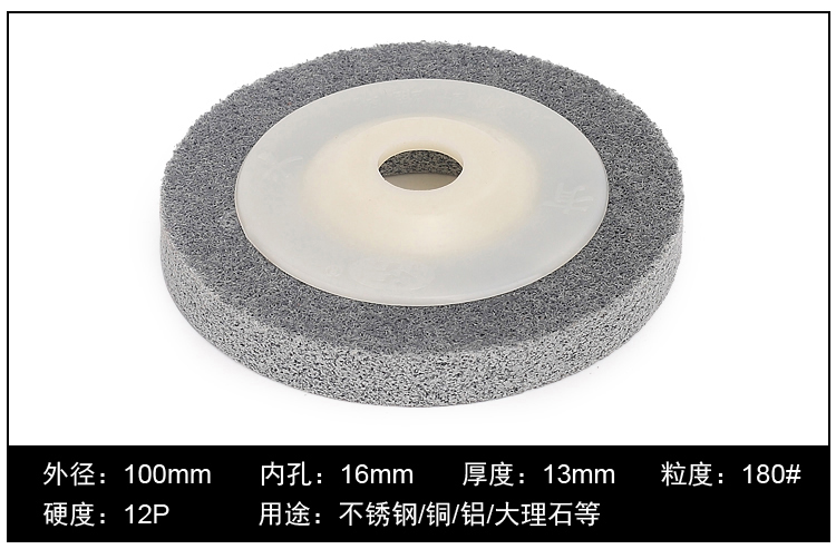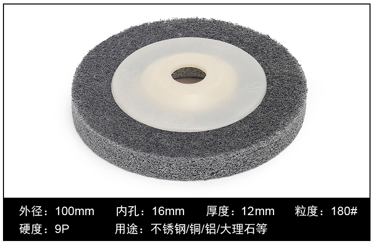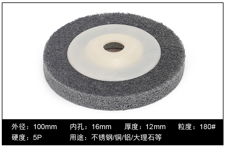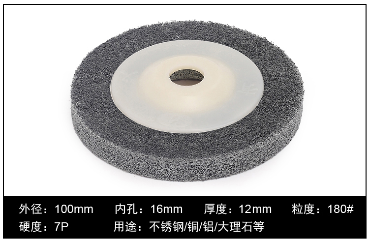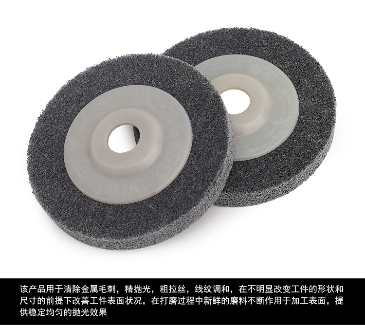 品名:尼龙抛光片 (角向尼龙轮) 规格:100MM(直径)*12MM(厚度)*16MM(内孔) 适用范围:不织布尼龙轮主要用在金属、木材和塑料等多种材料的表面装饰纹线处理,抛光,去毛刺,清洁和调和等,高效、高品质且省时、省力、省工序。研磨层具有优秀的防堵塞性,工件的外形尺寸保持性好;三维网体的研磨层,散热效果好,不易烧伤工件;使用寿命长。适用在100的角磨机.