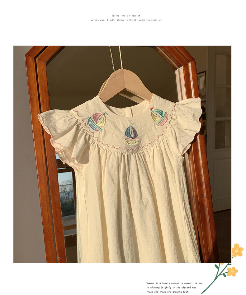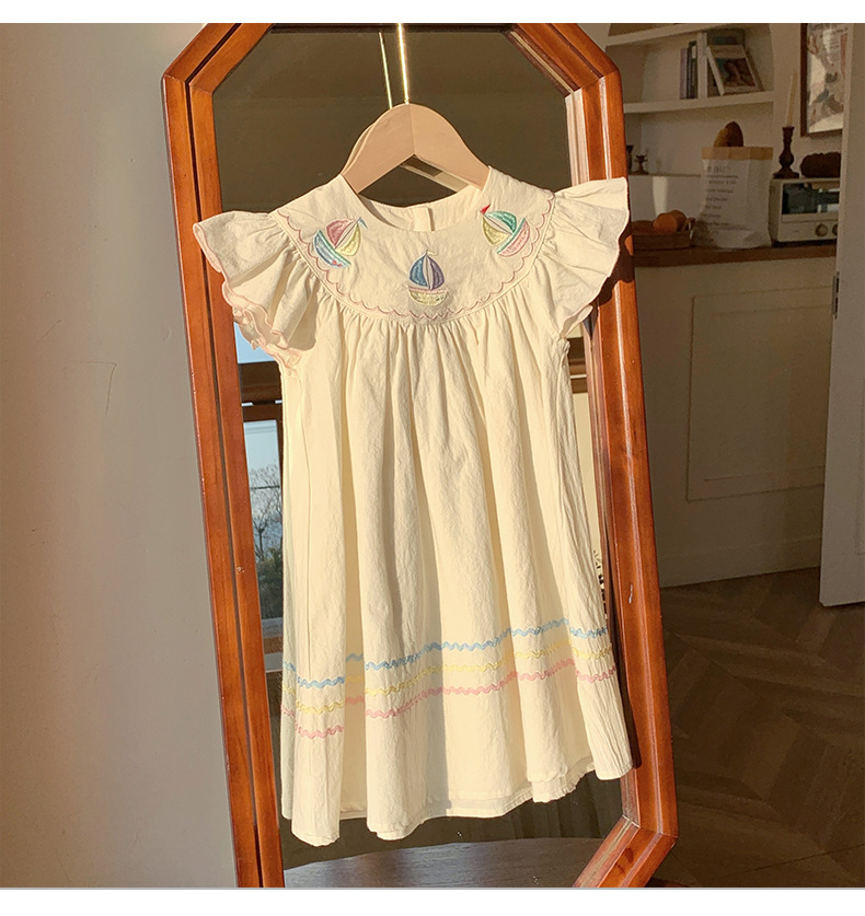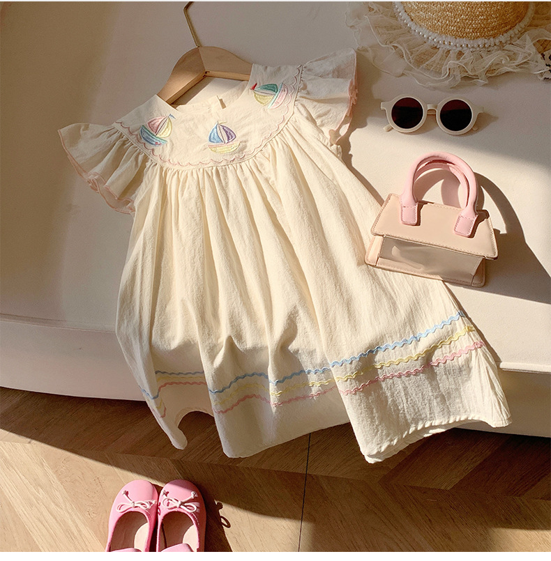해군 바람 무지개 항해 자수 소녀 원피스 2025 여름 새로운 비행 소매 외국 스타일 어린이 치마 도매