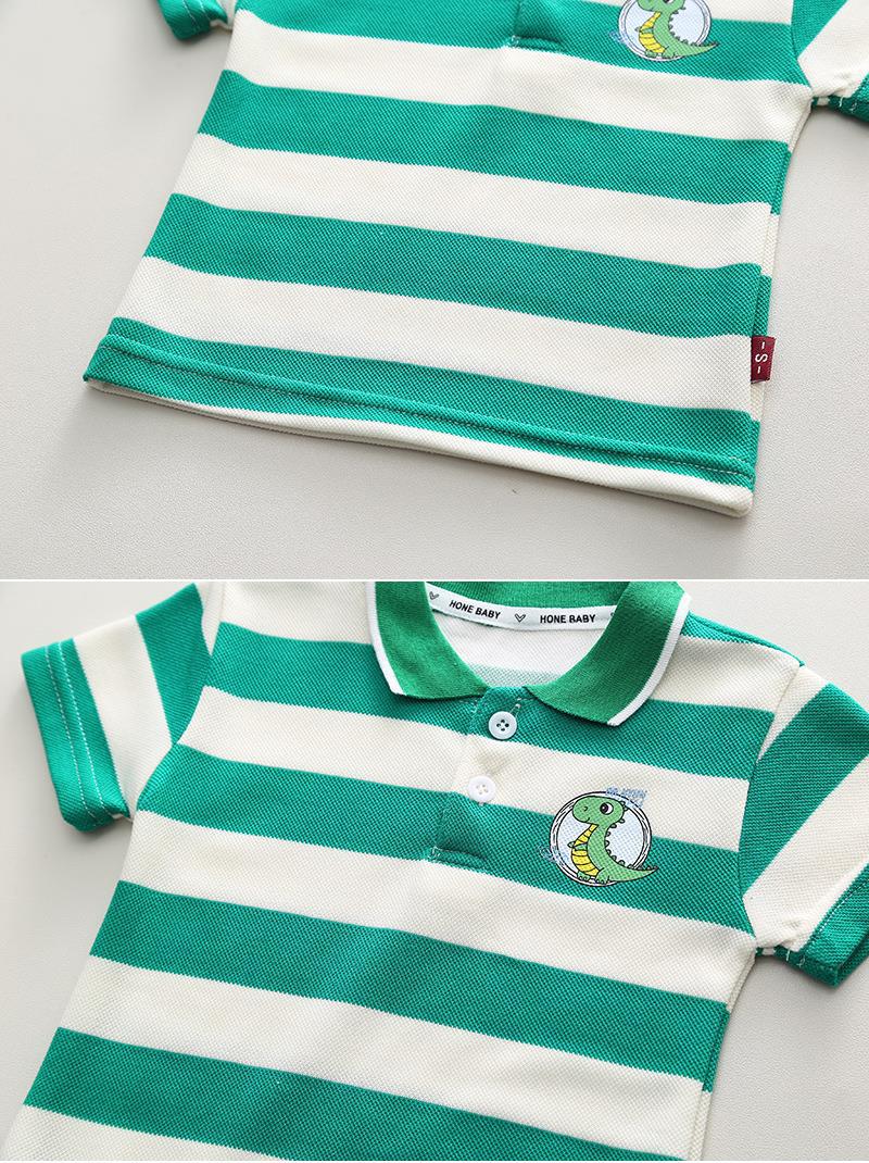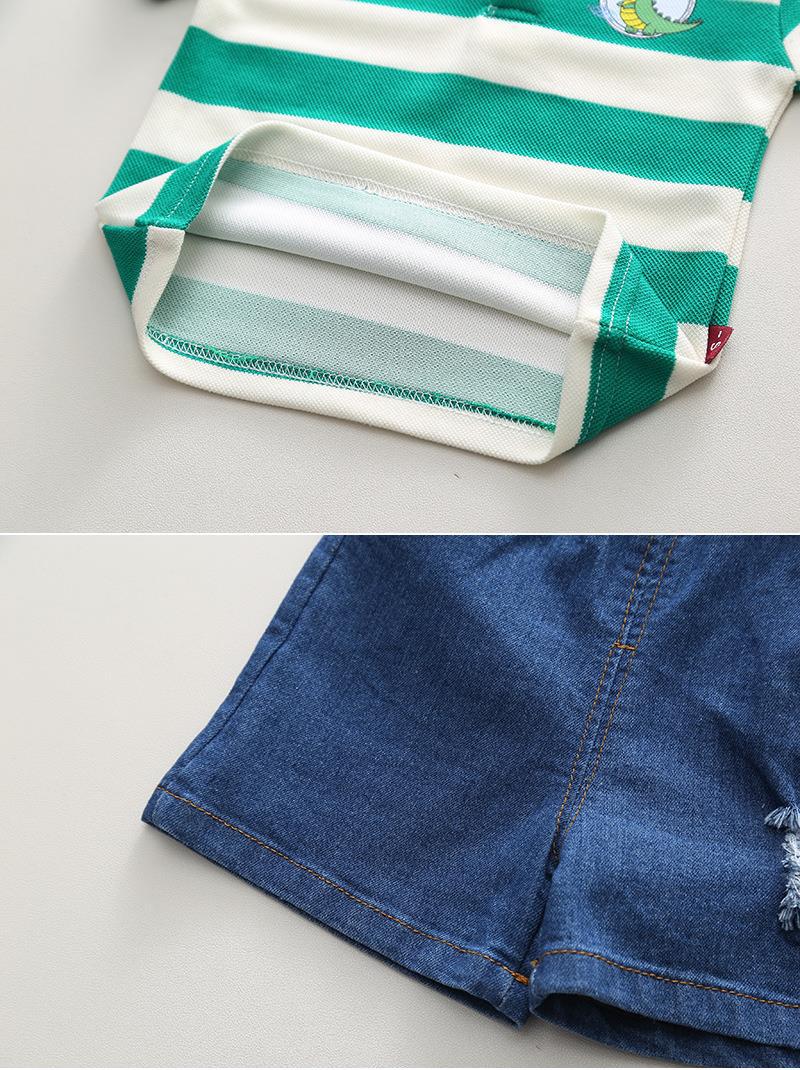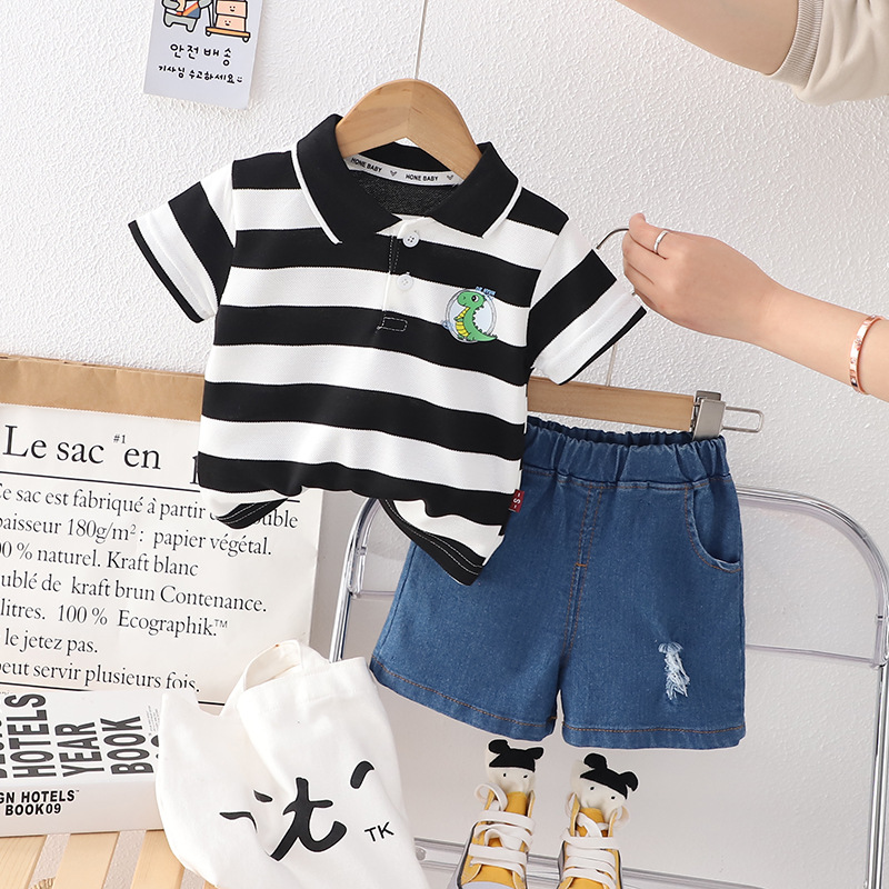 스트라이프 반팔 티셔츠 아동복 여름 소년 의류 트렌디 한 여름 폴로 셔츠 구멍 데님 반바지 2 피스 세트 도매스토어 가기