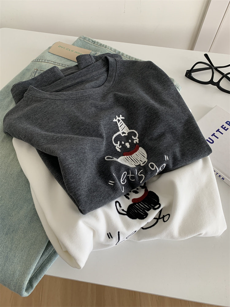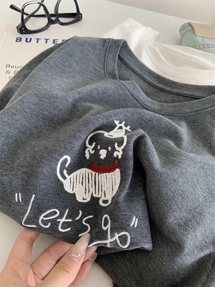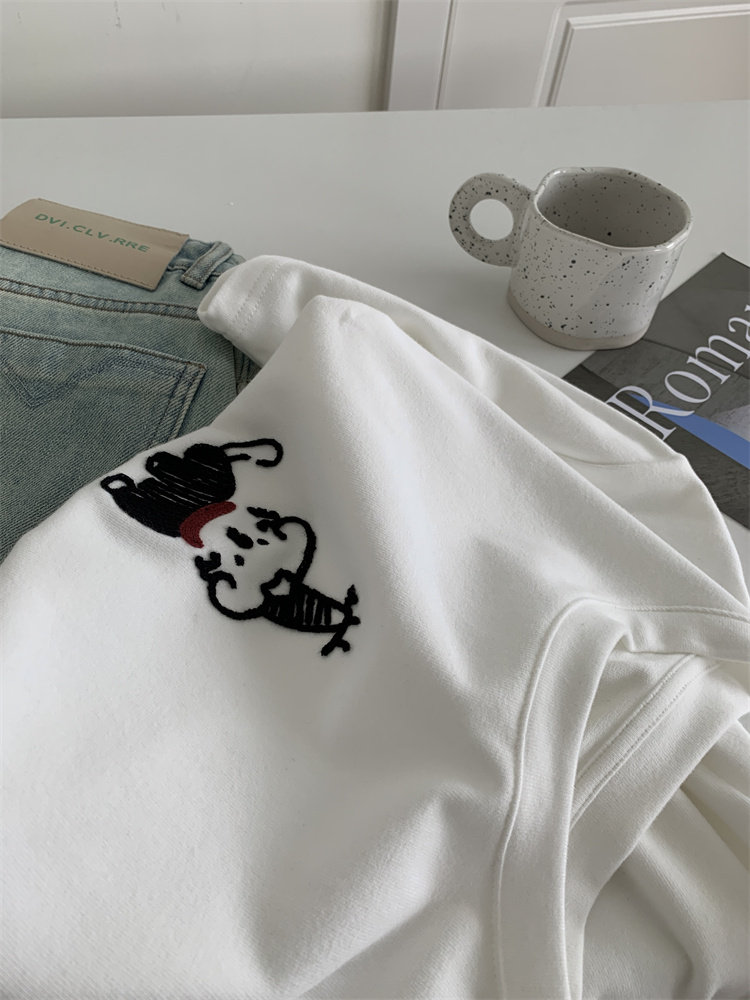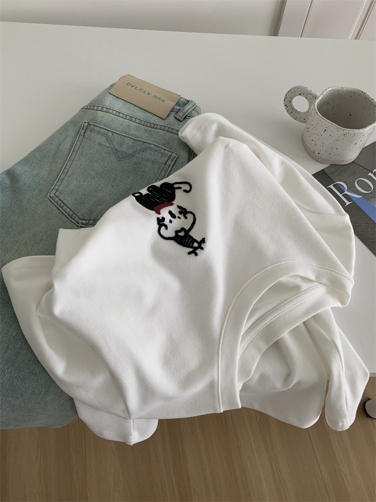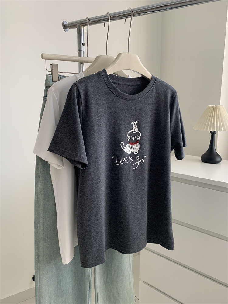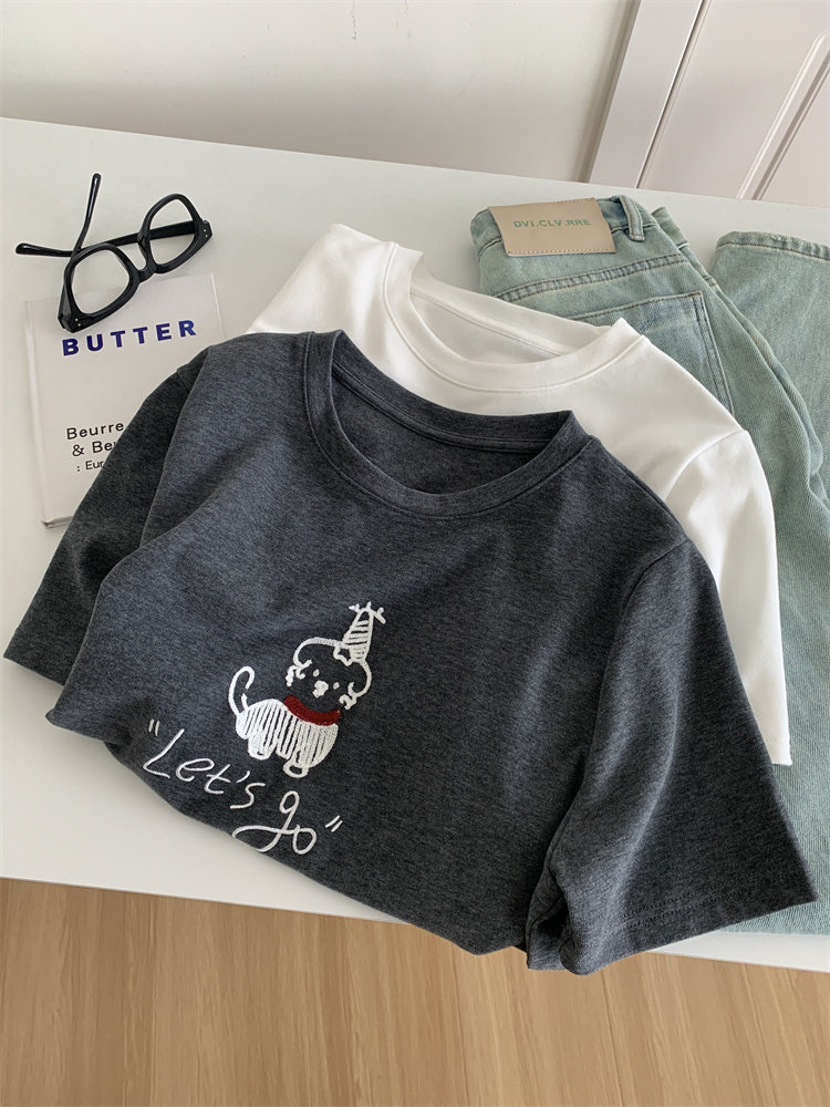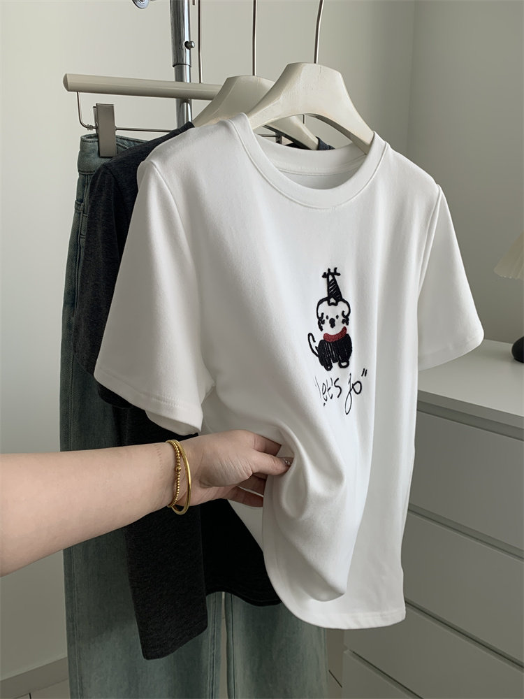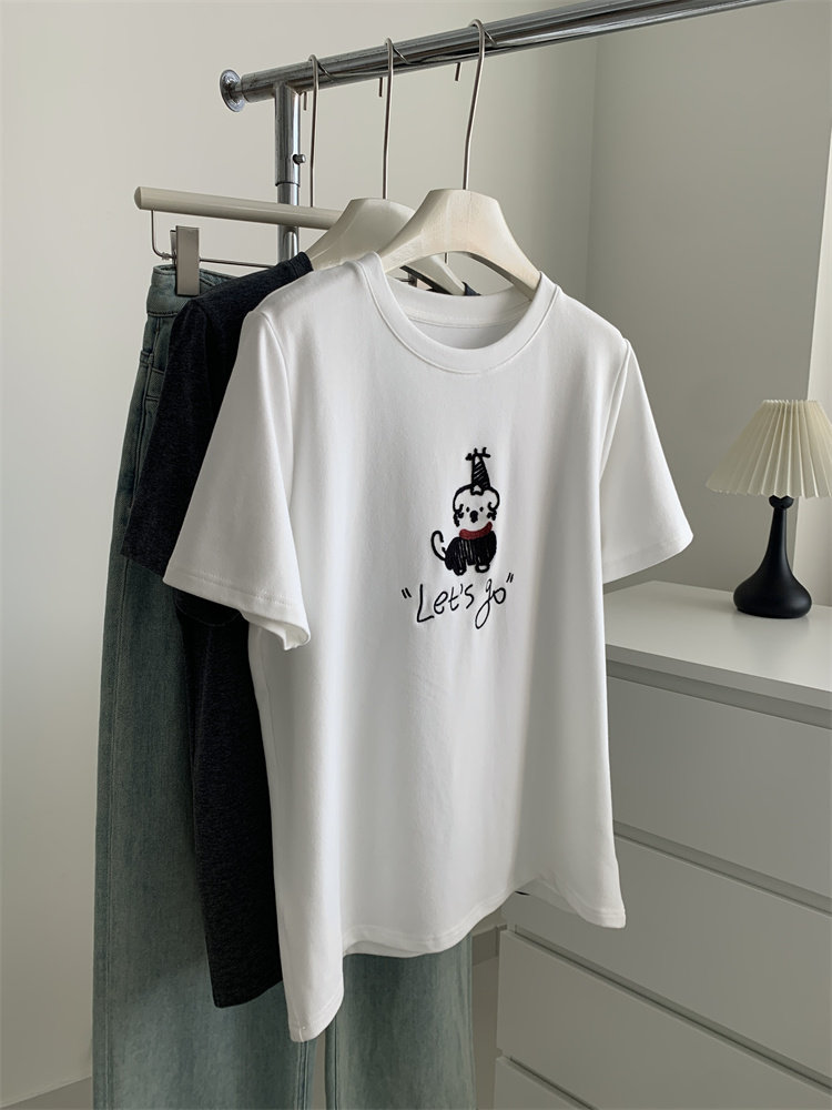 봄과 여름 새로운 캐주얼 만화 개 자수 샌딩 올 매치 라운드 넥 매일 통근 느슨한 반팔 티셔츠 여성 25