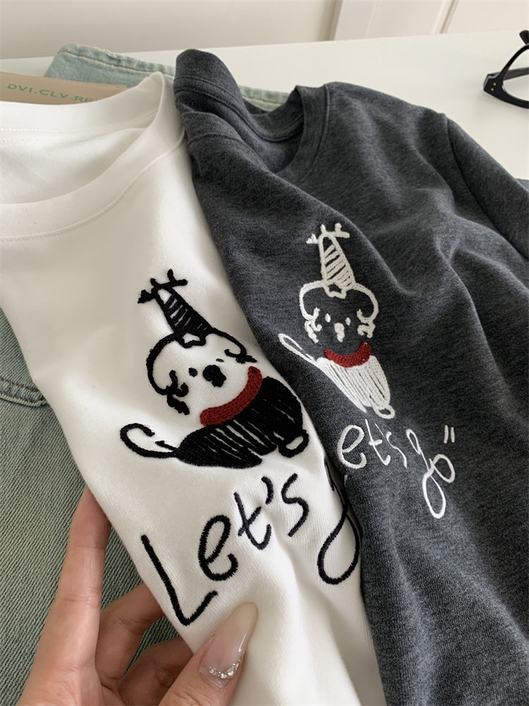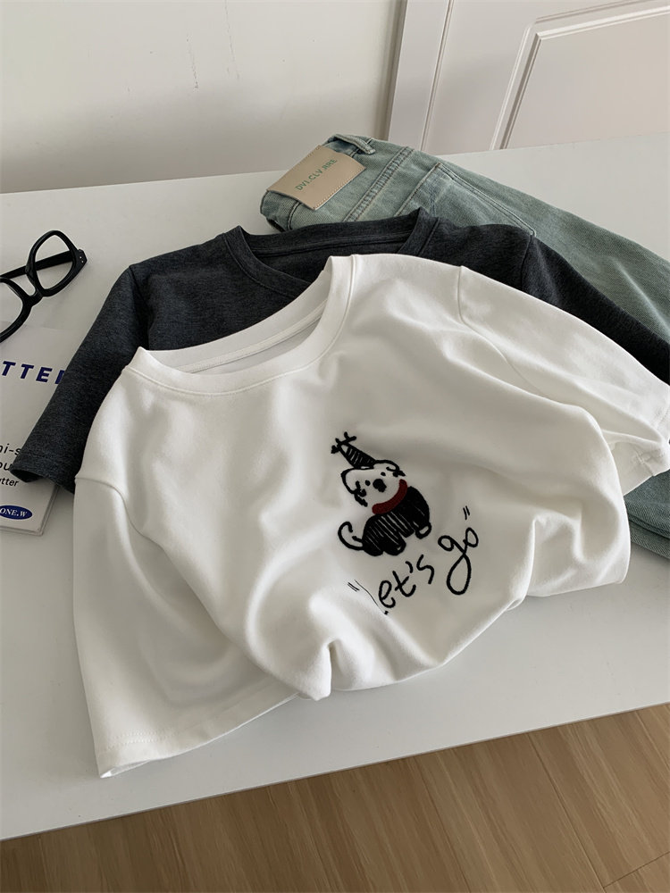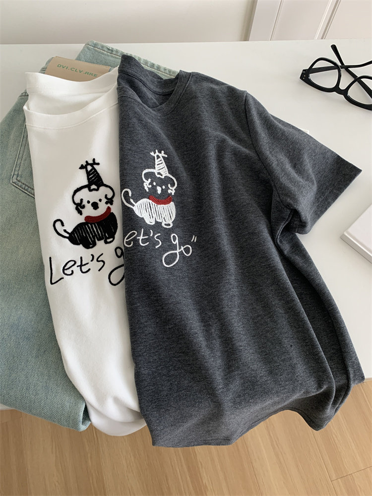 봄과 여름 새로운 캐주얼 만화 개 자수 샌딩 올 매치 라운드 넥 매일 통근 느슨한 반팔 티셔츠 여성 25스토어 가기