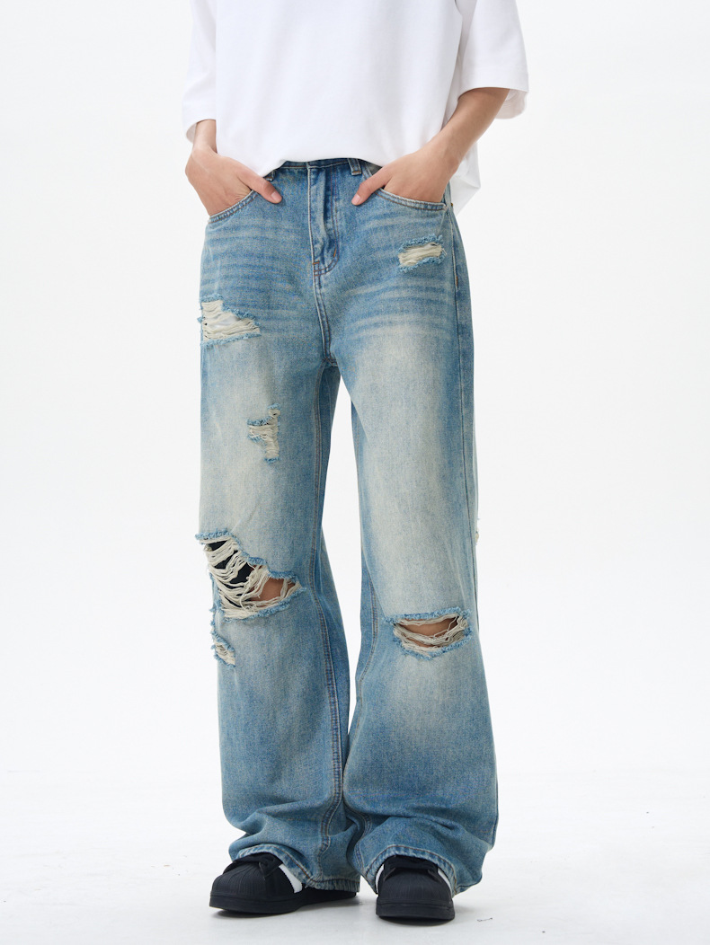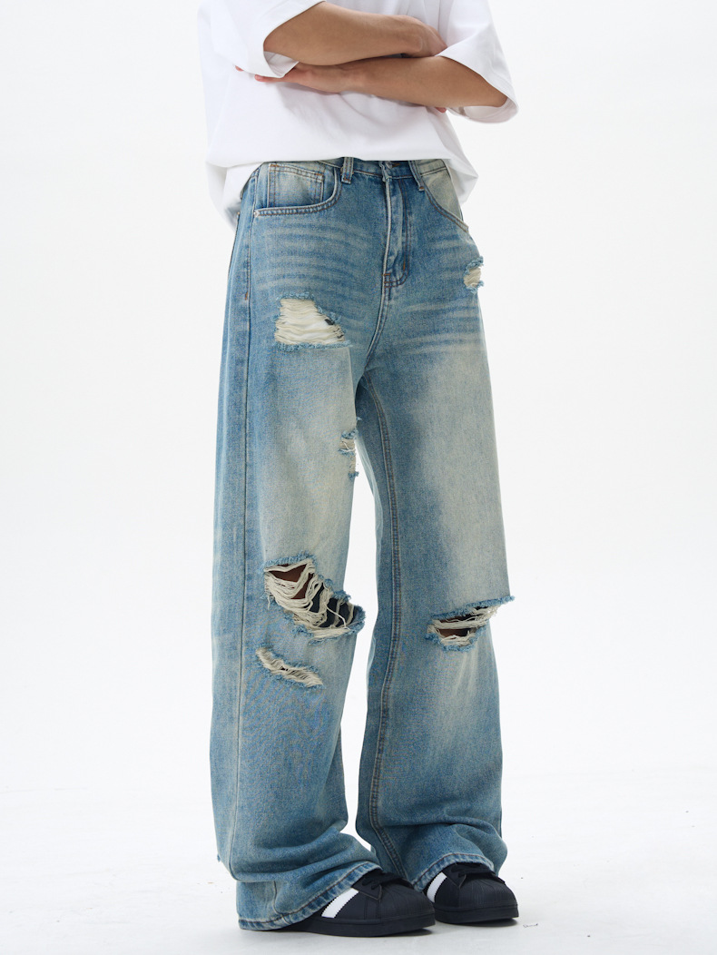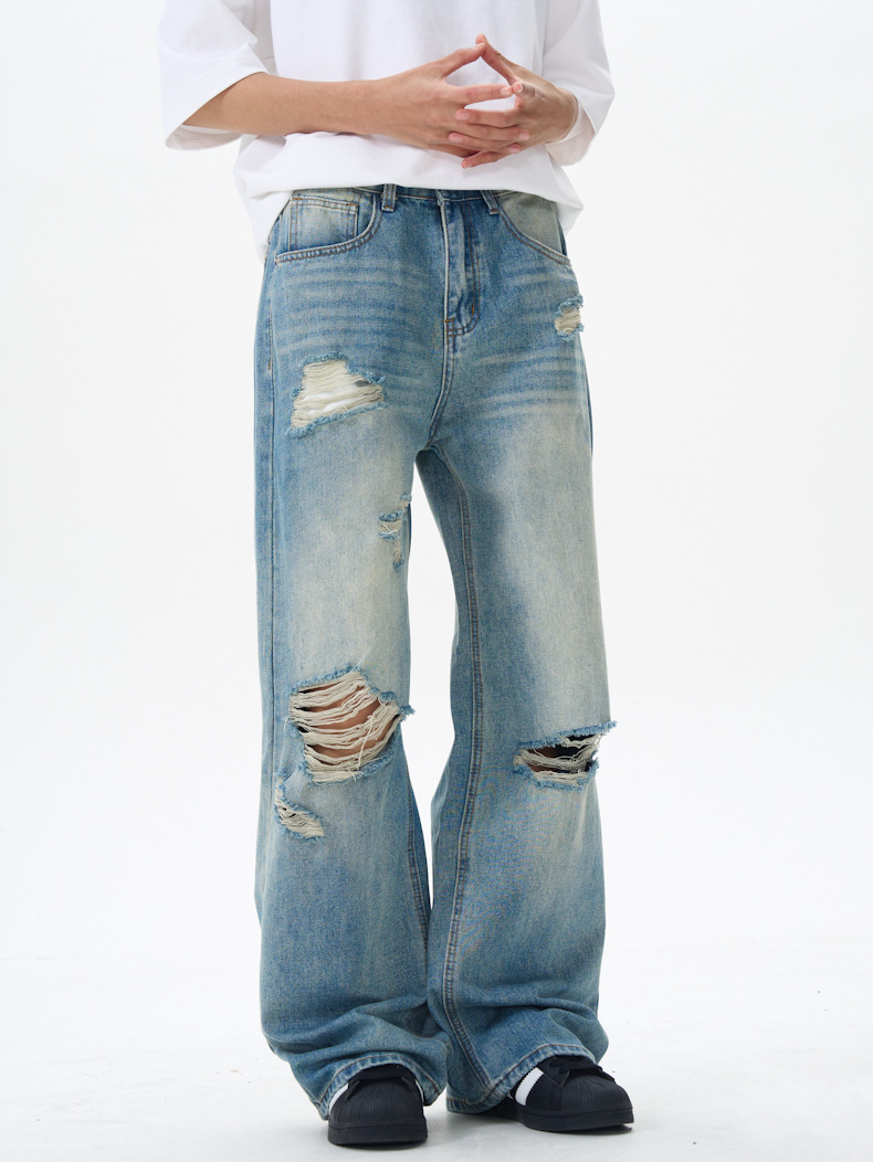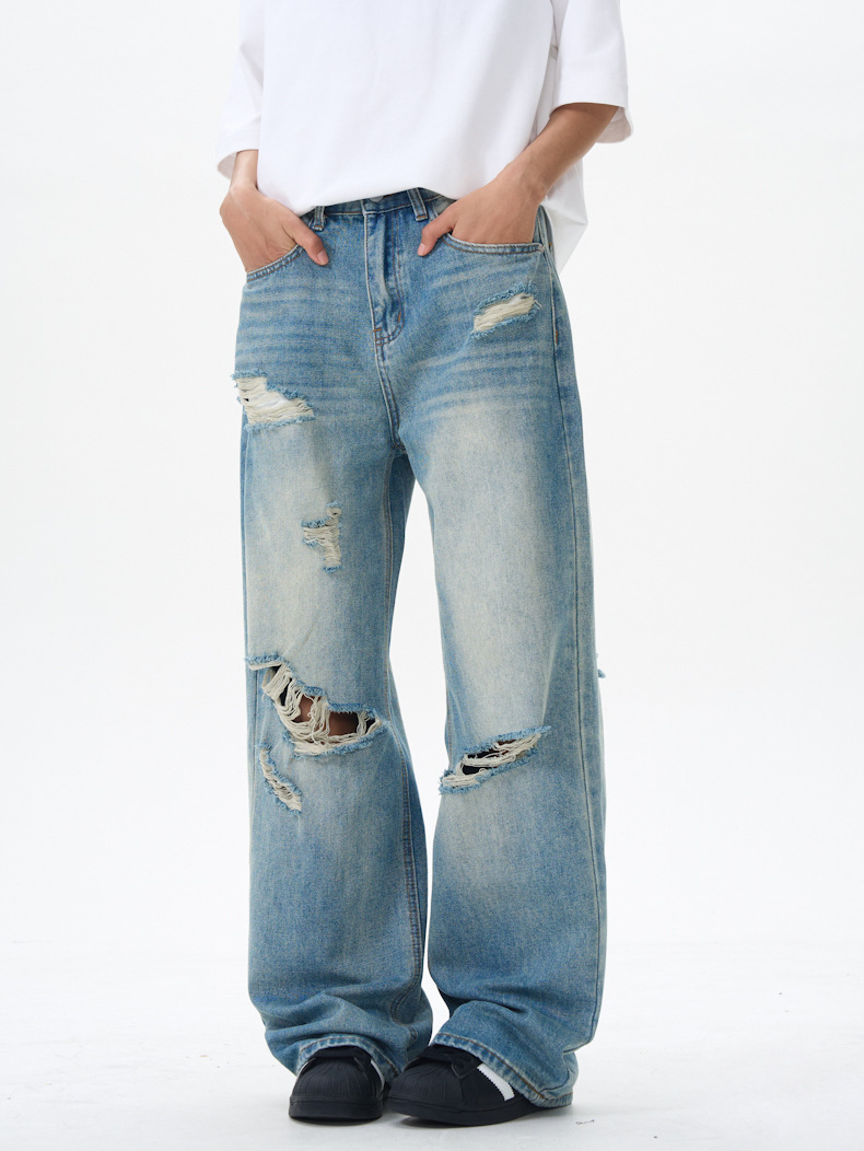 패션 스트리트 트렌디 리핑 청바지 남성 청바지 # 고급 청소년 미국 스트레이트 바지스토어 가기