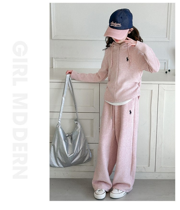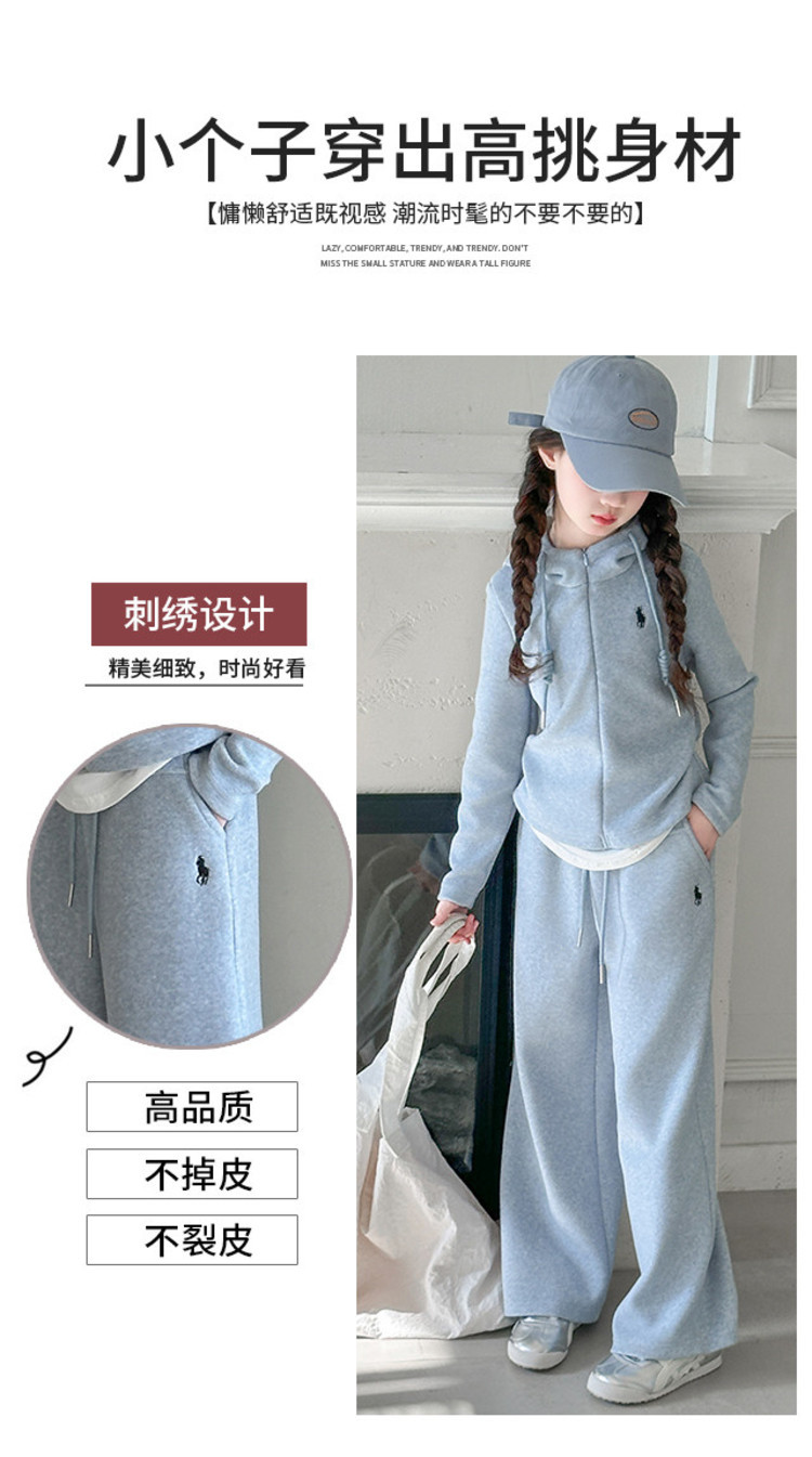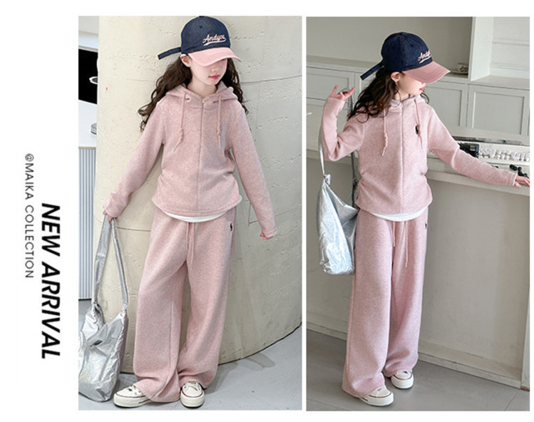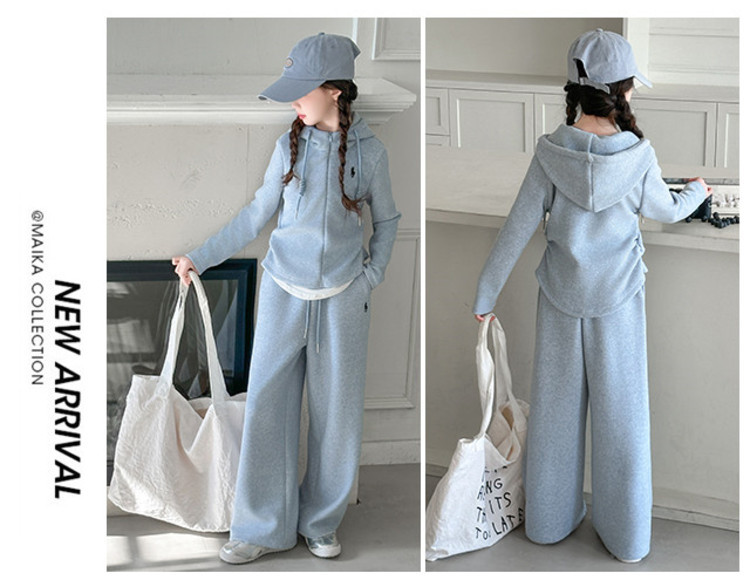 한국 소녀 외국 스타일 후드 조끼 세트 2025 봄과 가을 소녀 가짜 두 개의 넓은 다리 바지 스포츠 세트 조수
