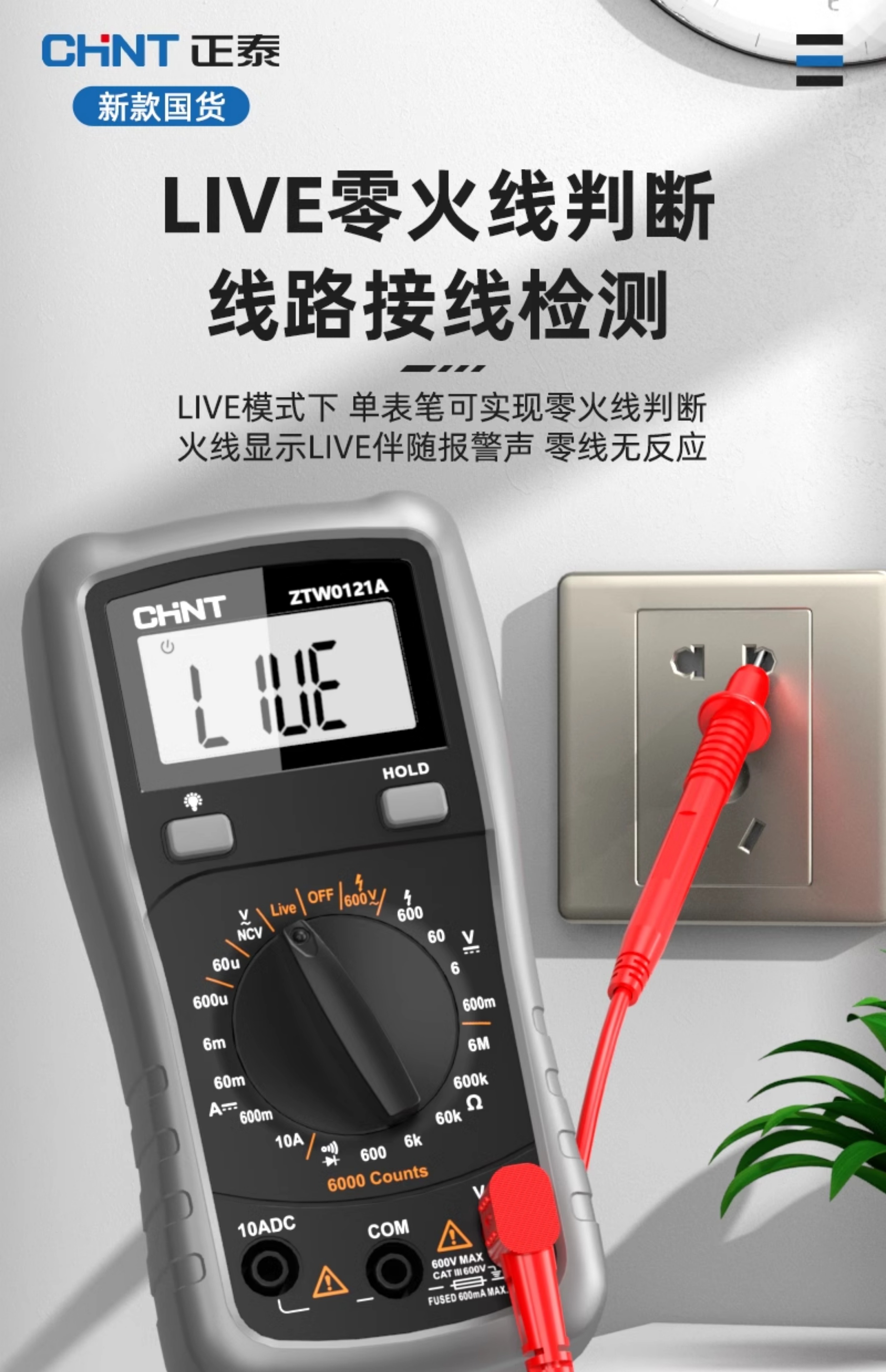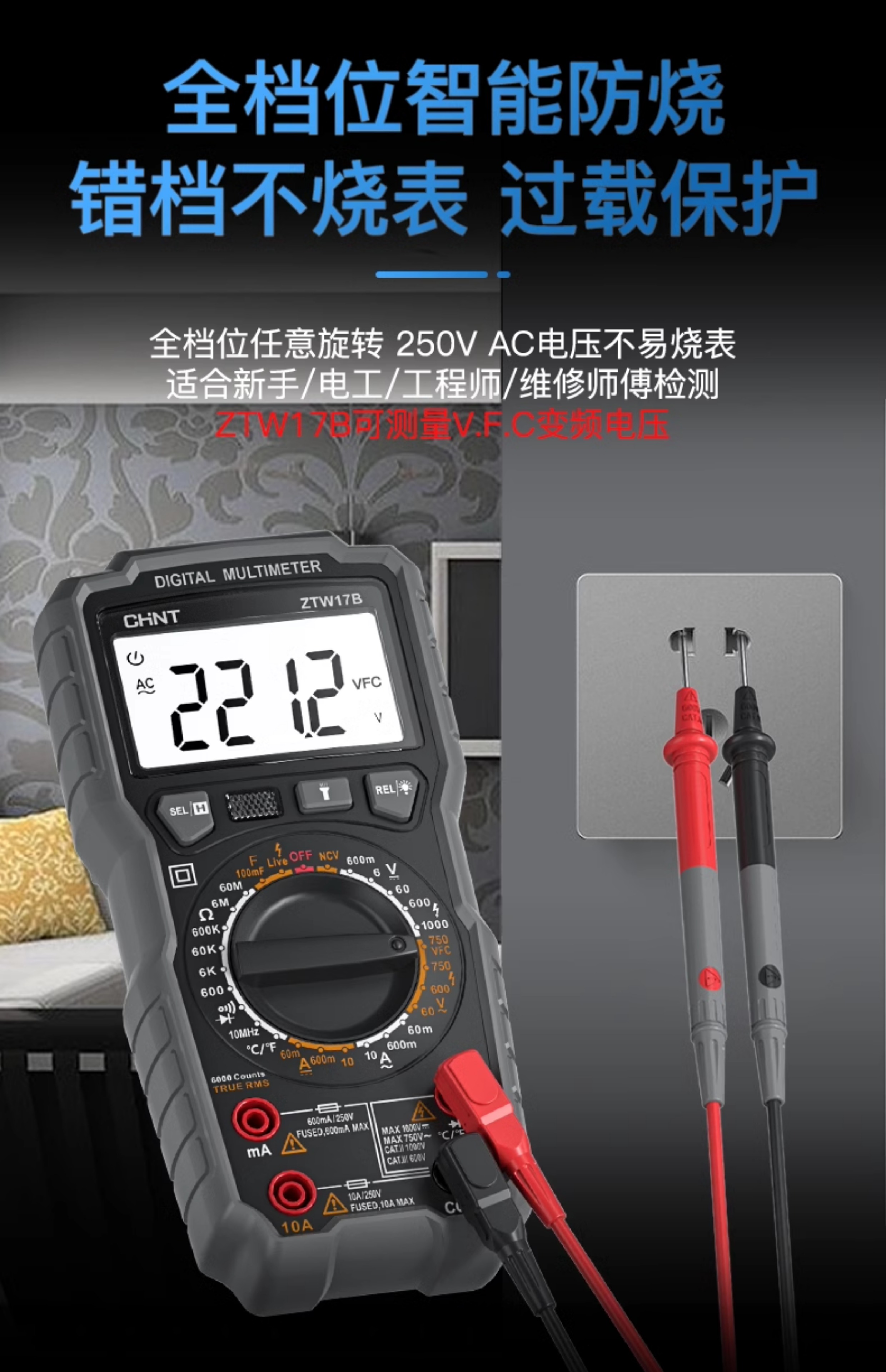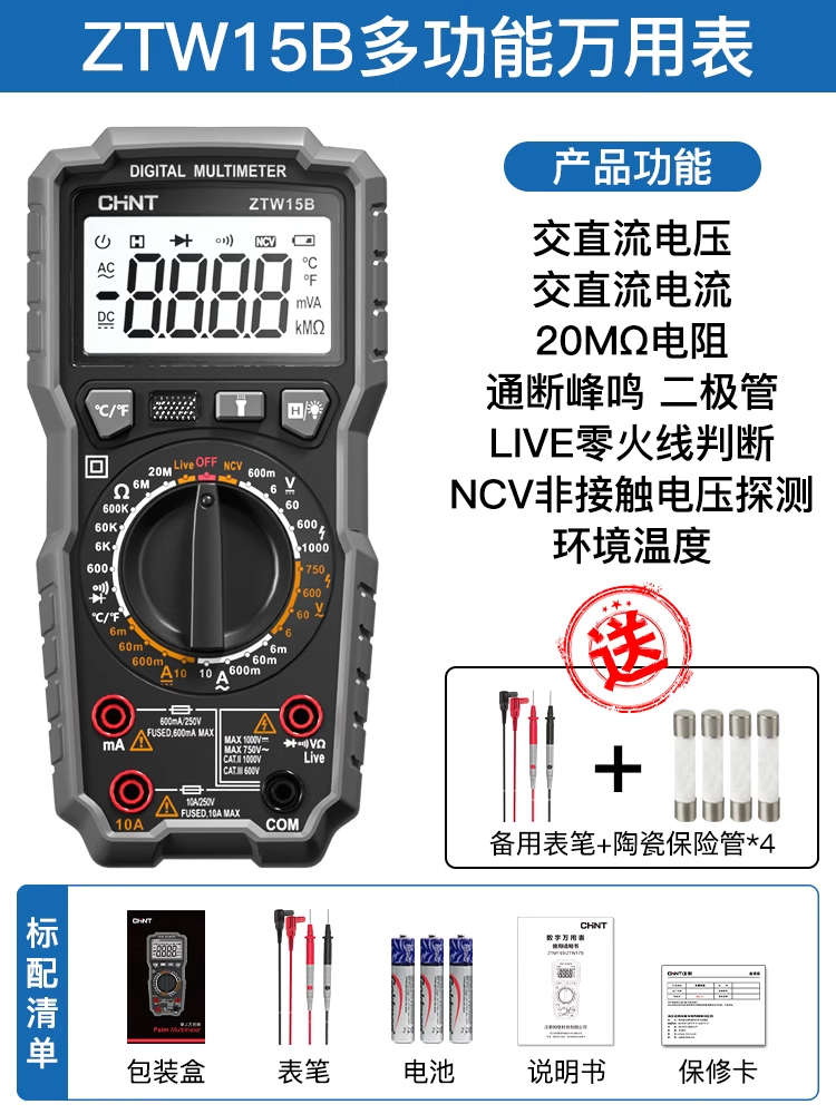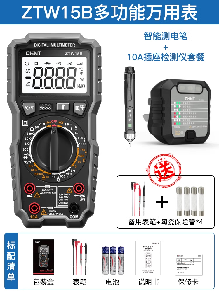 • ZTW15B [전기 모델] 지능형 화상 방지/제로 라이브 와이어 판단(테스트 리드 + 세라믹 보험 포함)