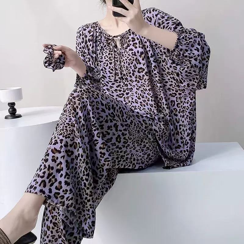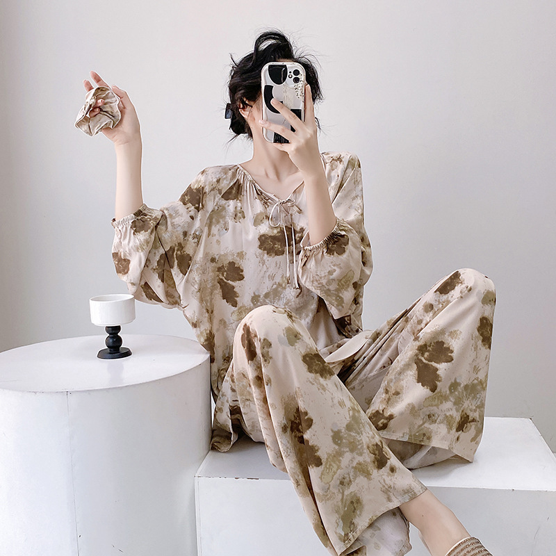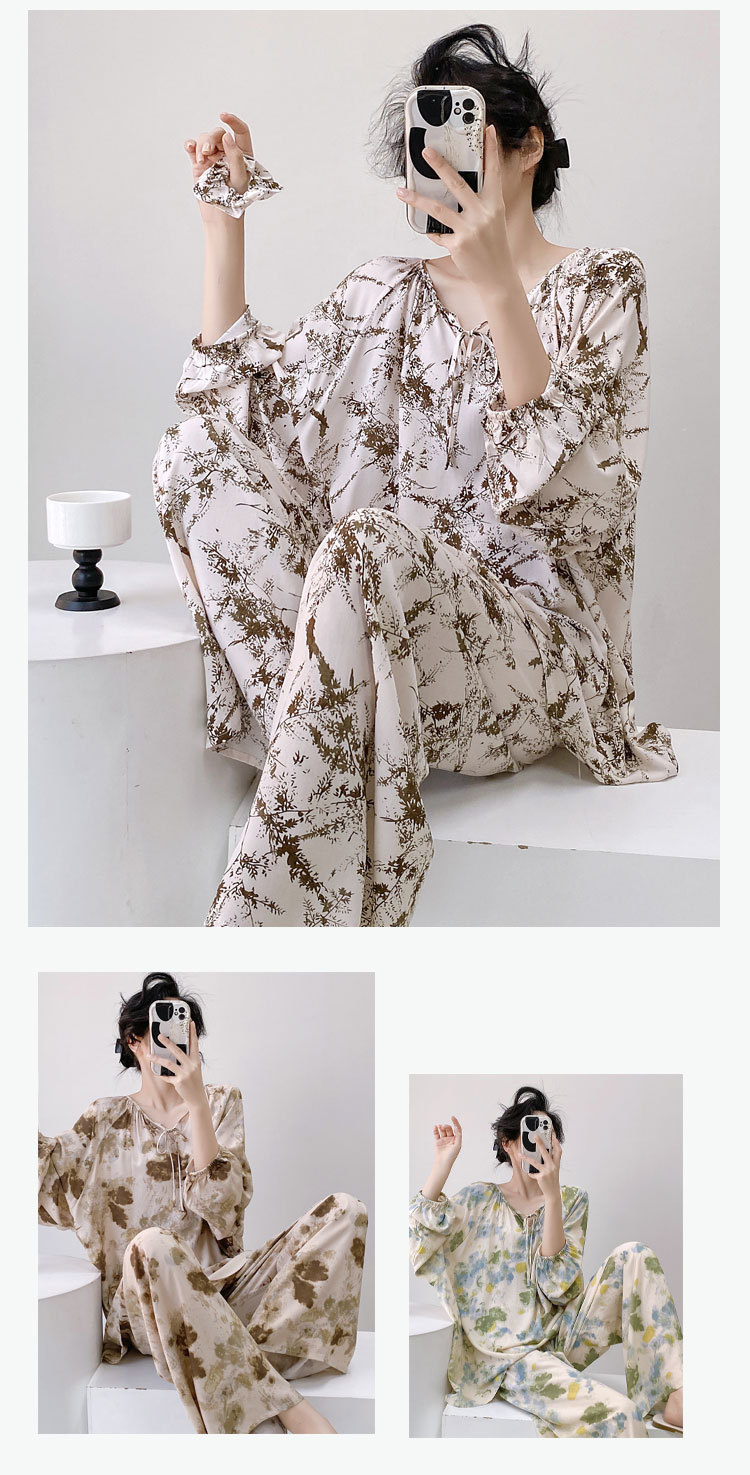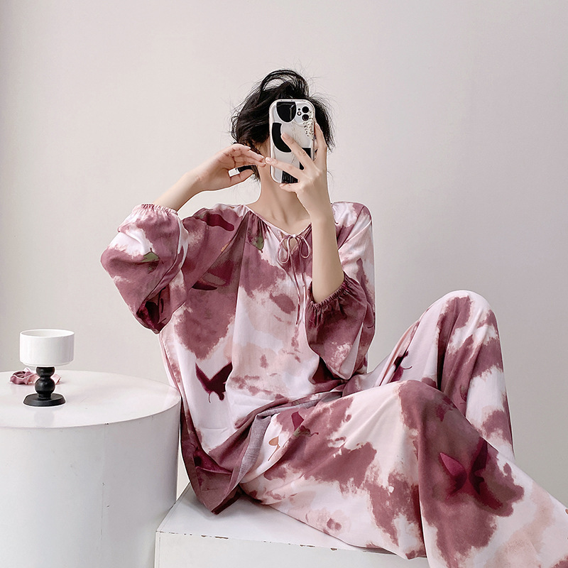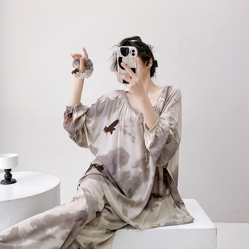 면 실크 파자마 여성의 봄과 가을 얇은 긴팔 플러스 사이즈 사이버 인기 세트 여름 새로운 도착 레이온 인쇄 에어컨 홈 의류스토어 가기