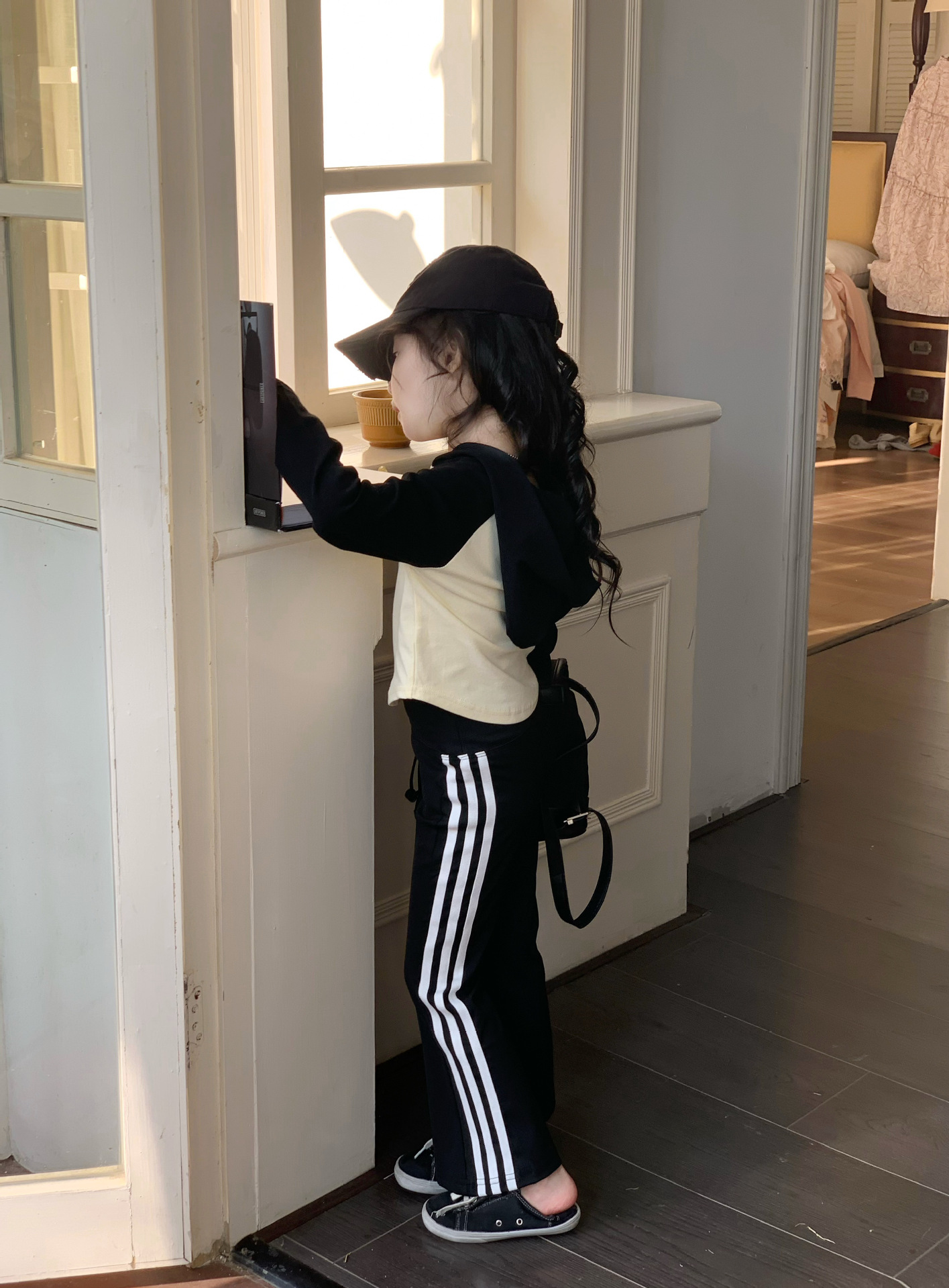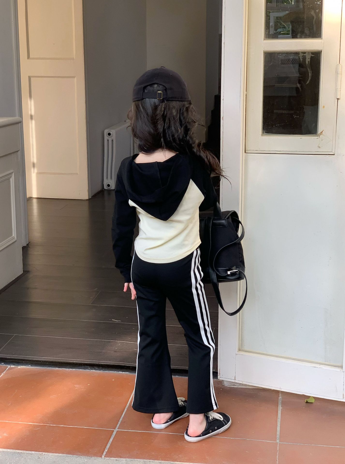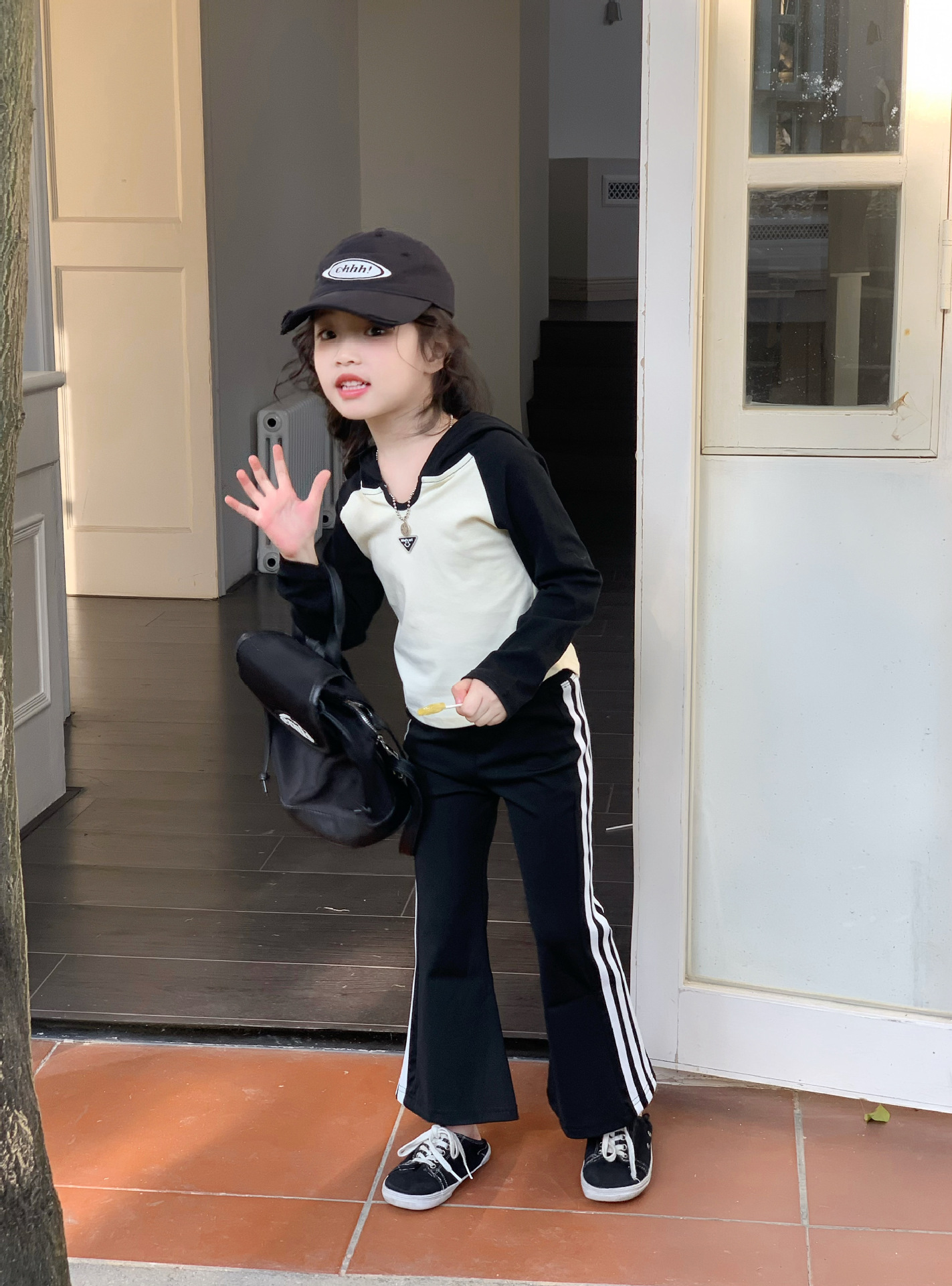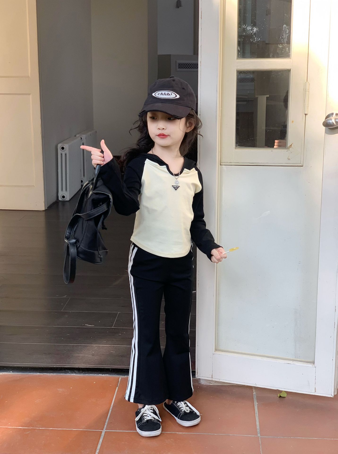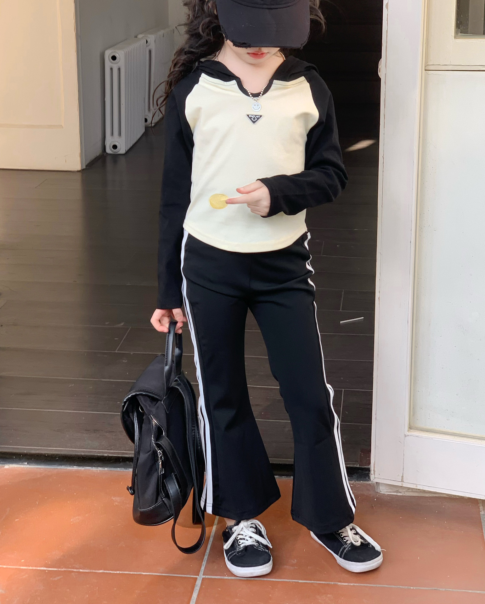 소녀 긴팔 티셔츠 어린이 봄 2025 새로운 스타일 서양식 후드 바토밍 셔츠 플래 바지 세트스토어 가기