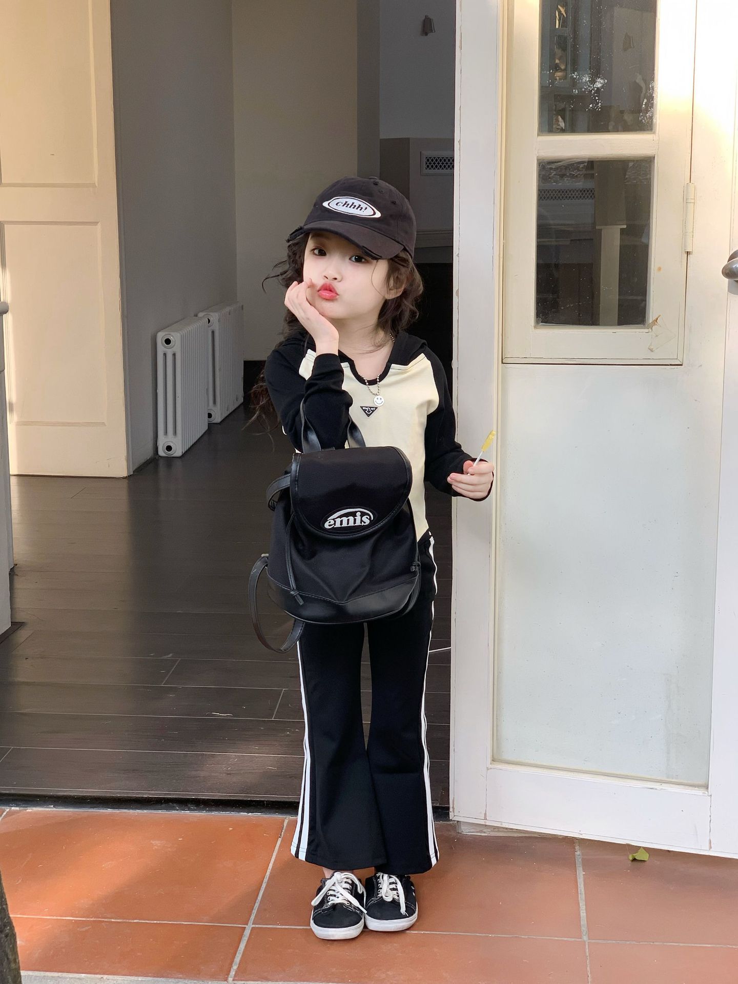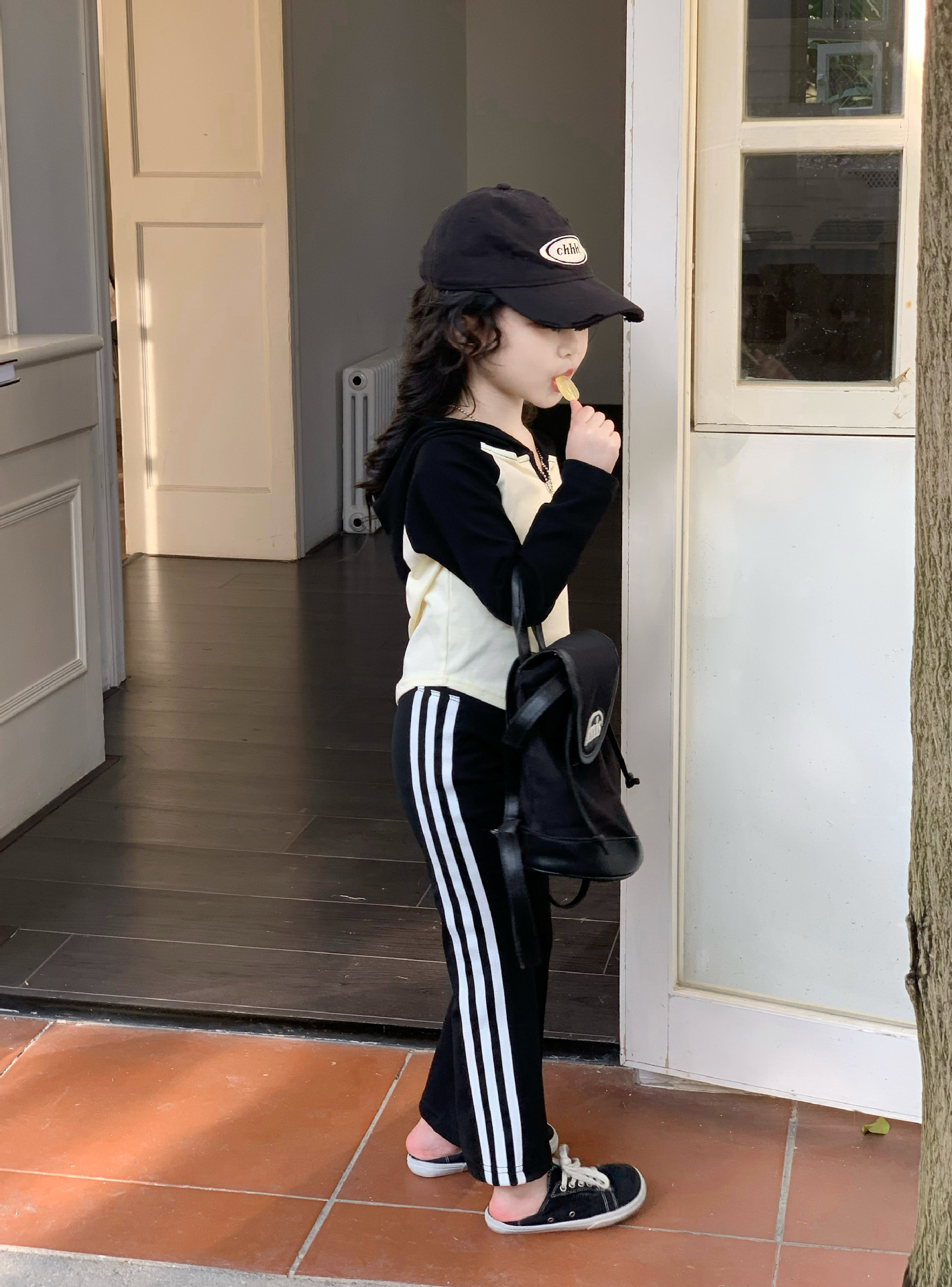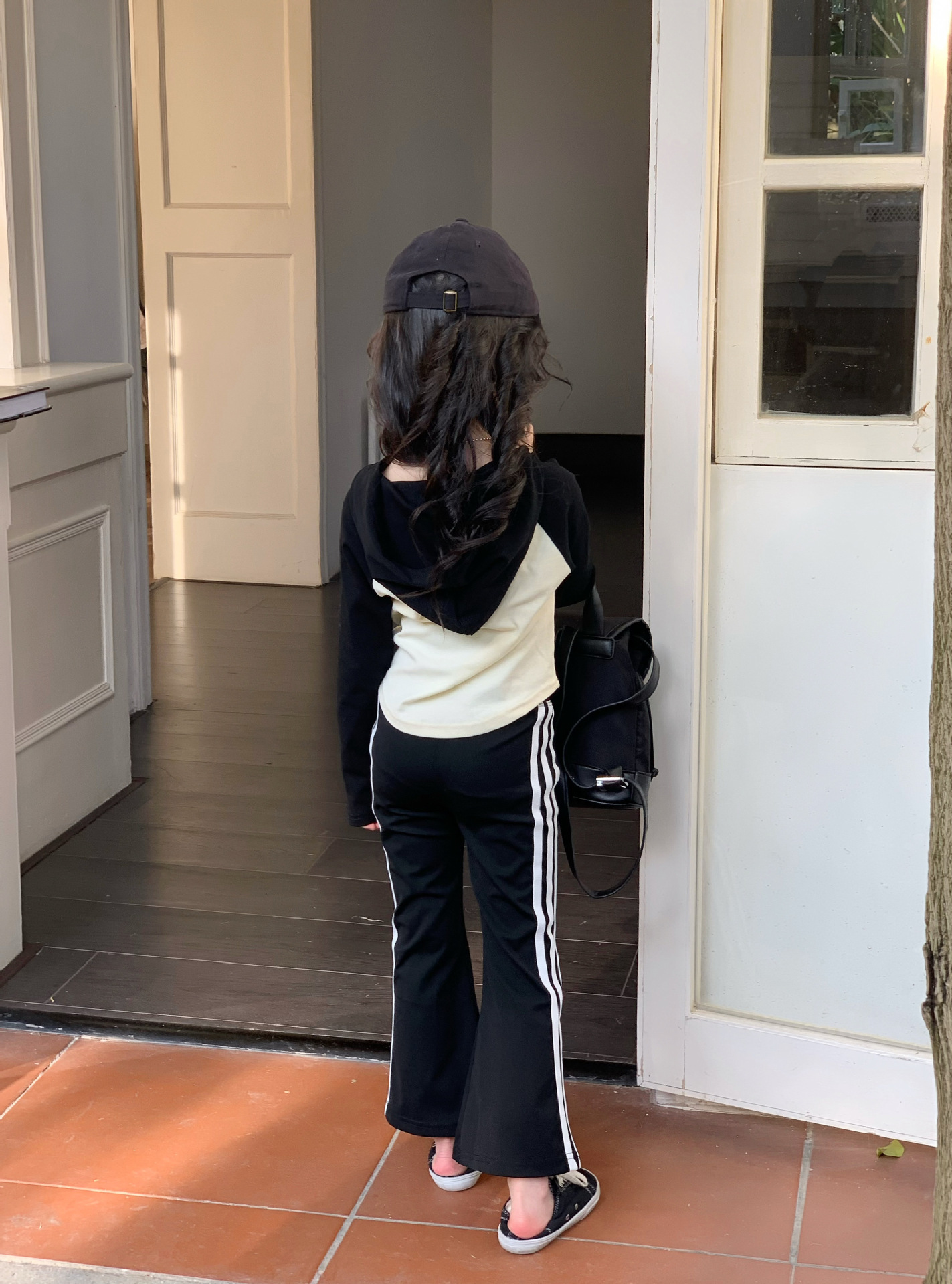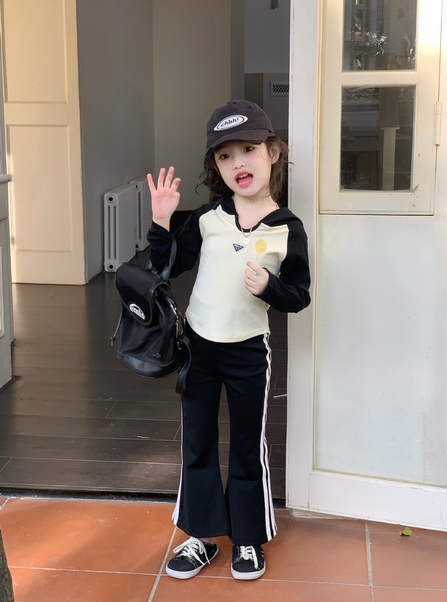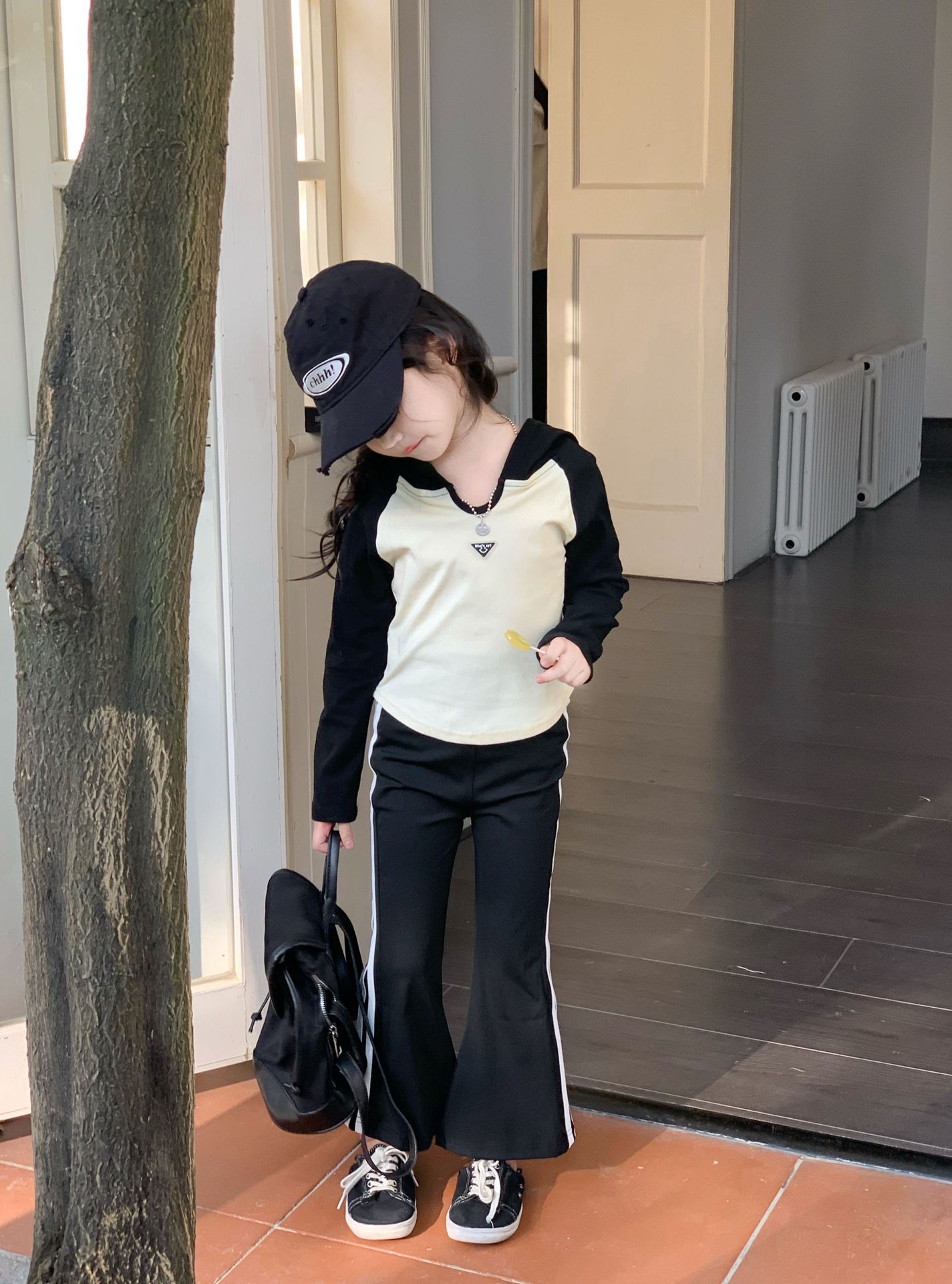소녀 긴팔 티셔츠 어린이 봄 2025 새로운 스타일 서양식 후드 바토밍 셔츠 플래 바지 세트스토어 가기