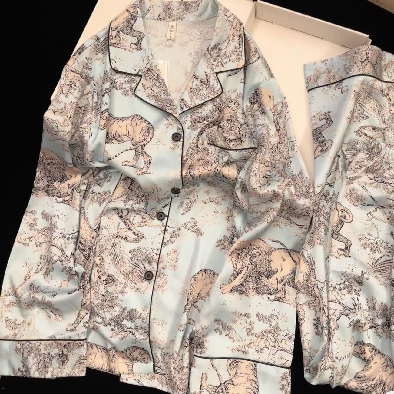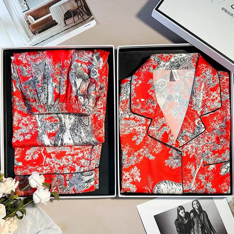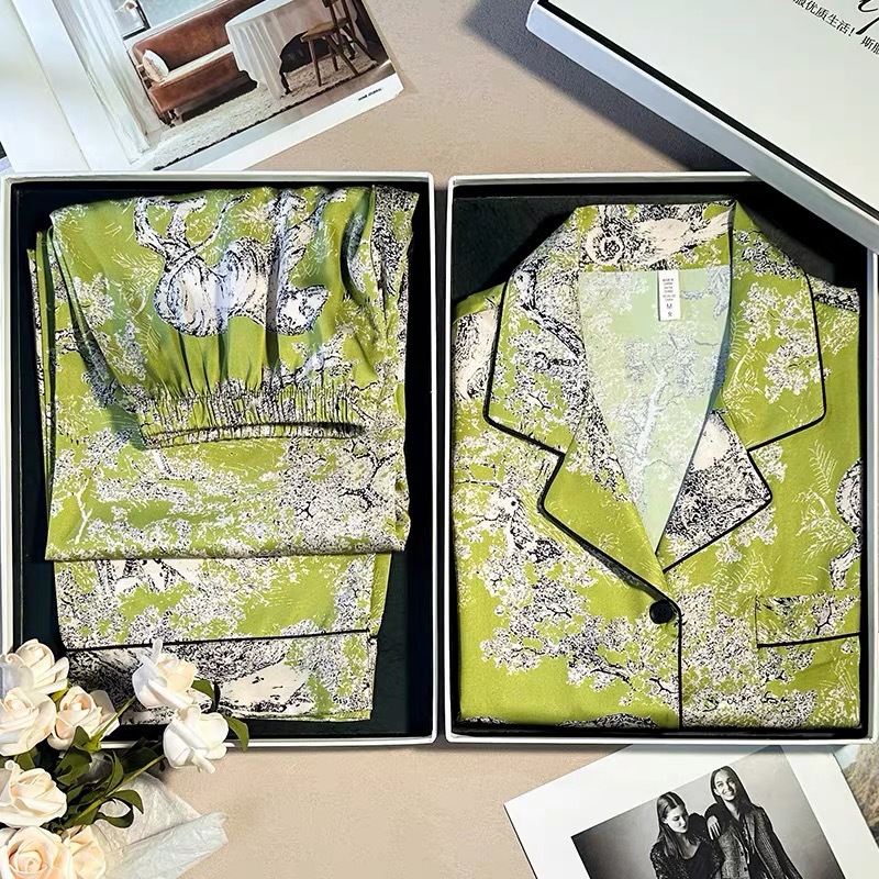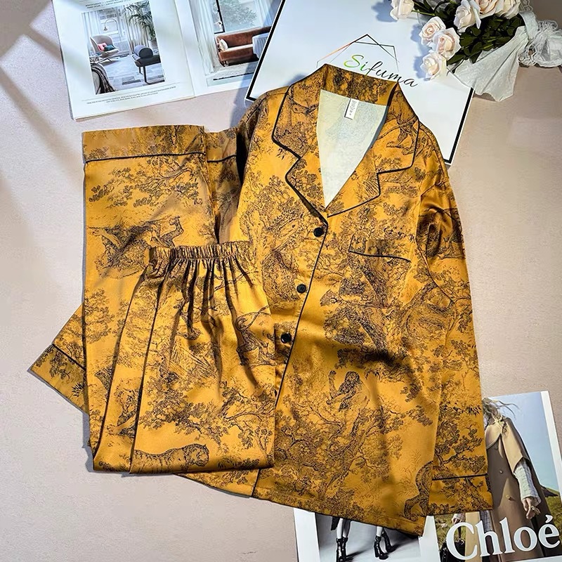 [동물 정글] 고급 아이스 실크 커플 파자마 여성 가을 겨울 긴 소매 바지 남성용 가벼운 럭셔리 인쇄 잠옷