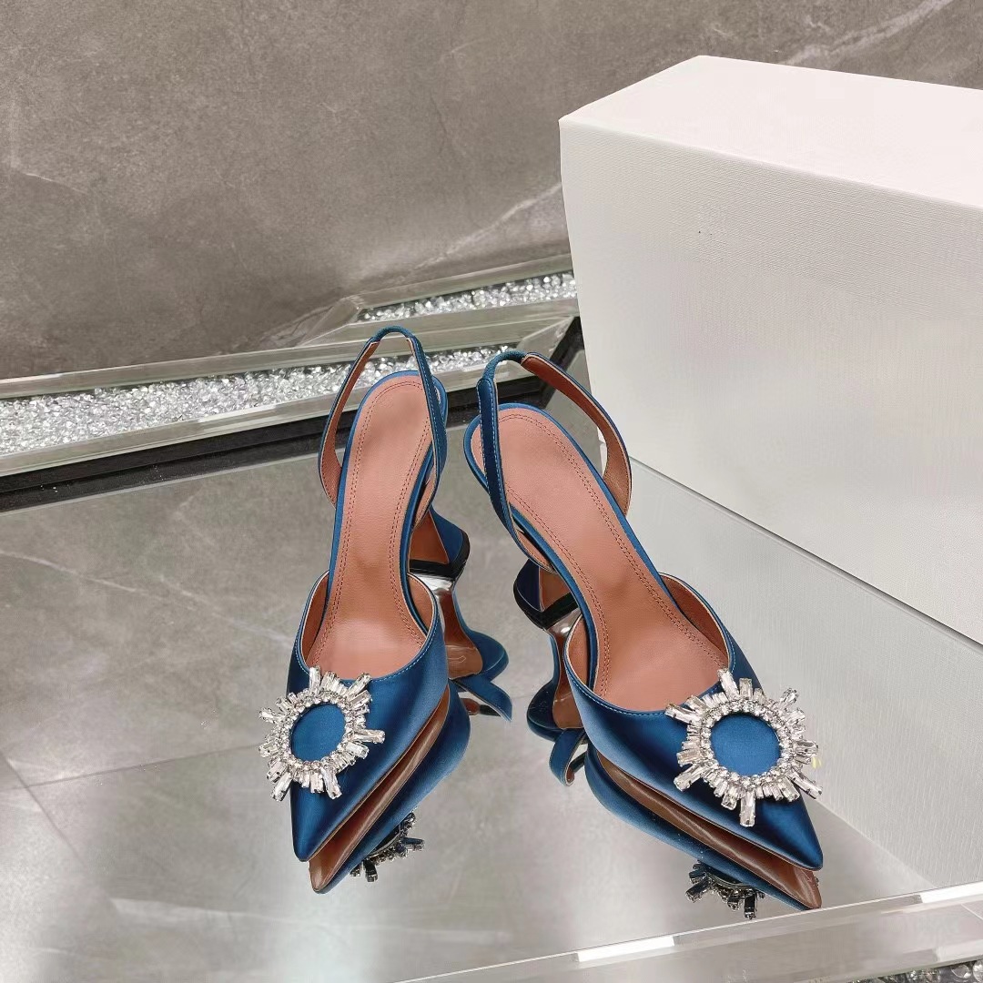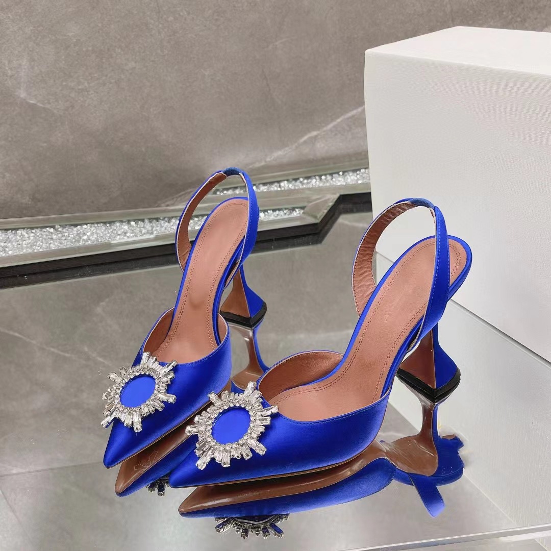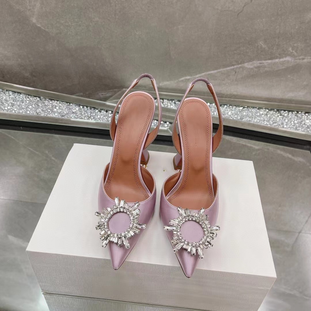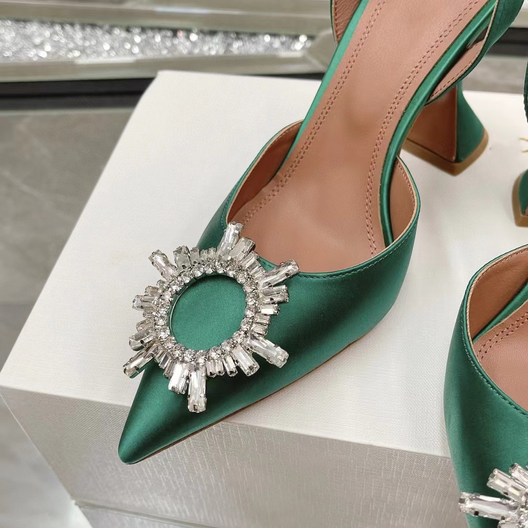 봄과 여름 2024 새로운 라인스톤 해바라기 버클 하이힐 슈즈 여성용 말굽 힐 실크 새틴 트렌디 샌들스토어 가기