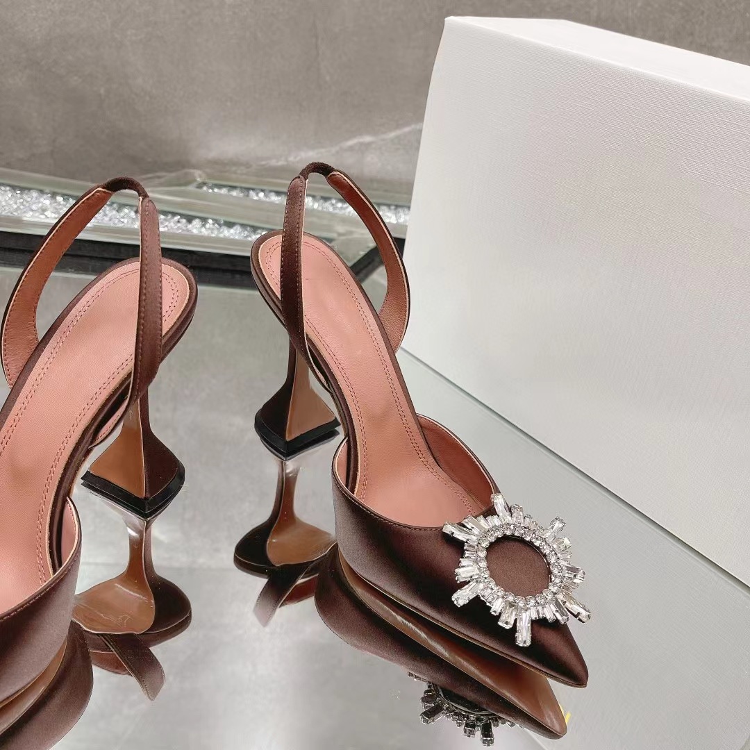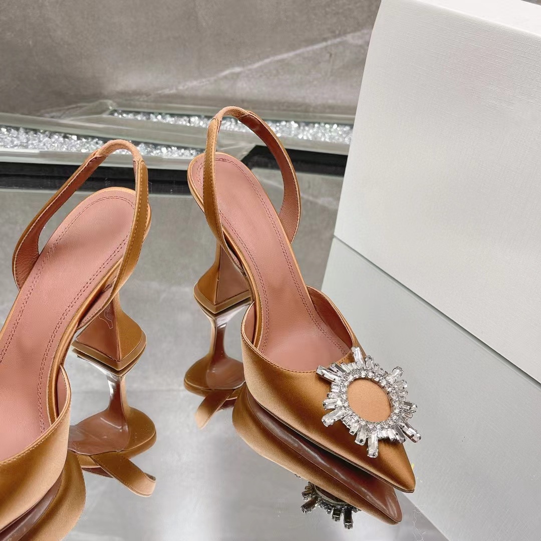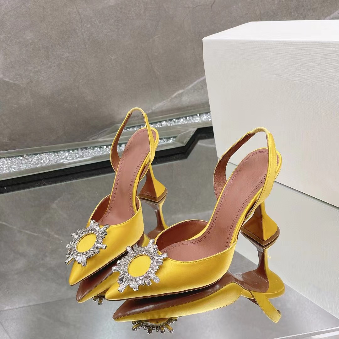 봄과 여름 2024 새로운 라인스톤 해바라기 버클 하이힐 슈즈 여성용 말굽 힐 실크 새틴 트렌디 샌들