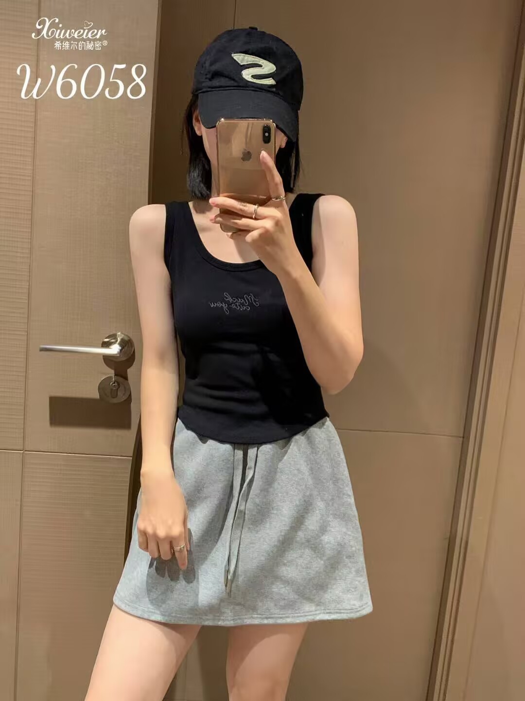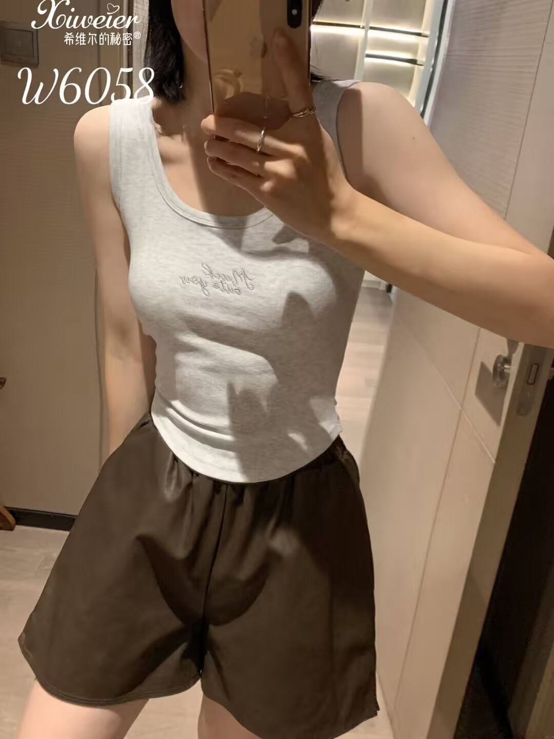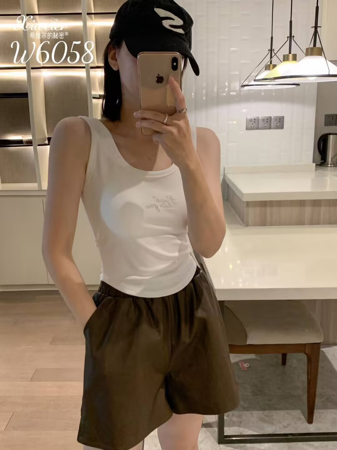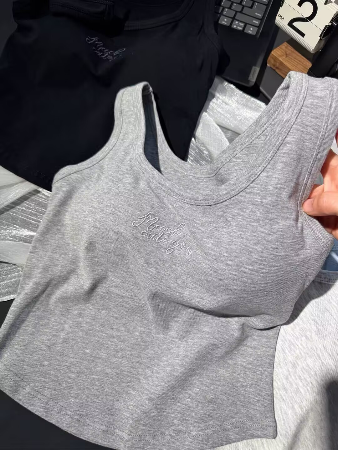 새로운 편지 자수 퓨어 코튼 와이드 숄더 카미솔 조끼 여자 가슴 패드 원피스 컵 아름다운 뒷면 외신베이스 탑 여성스토어 가기