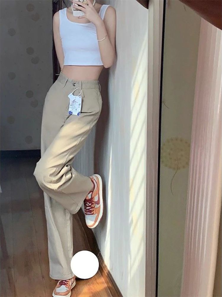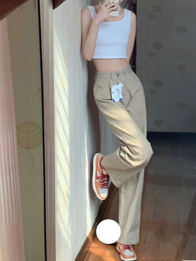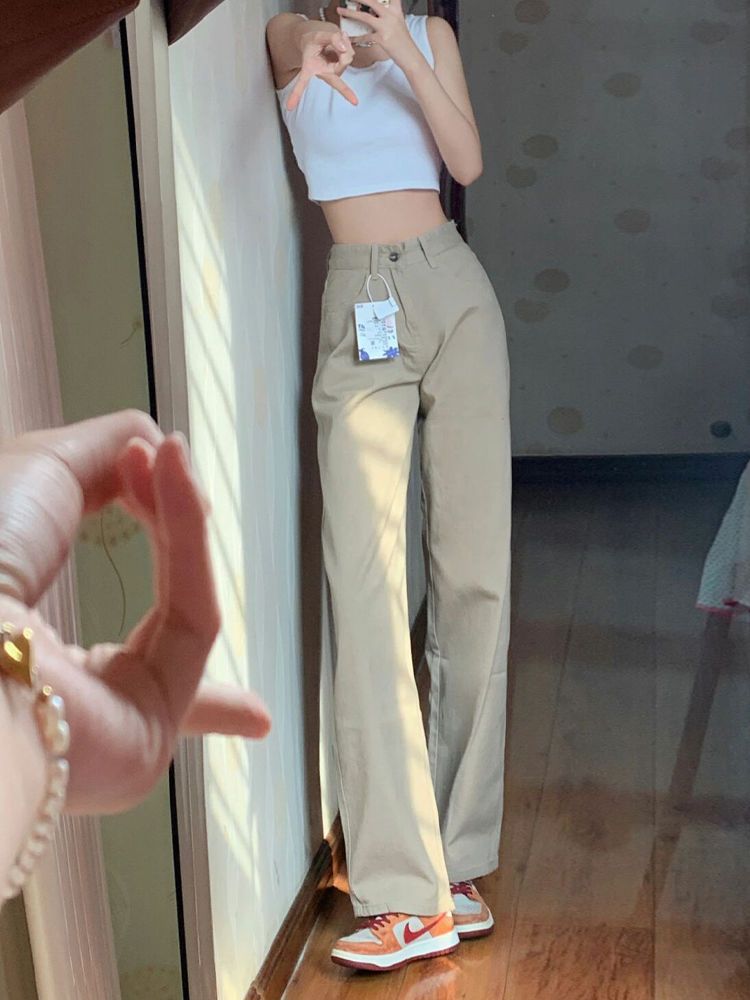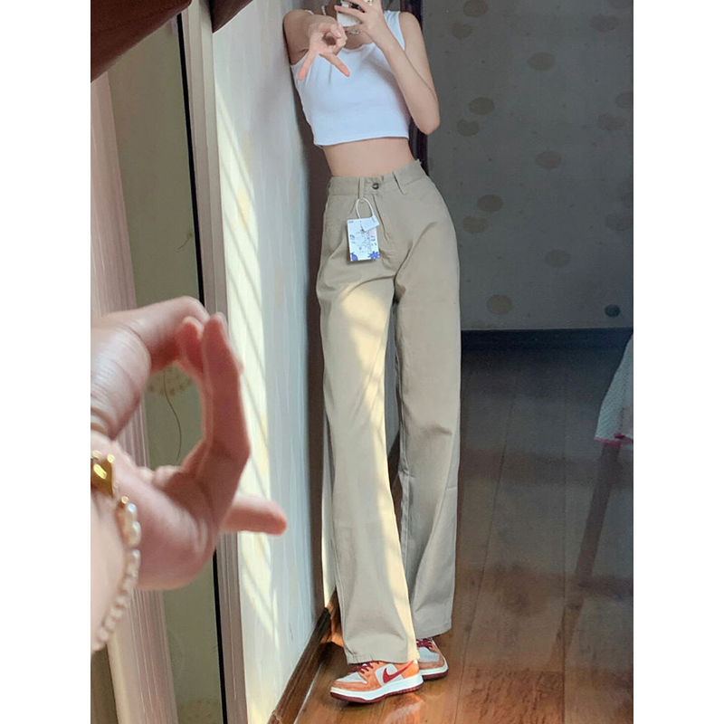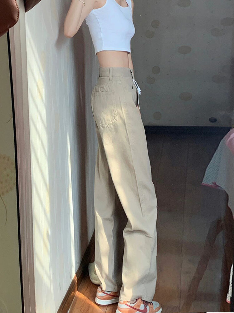 카키 좁은 직선 청바지 여자 봄 새로운 높은 허리 느슨한 넓은 다리 슬리밍 모든 경기 유행 걸레 바지스토어 가기