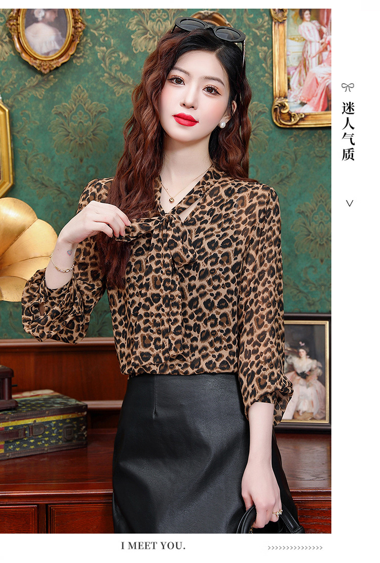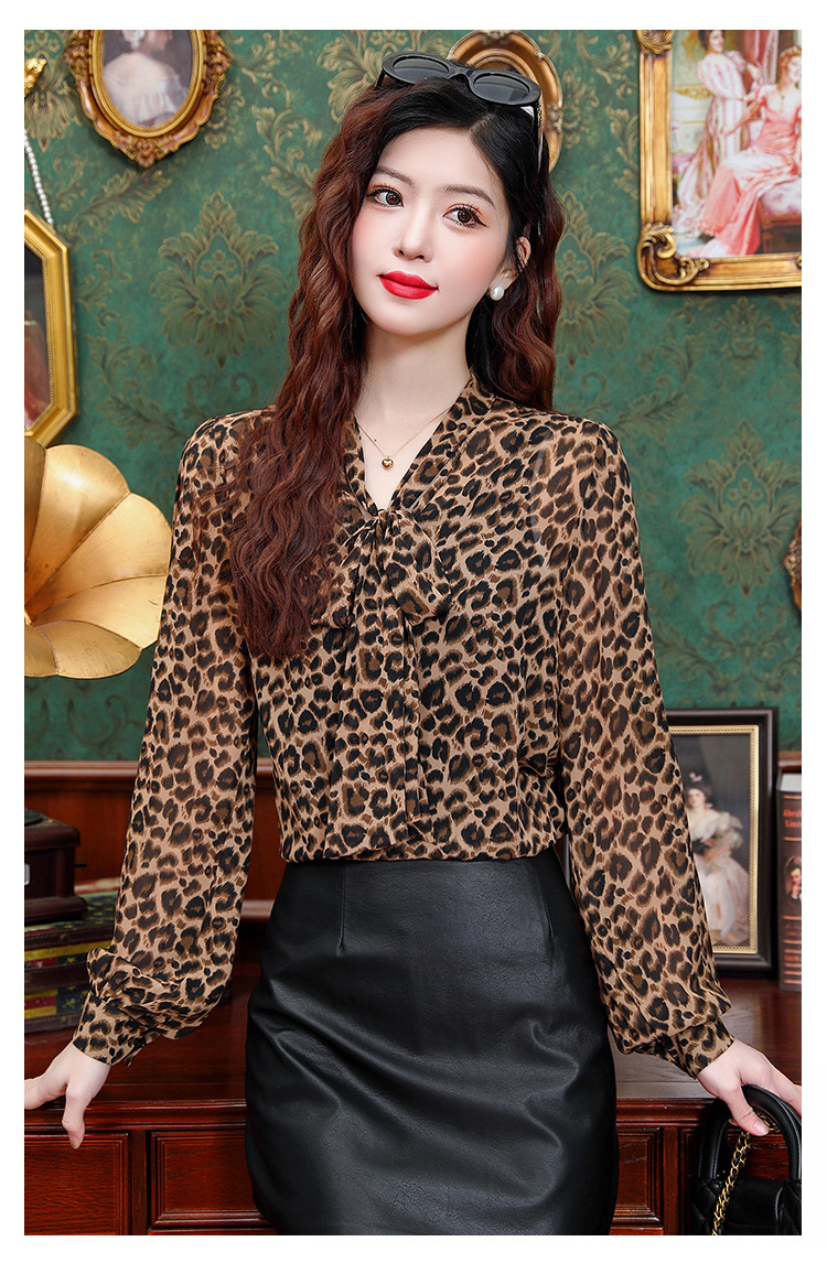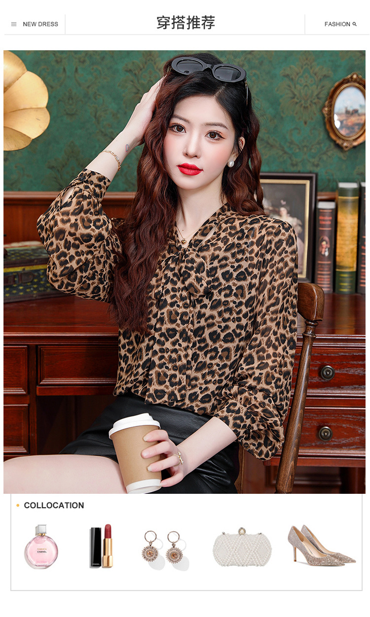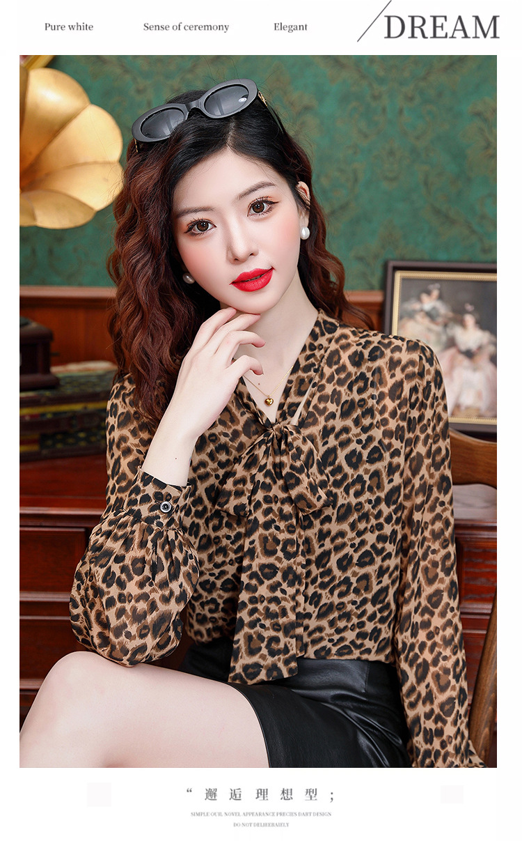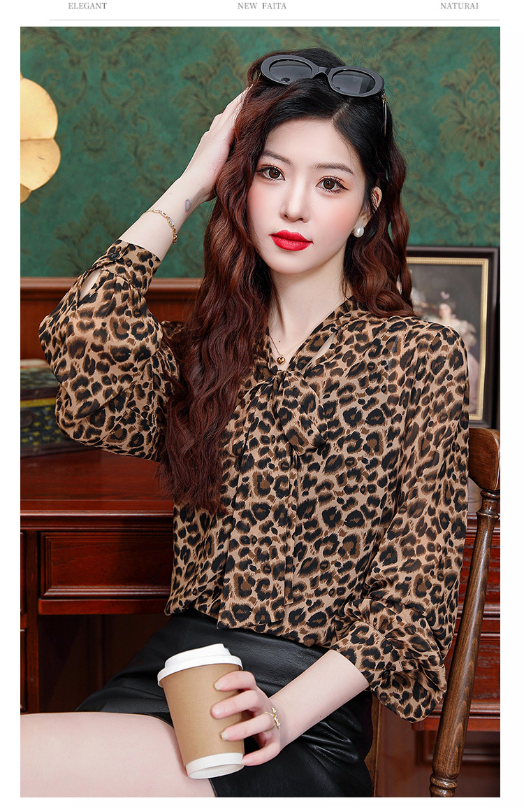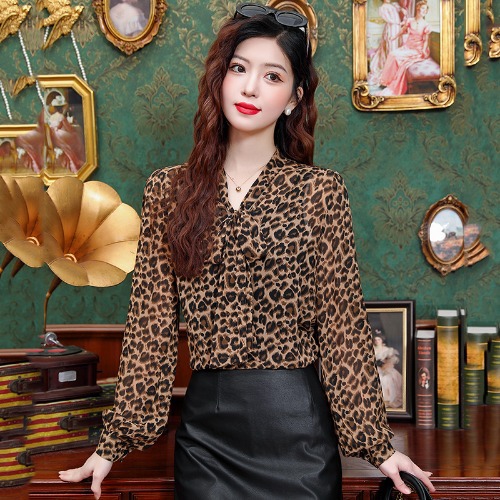 여성용 나비넥타이 레오파드 프린트 셔츠, 가벼운 럭셔리, 연령 감소, 서양식, 연령 감소, 배 덮는 쉬폰 탑스토어 가기