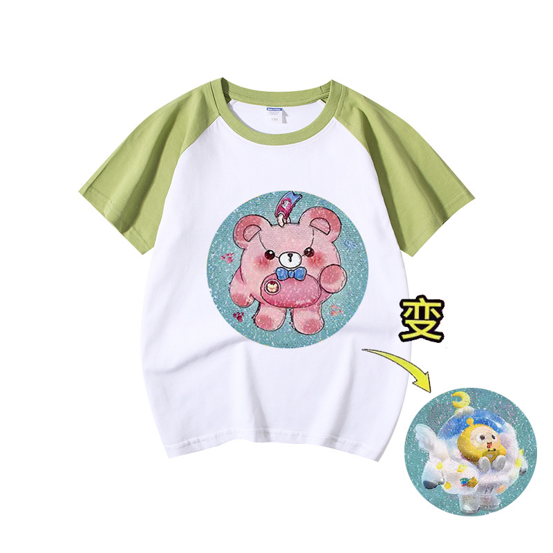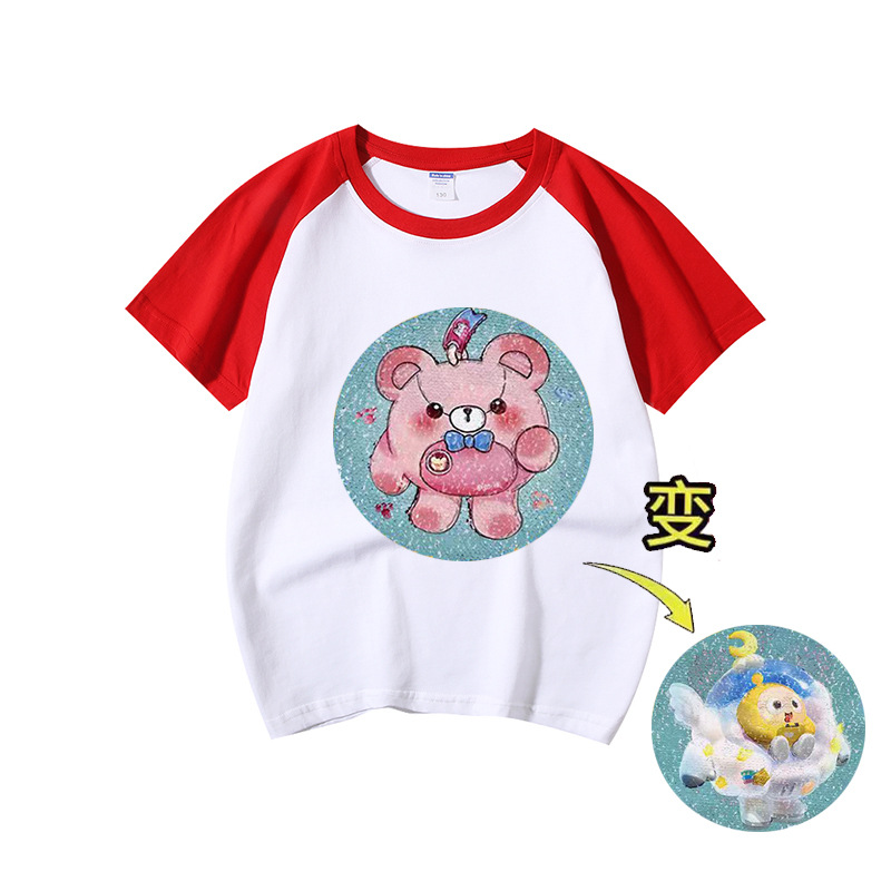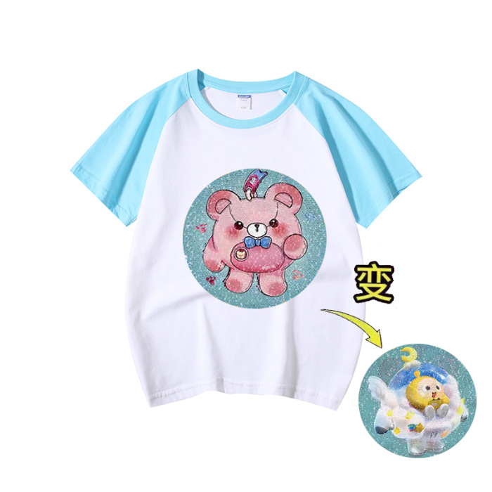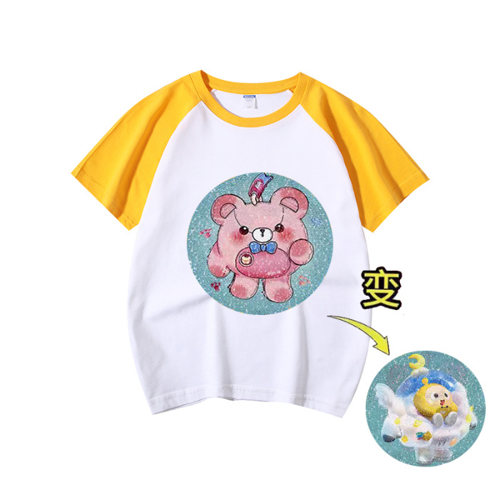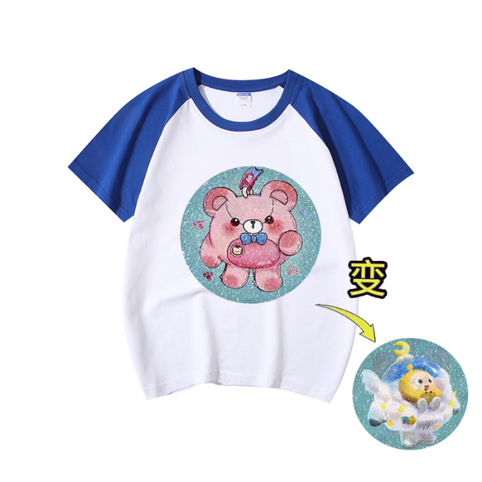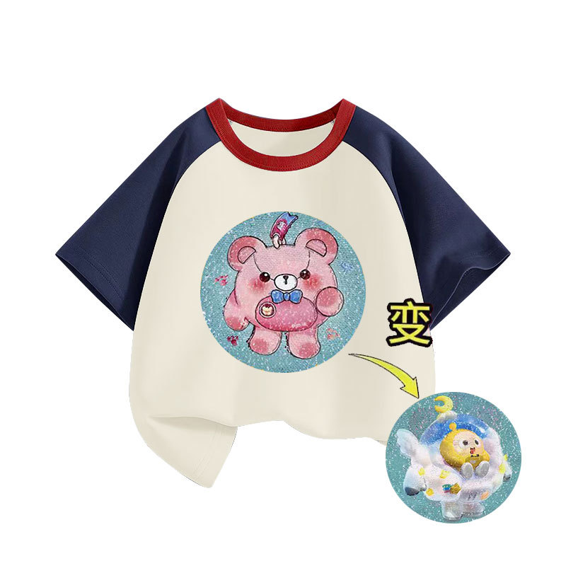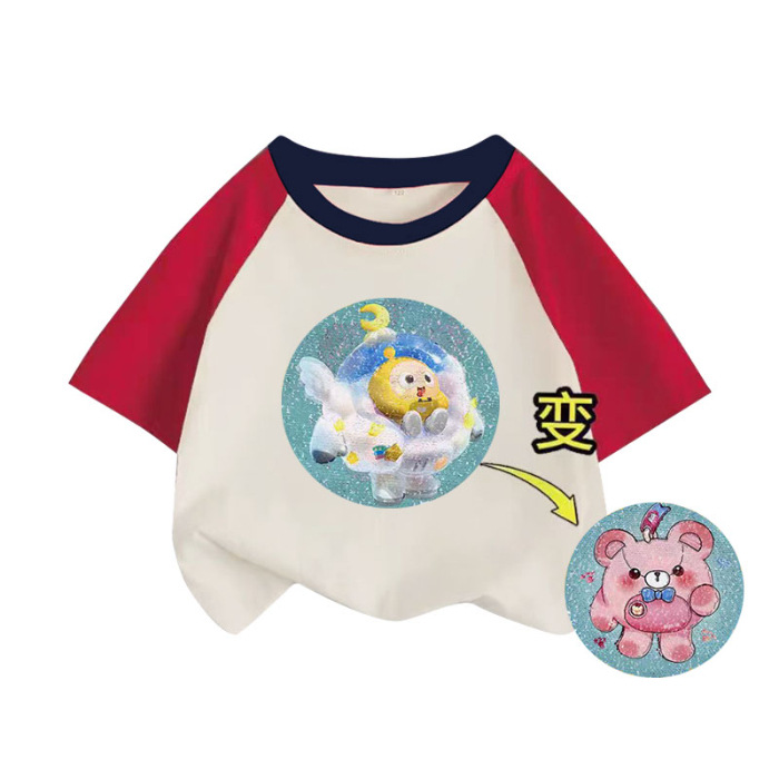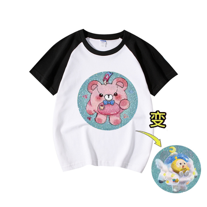2025 소년과 소녀 순수 코튼 멋진 귀여운 색상 변경 어린이 얼굴 변경 소년과 소녀 플립 스퀸 피규어 티셔츠 탑스토어 가기