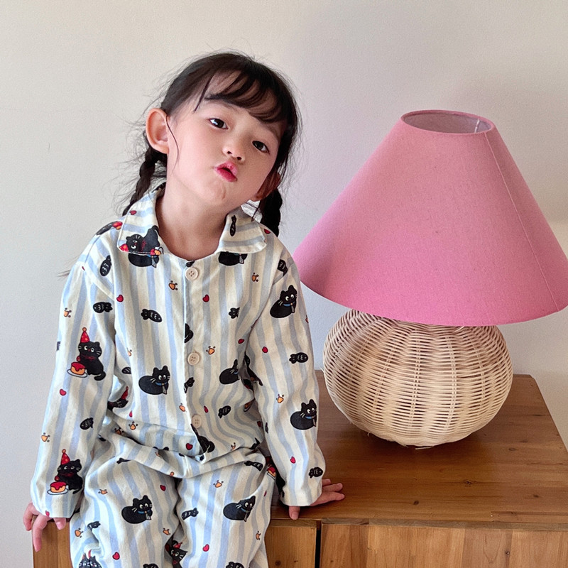 새로운 어린이 긴팔 홈 의류 세트 부모-자식 만화 인쇄 코튼 옷깃 파자마 소년 소녀를위한 투피스 세트스토어 가기