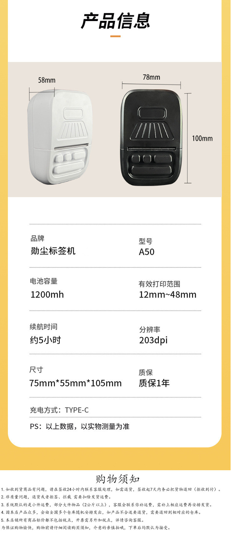 • A50 [다양한 크기의 용지용 판지가 있는 용지] - 프린터 + 라벨 용지 5롤 [50*50mm]