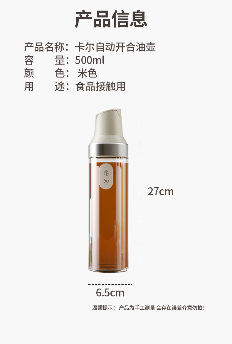 • 商品名称:304不锈钢油嘴自动开合透明玻璃油壶 酱油醋调味瓶 500ml--白色