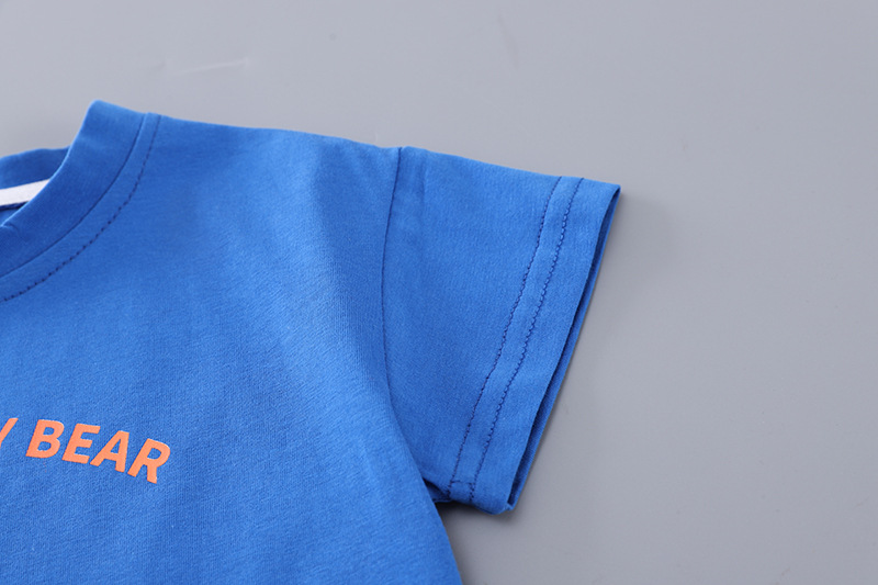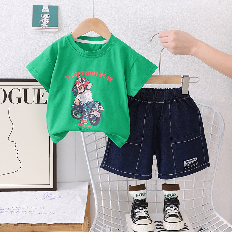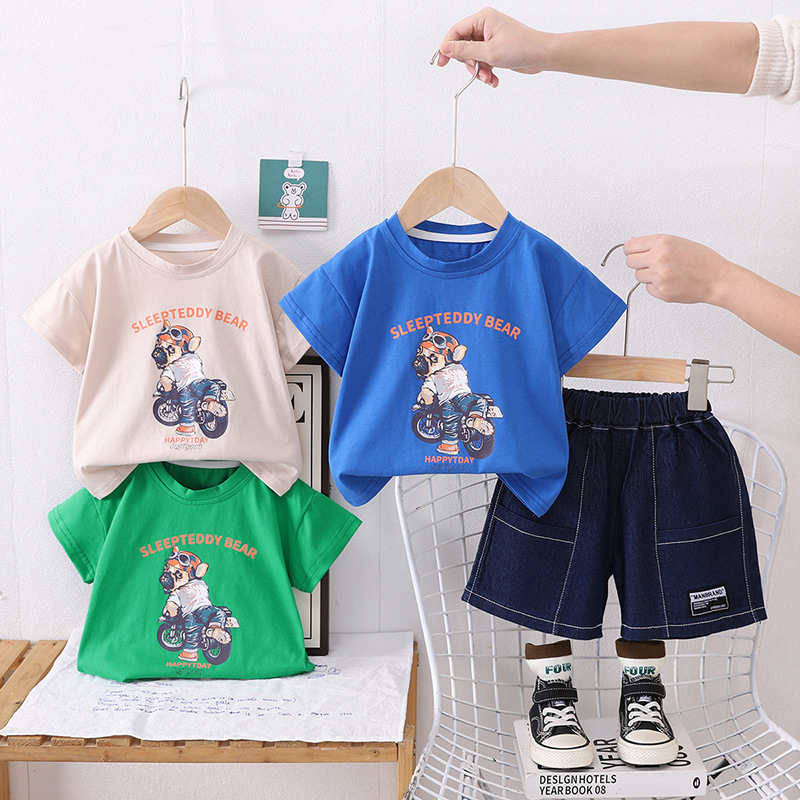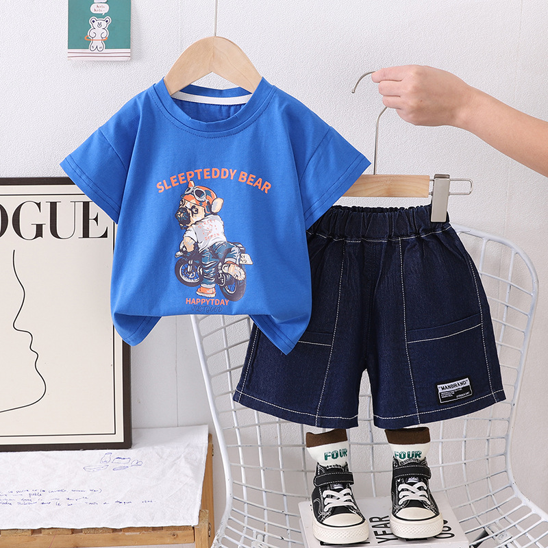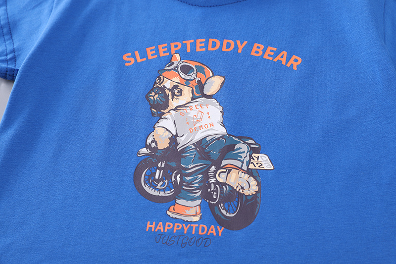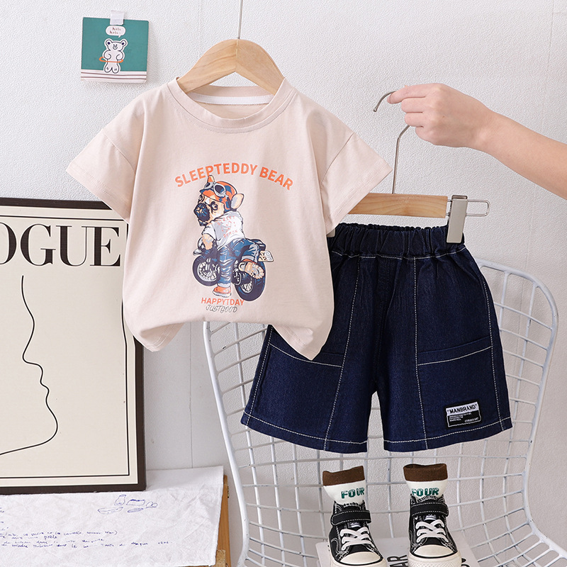 2025 새로운 여름 한국 아동복 소년 강아지 오토바이 유아 짧은 소매 두 반바지 세트 패션