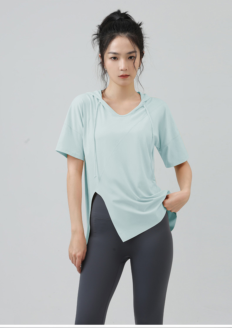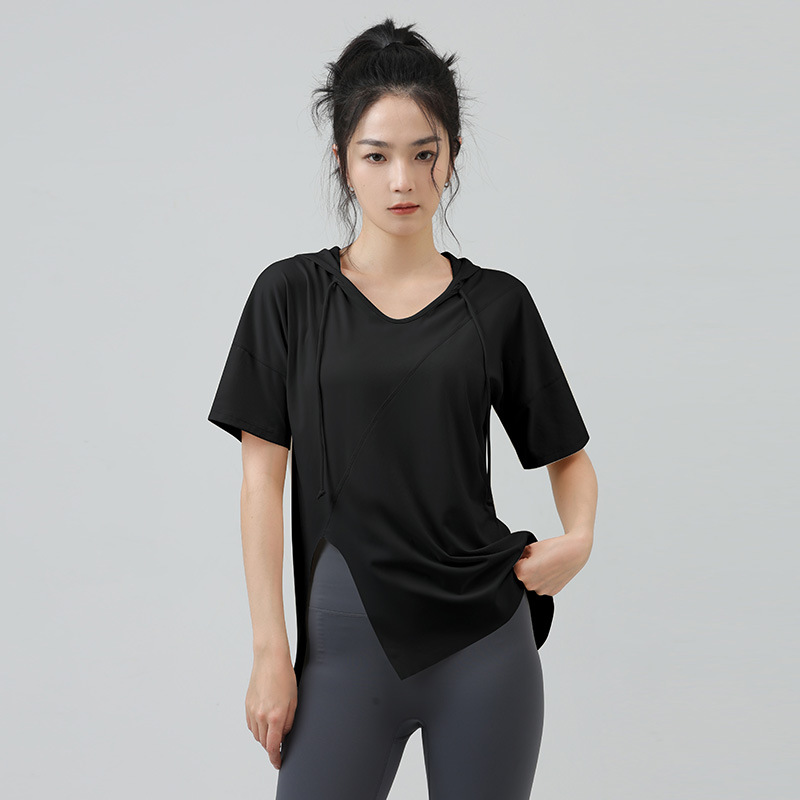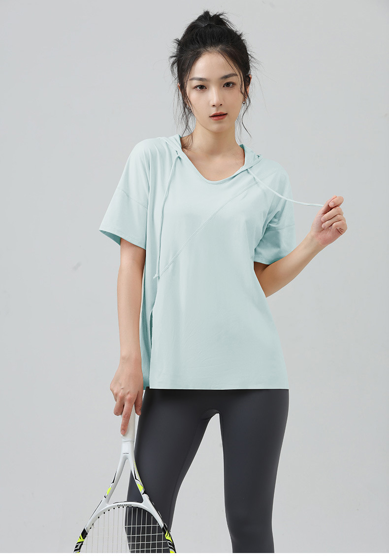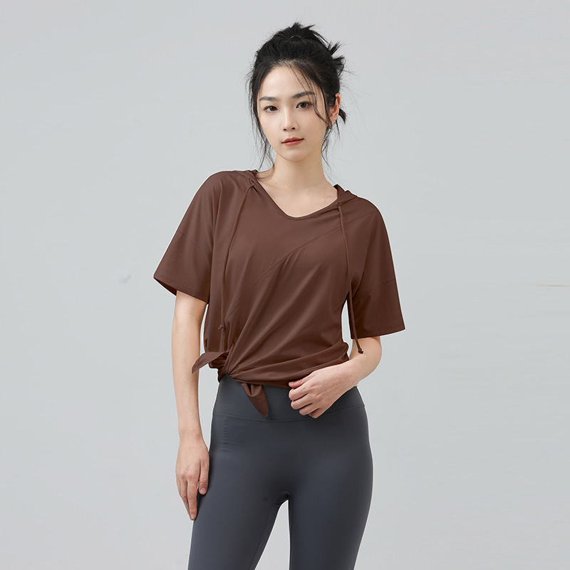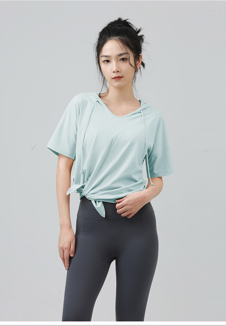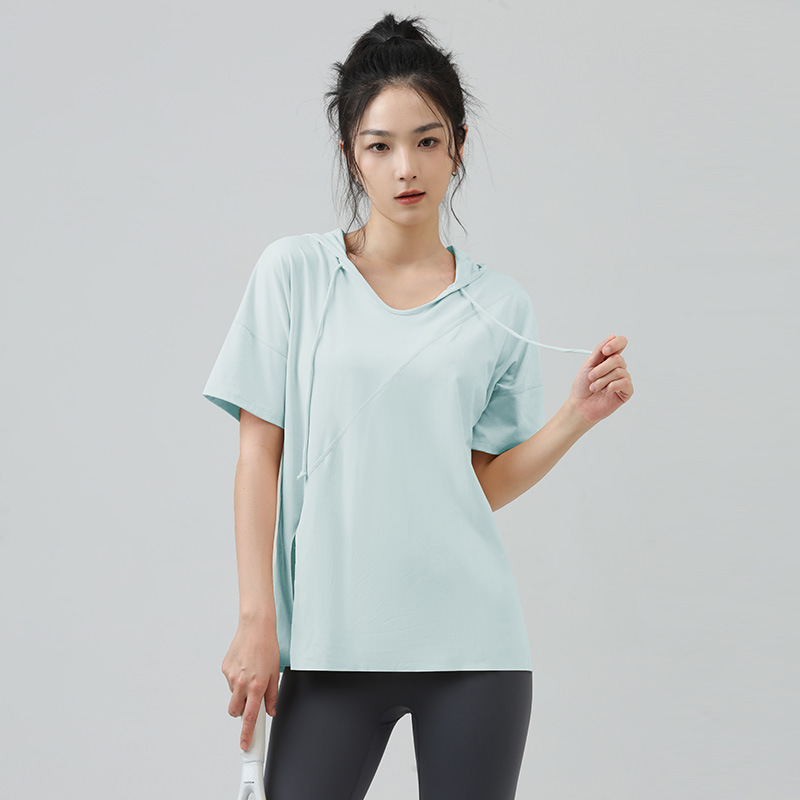 새로운 요가 옷 최고 반팔 느슨한 통기성 스포츠 블라우스 여성용 엉덩이 커버 여름 야외 후드 피트니스 옷