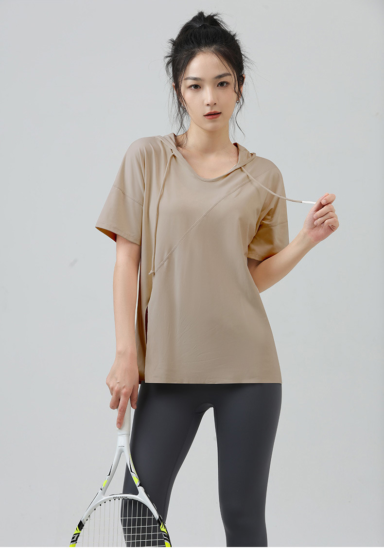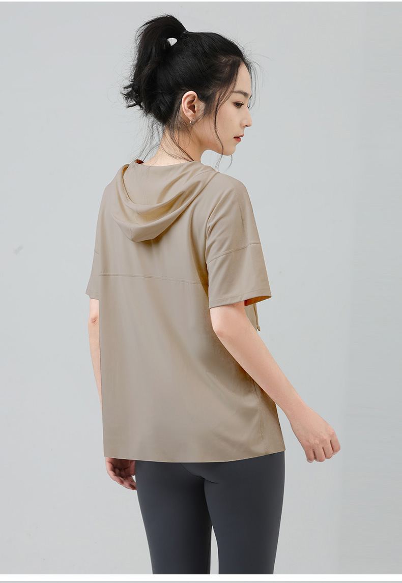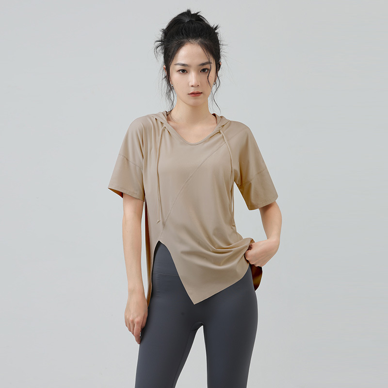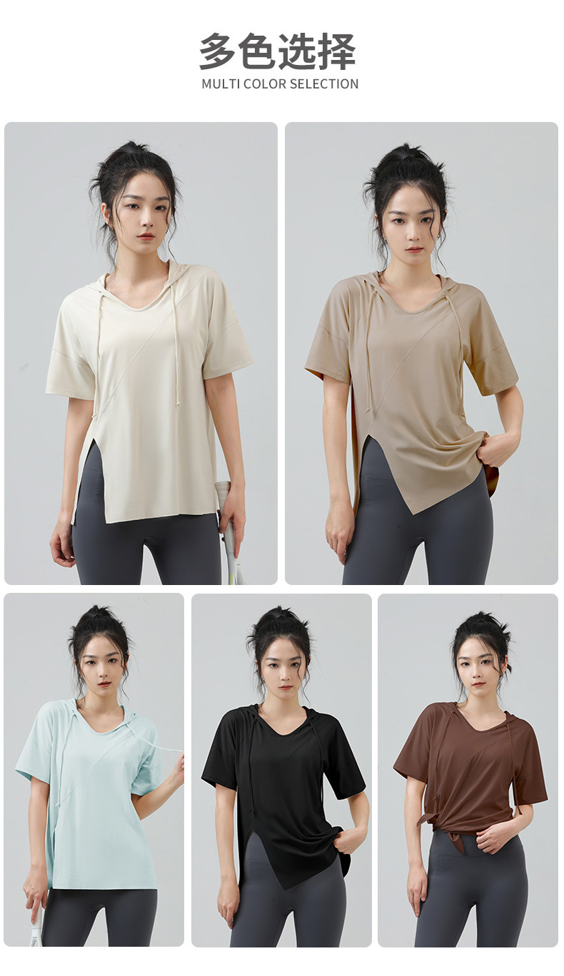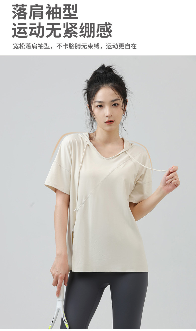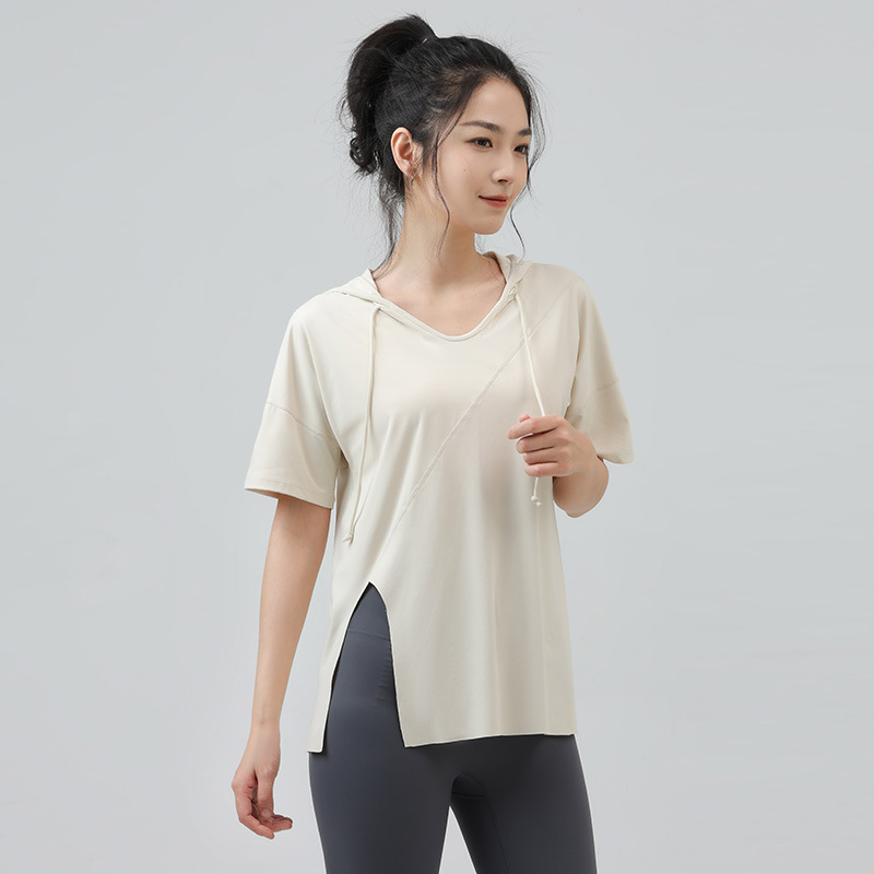 새로운 요가 옷 최고 반팔 느슨한 통기성 스포츠 블라우스 여성용 엉덩이 커버 여름 야외 후드 피트니스 옷