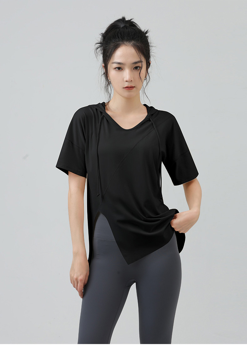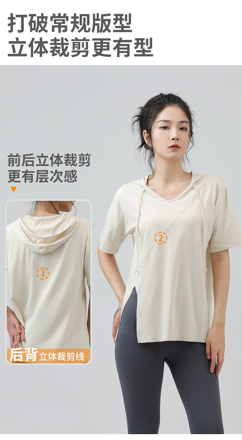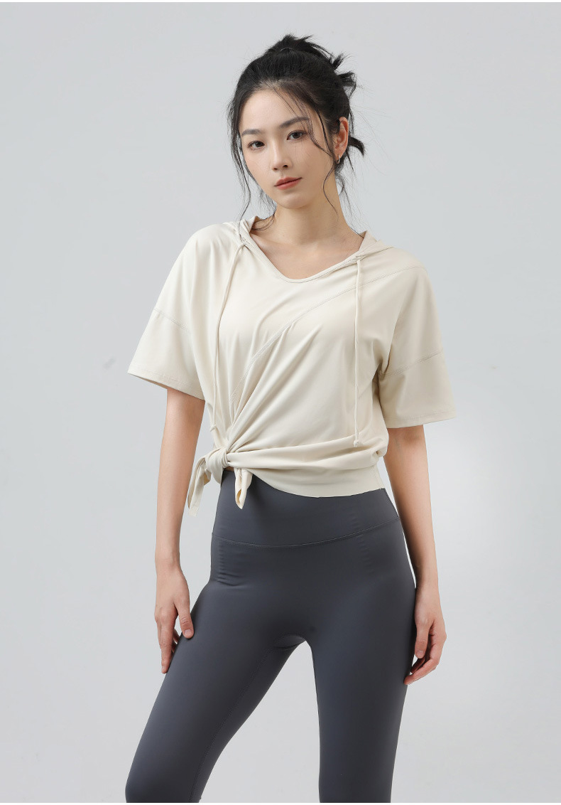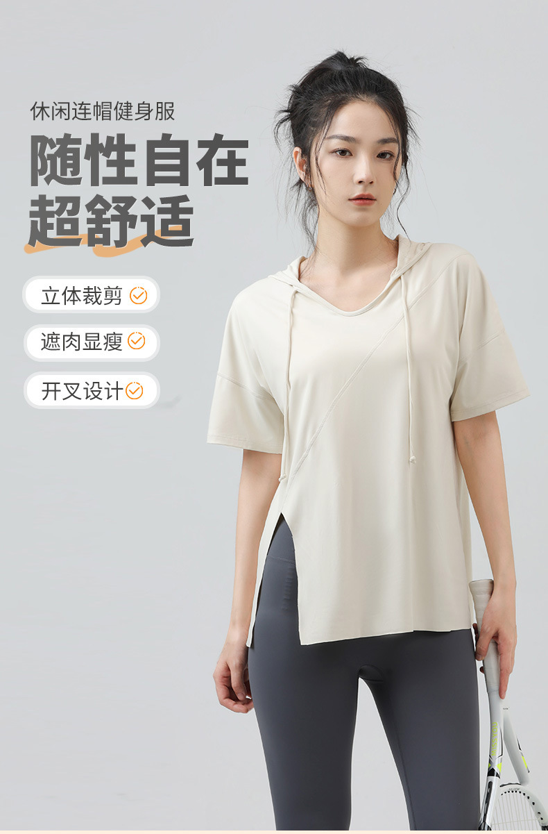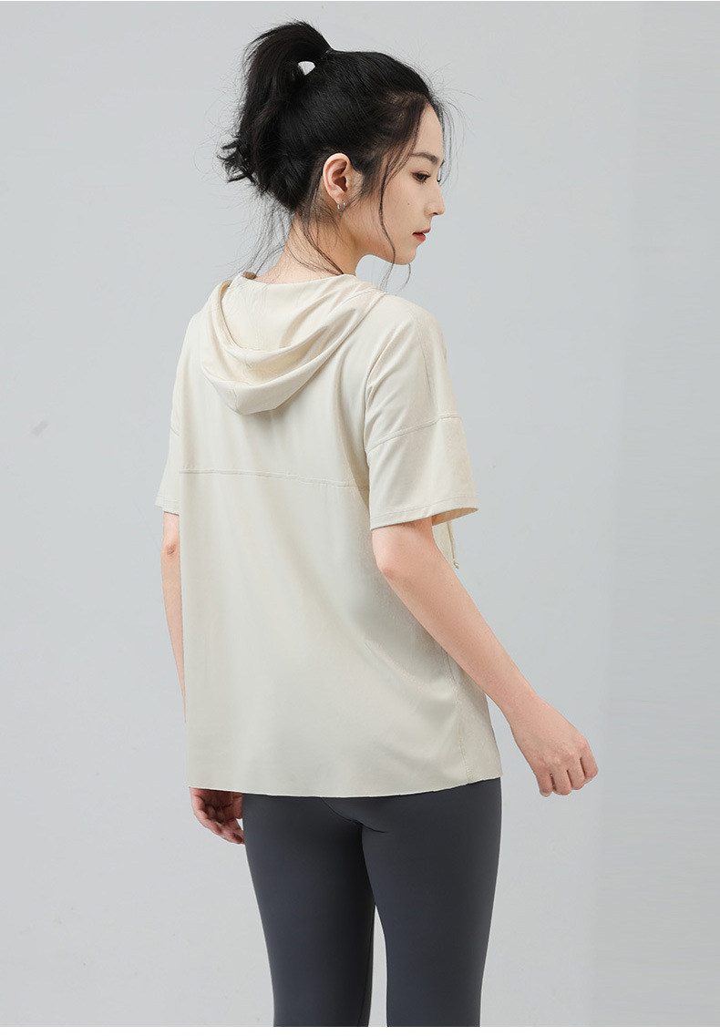 새로운 요가 옷 최고 반팔 느슨한 통기성 스포츠 블라우스 여성용 엉덩이 커버 여름 야외 후드 피트니스 옷
