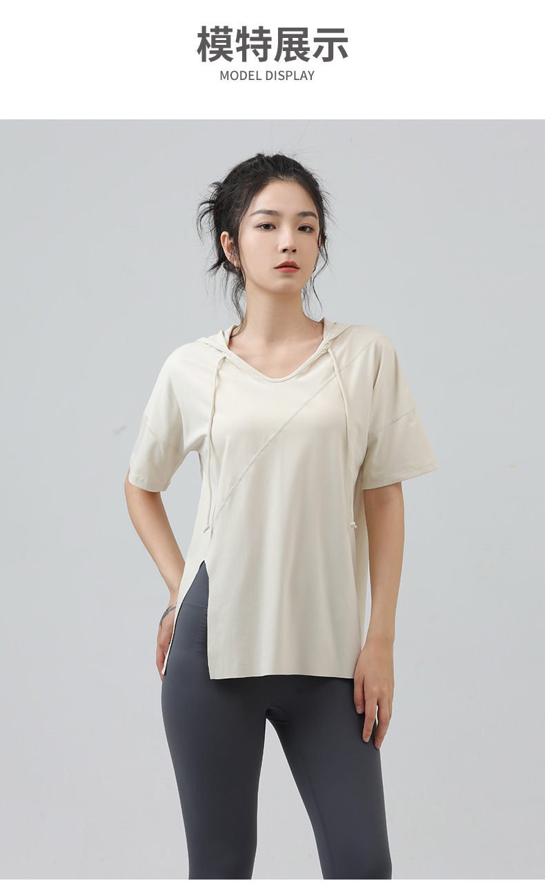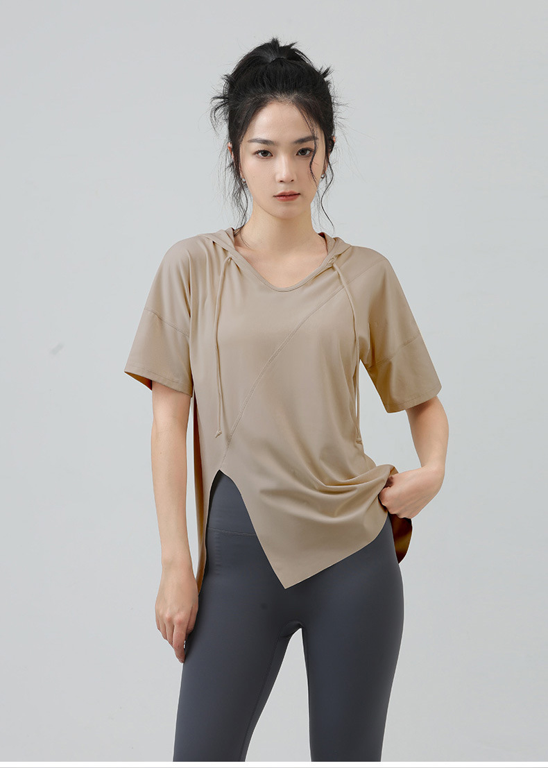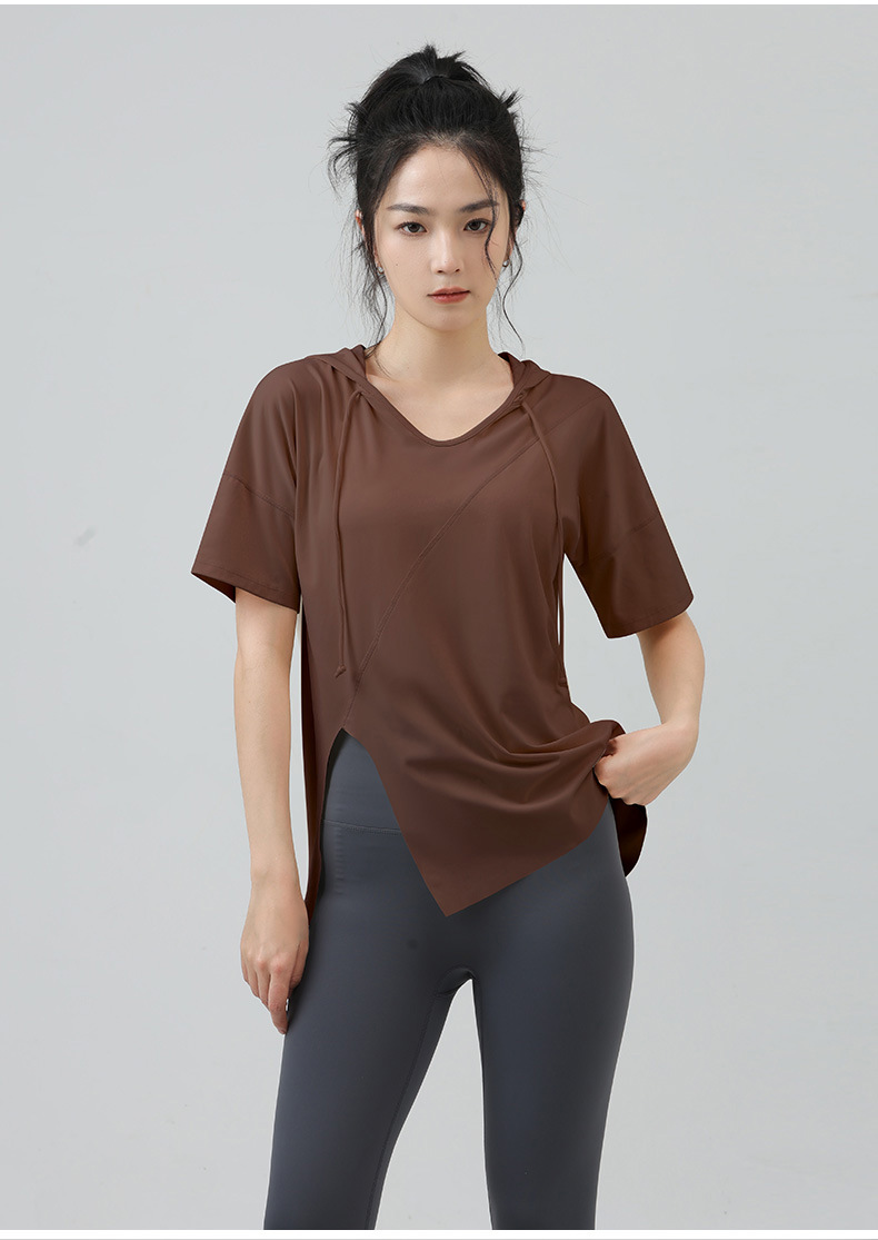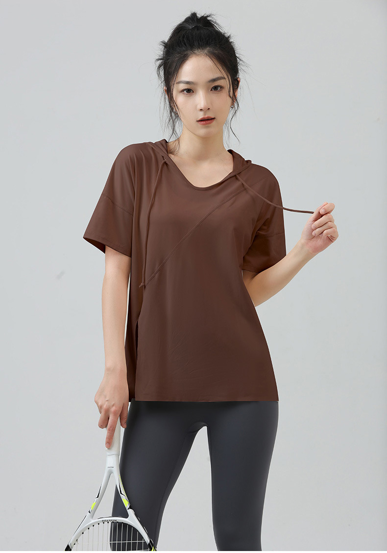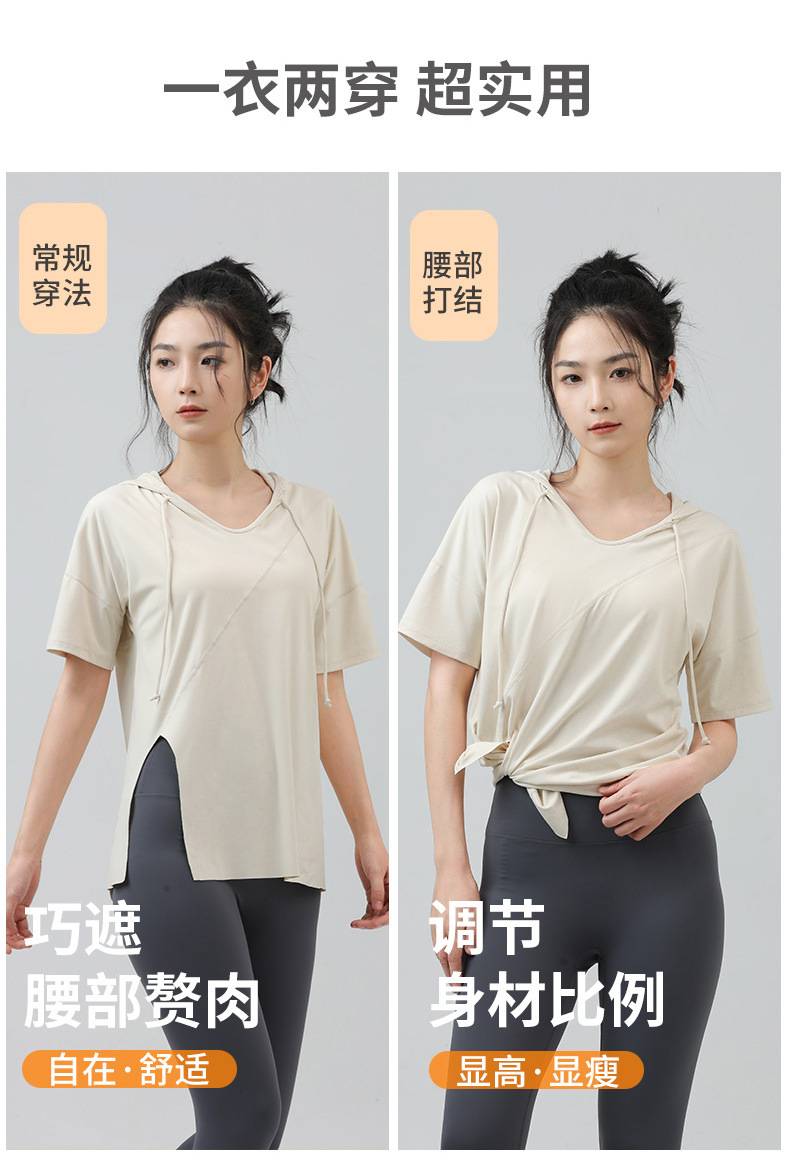 새로운 요가 옷 최고 반팔 느슨한 통기성 스포츠 블라우스 여성용 엉덩이 커버 여름 야외 후드 피트니스 옷