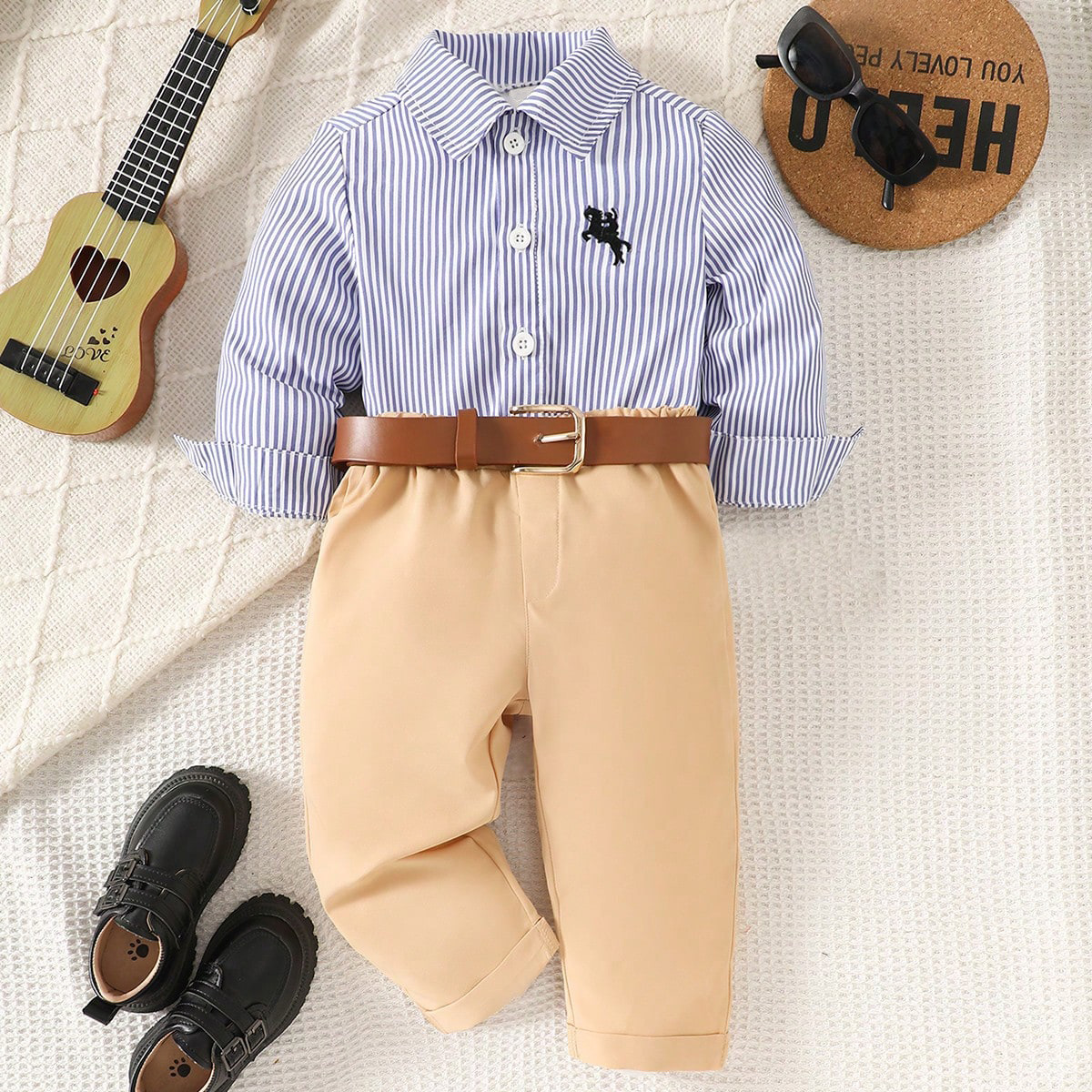 • 스트라이프 셔츠 + 브라운 팬츠 (벨트 제외)