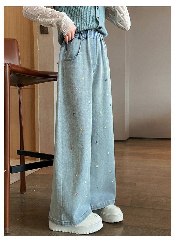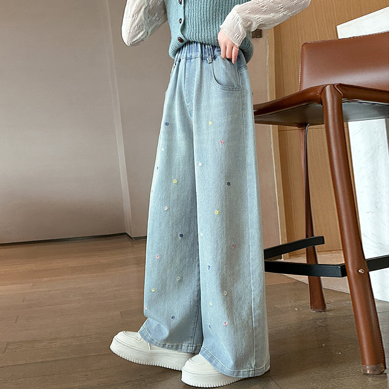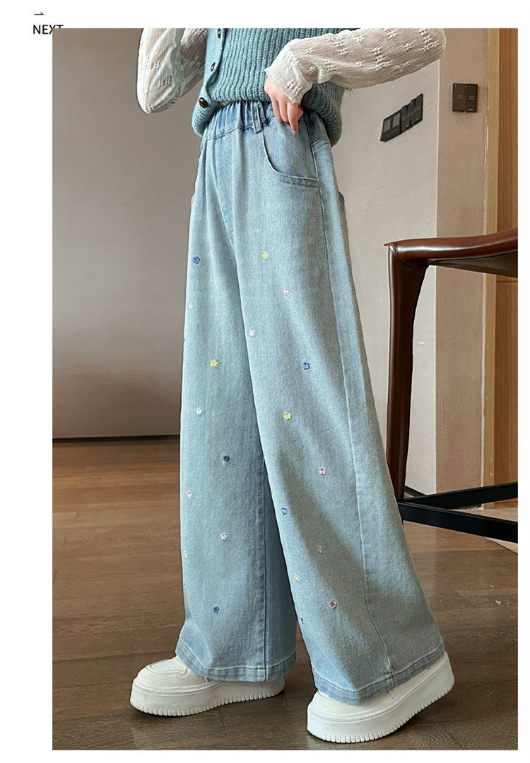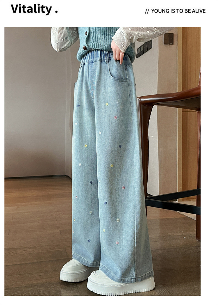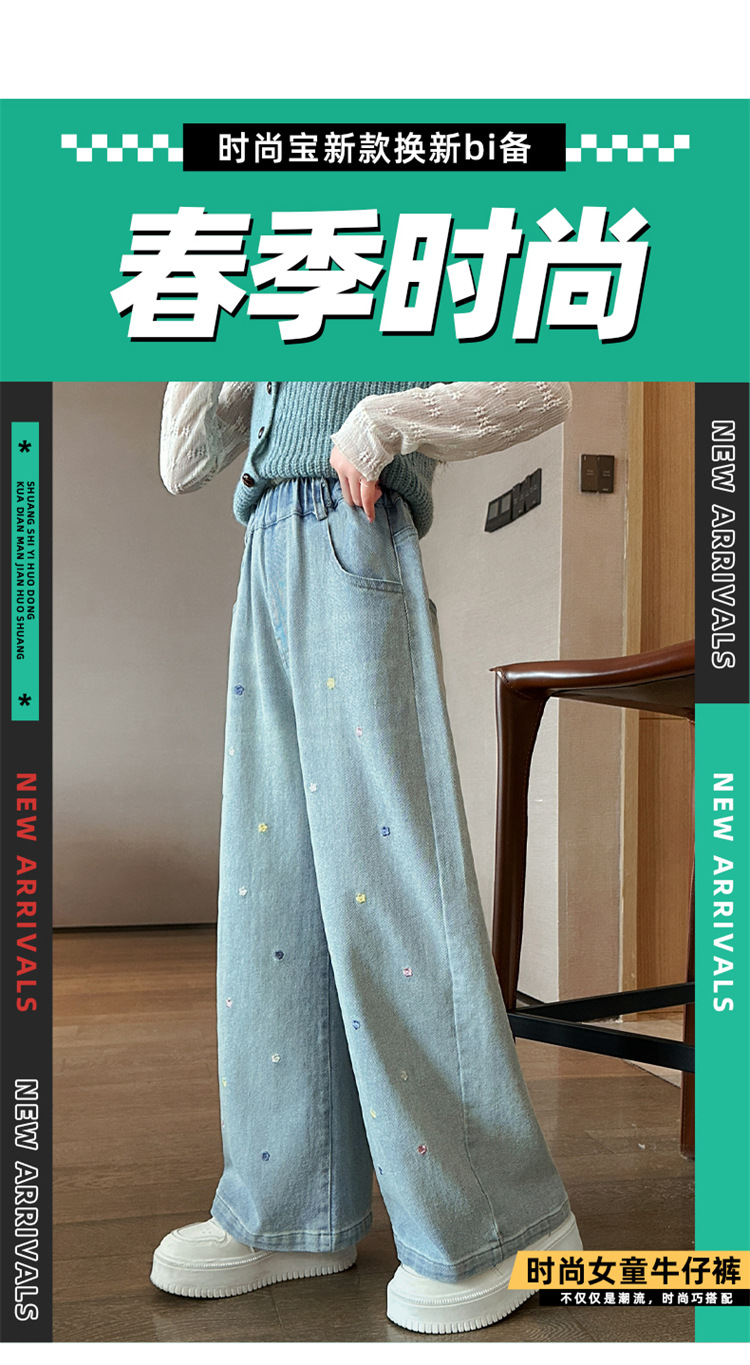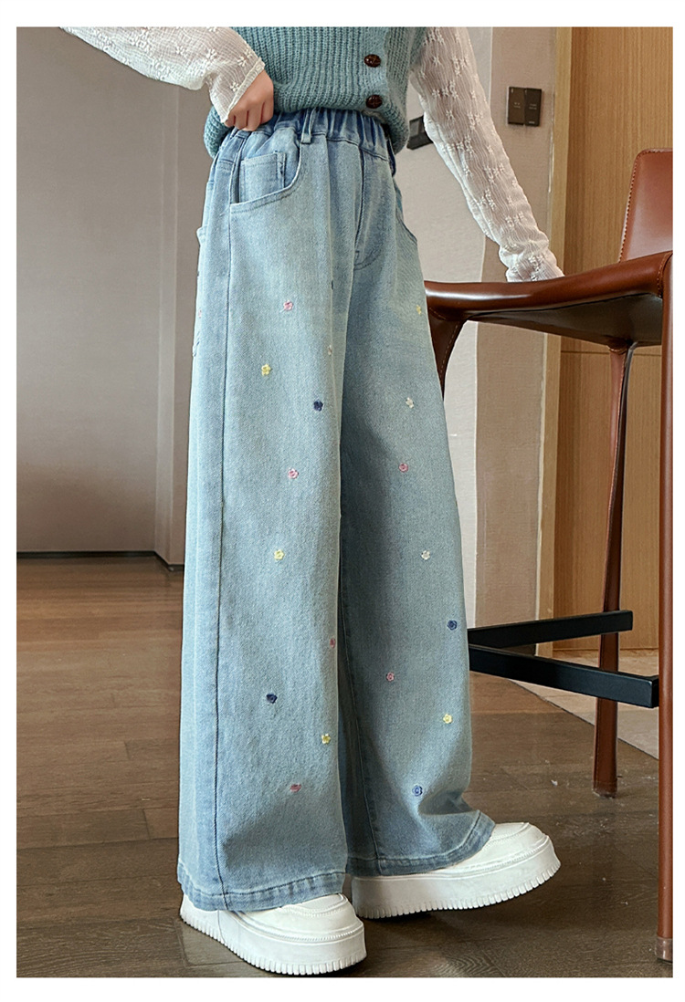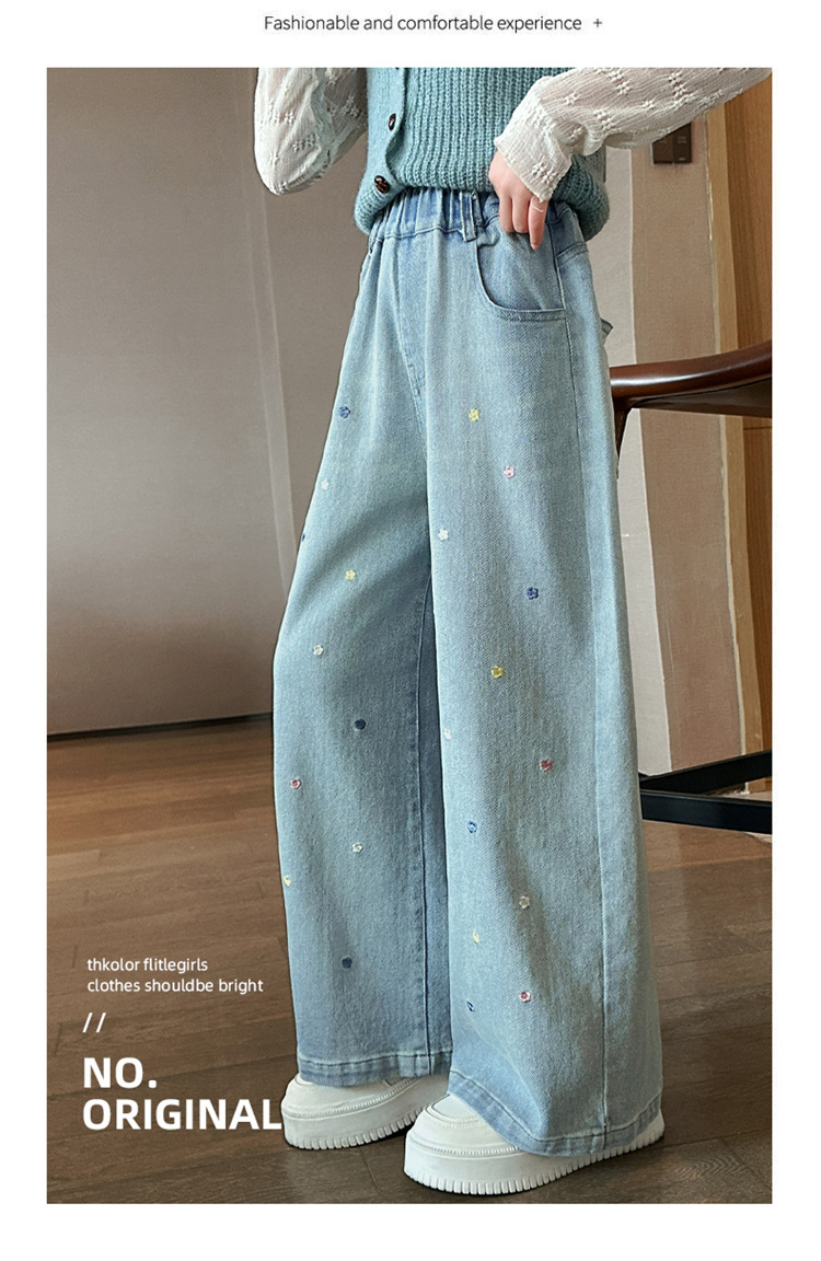 소녀 바지 봄과 가을 큰 어린이 서양식 스트레이트 레그 봄 청바지 인터넷 연예인 프라이드 스트리트 트렌디 쿨 봄 어린이 와이드 레그 바지