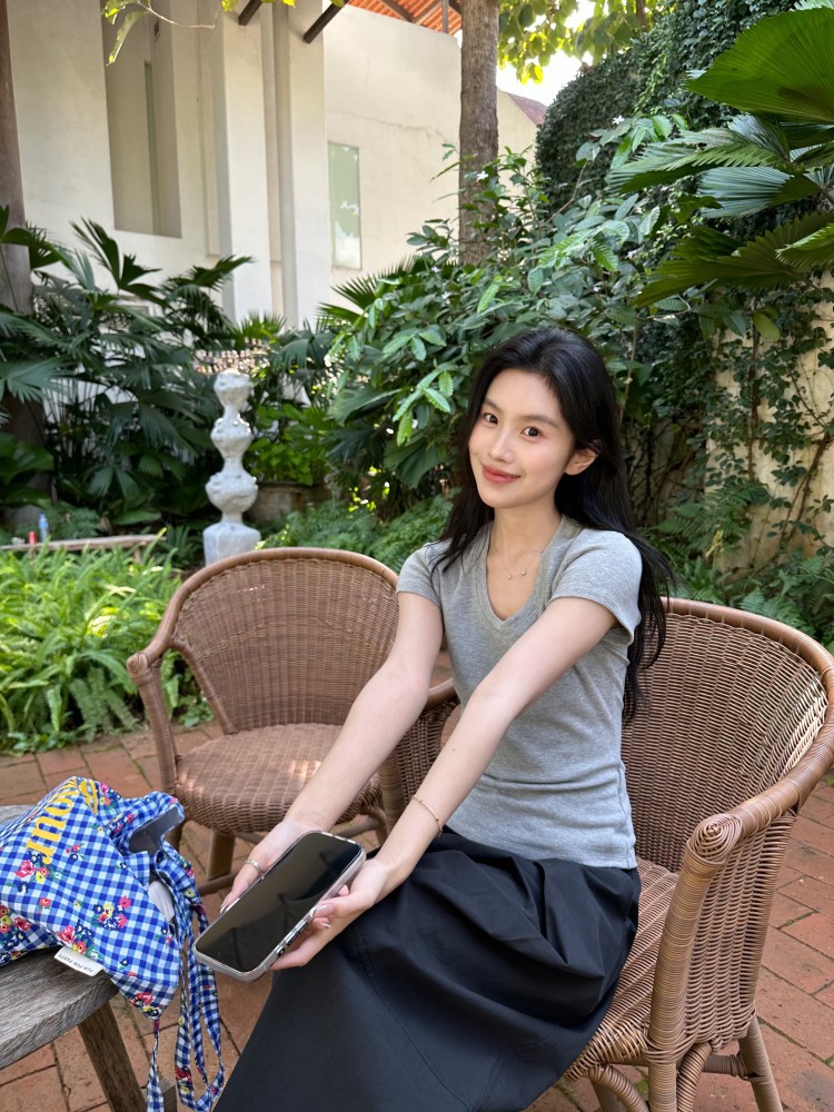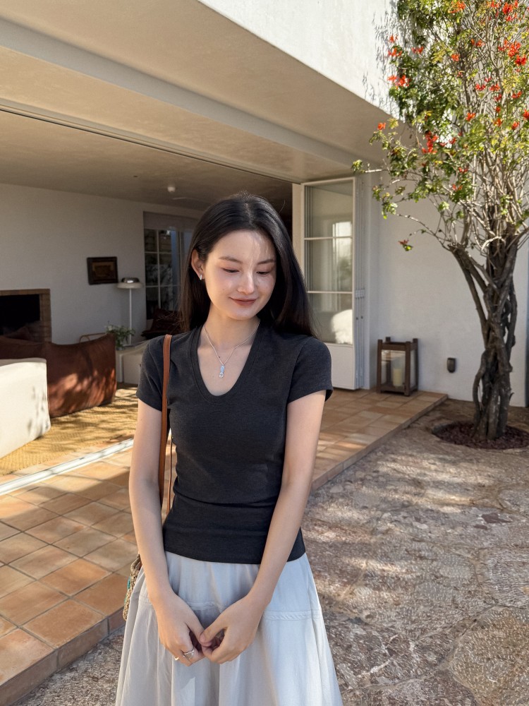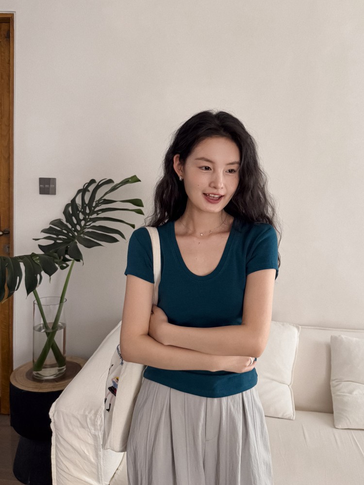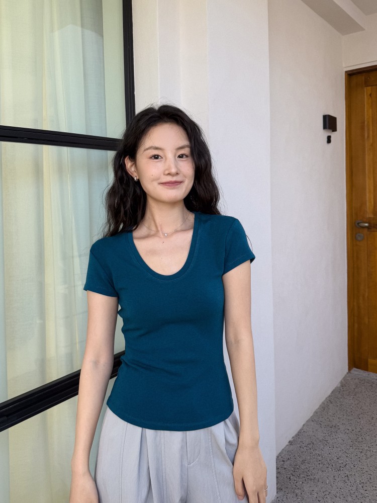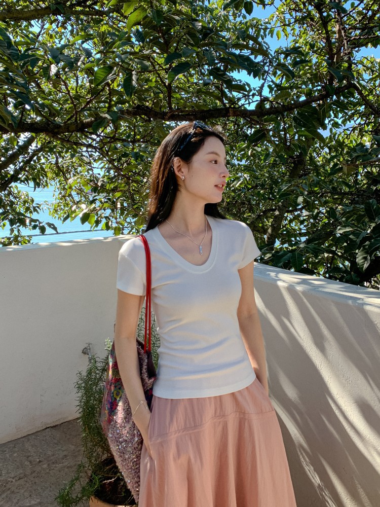 U-넥 높은 탄성 어깨 슬림 티셔츠 DIGM 봄과 여름 폭발 미니멀리스트 슬림베이스 셔츠 짧은 소매 티셔츠 여성용 60382스토어 가기