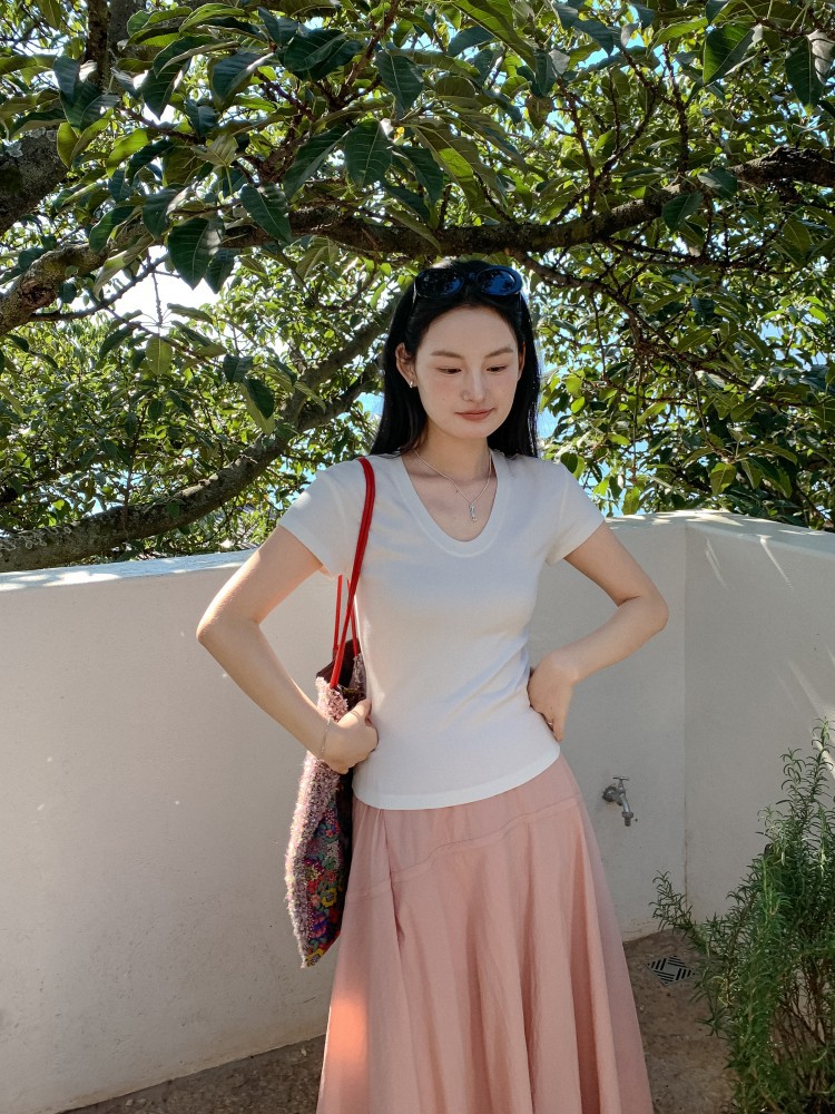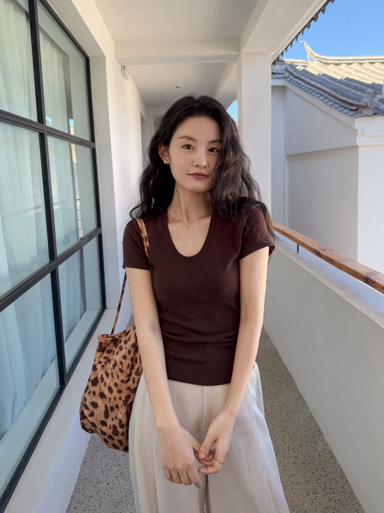 U-넥 높은 탄성 어깨 슬림 티셔츠 DIGM 봄과 여름 폭발 미니멀리스트 슬림베이스 셔츠 짧은 소매 티셔츠 여성용 60382