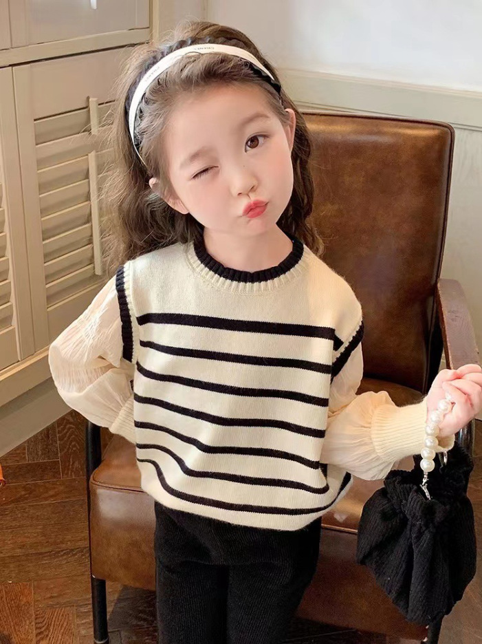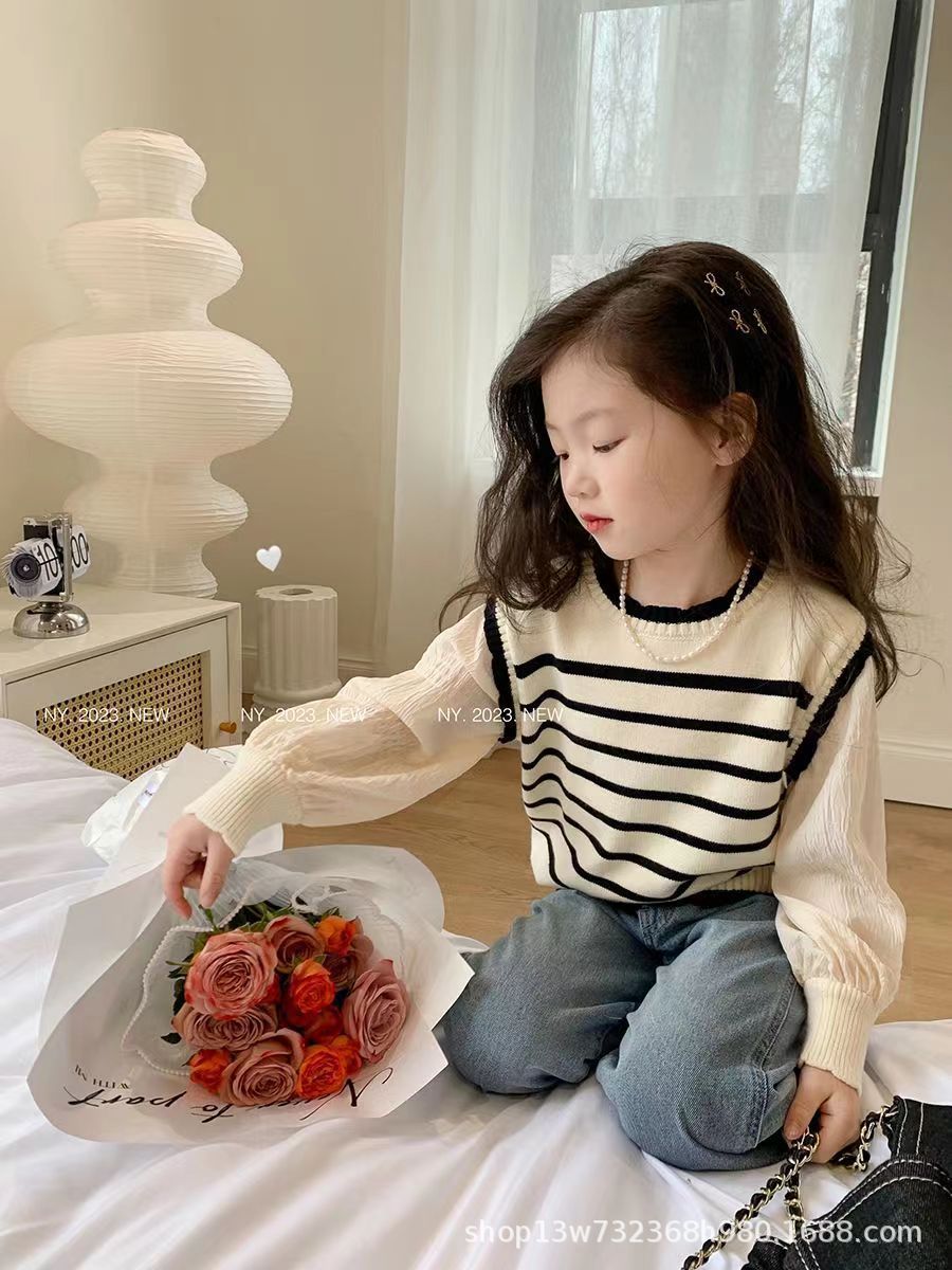 [재고 있음] 여아용 스웨터, 페이크 투피스 니트 스웨터, 봄, 가을 얇은 스타일, 패셔너블한 아동 가을 스트라이프 탑스토어 가기