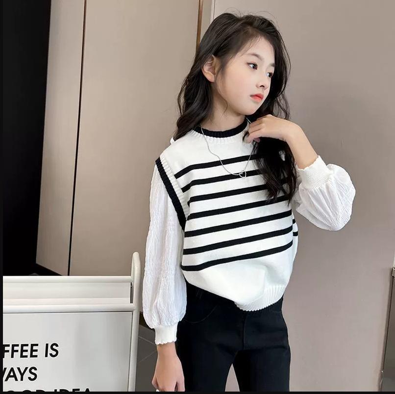 [재고 있음] 여아용 스웨터, 페이크 투피스 니트 스웨터, 봄, 가을 얇은 스타일, 패셔너블한 아동 가을 스트라이프 탑