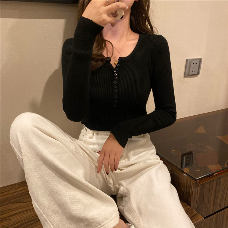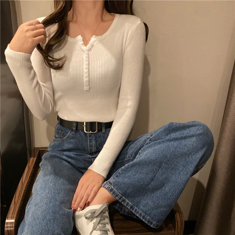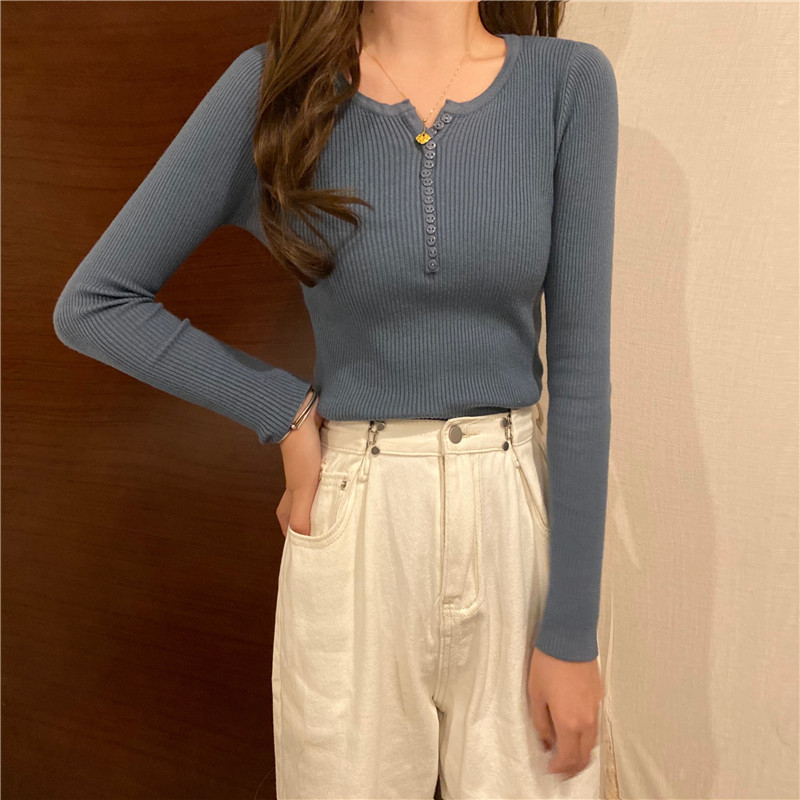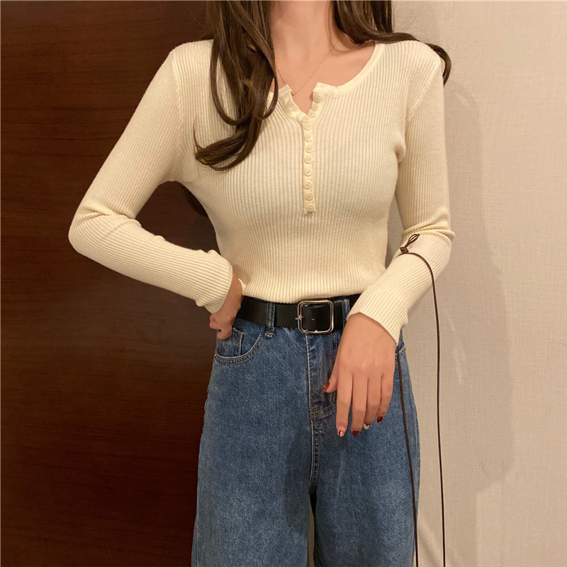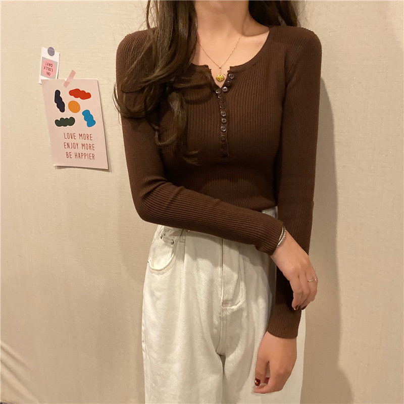세련된 로우 넥 베이스 셔츠 여성용 봄웨어 외래식 니트 셔츠, 콜라본 타이트 스웨터 톱 11 색상 착용