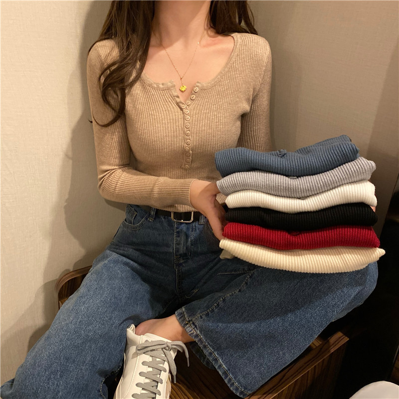 세련된 로우 넥 베이스 셔츠 여성용 봄웨어 외래식 니트 셔츠, 콜라본 타이트 스웨터 톱 11 색상 착용스토어 가기