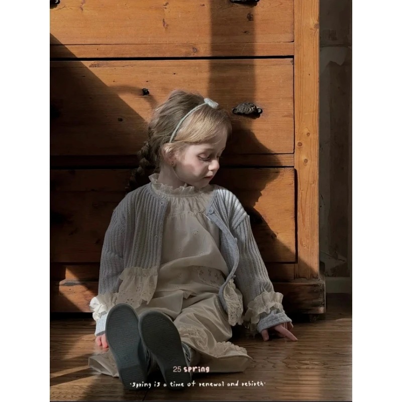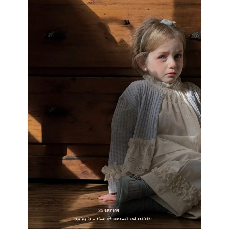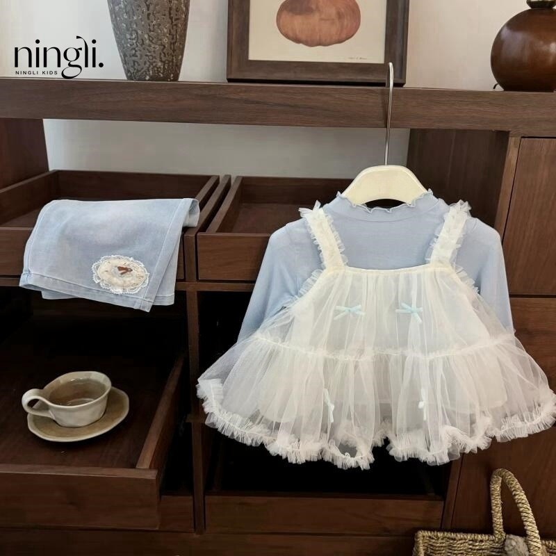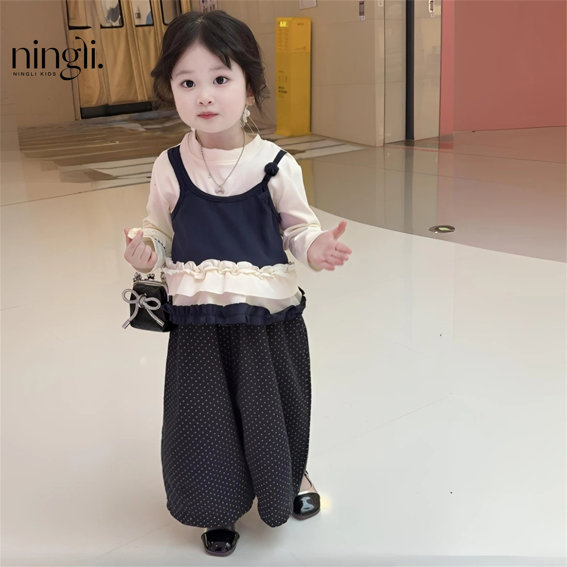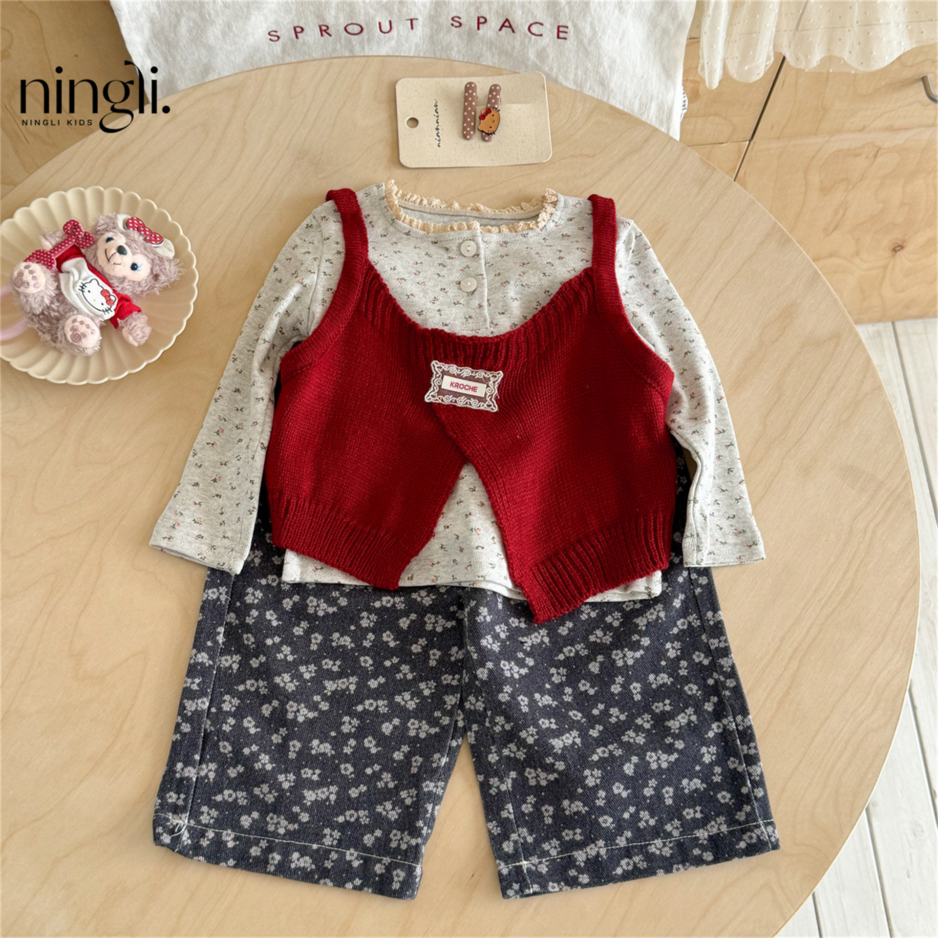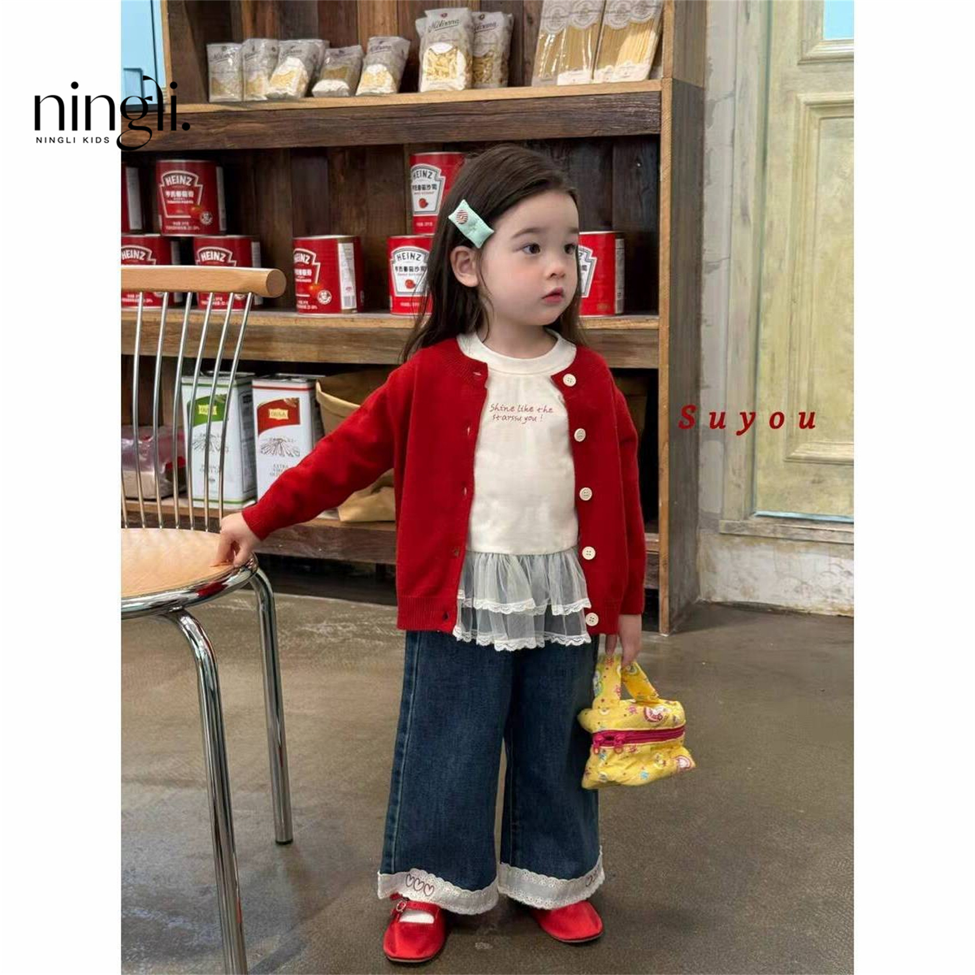 Ningli 한국 아동복 여아 정장 가을 신작 아동 숲 스타일 스플 라이스 레이스 카디건 와이드 레그 팬츠 3 피스 세트