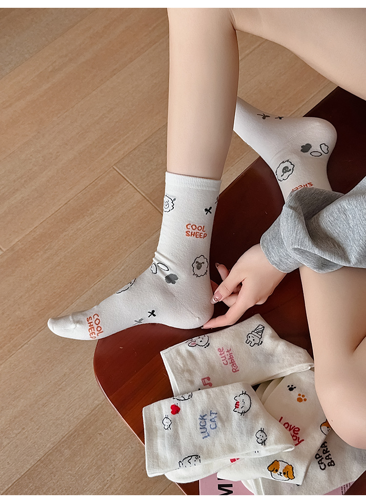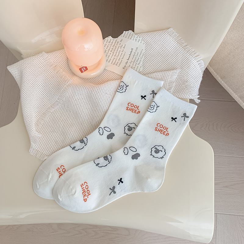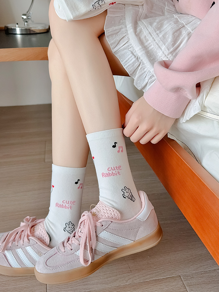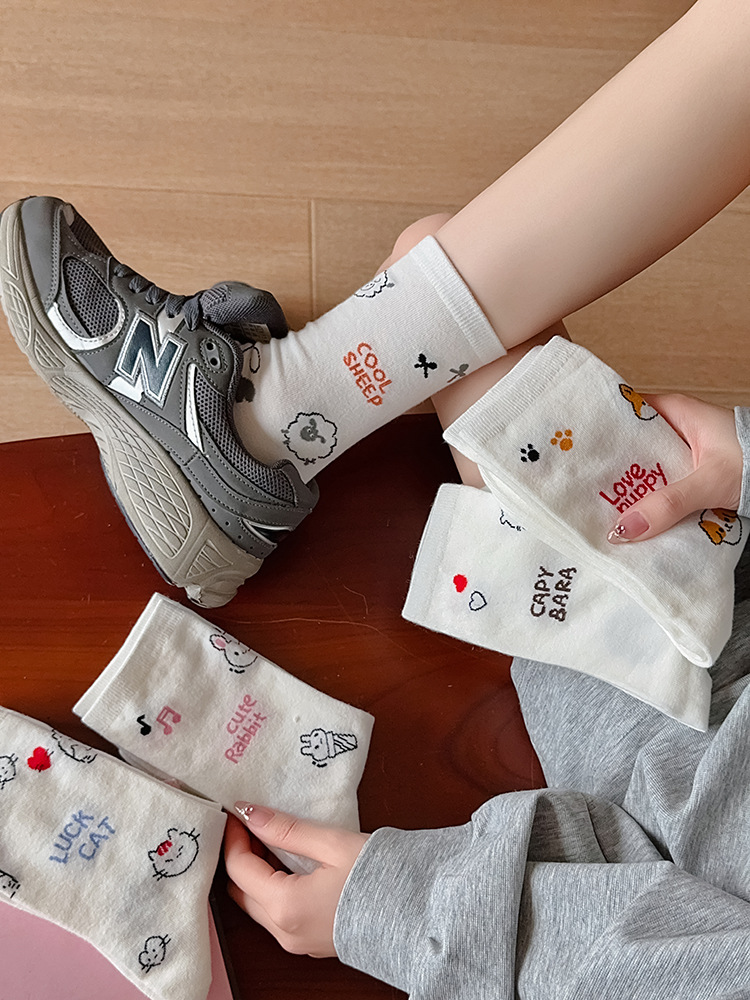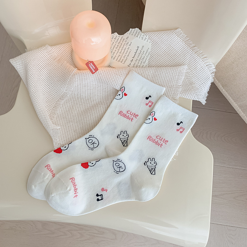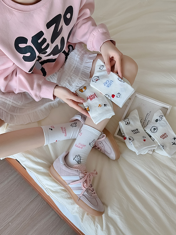 귀여운 만화 흰색 양말 여성의 봄과 가을 중간 길이 양말 일본 스타일 달콤한 대학 스타일 Instagram 스타일 트렌디 한 올 매치 스타킹
