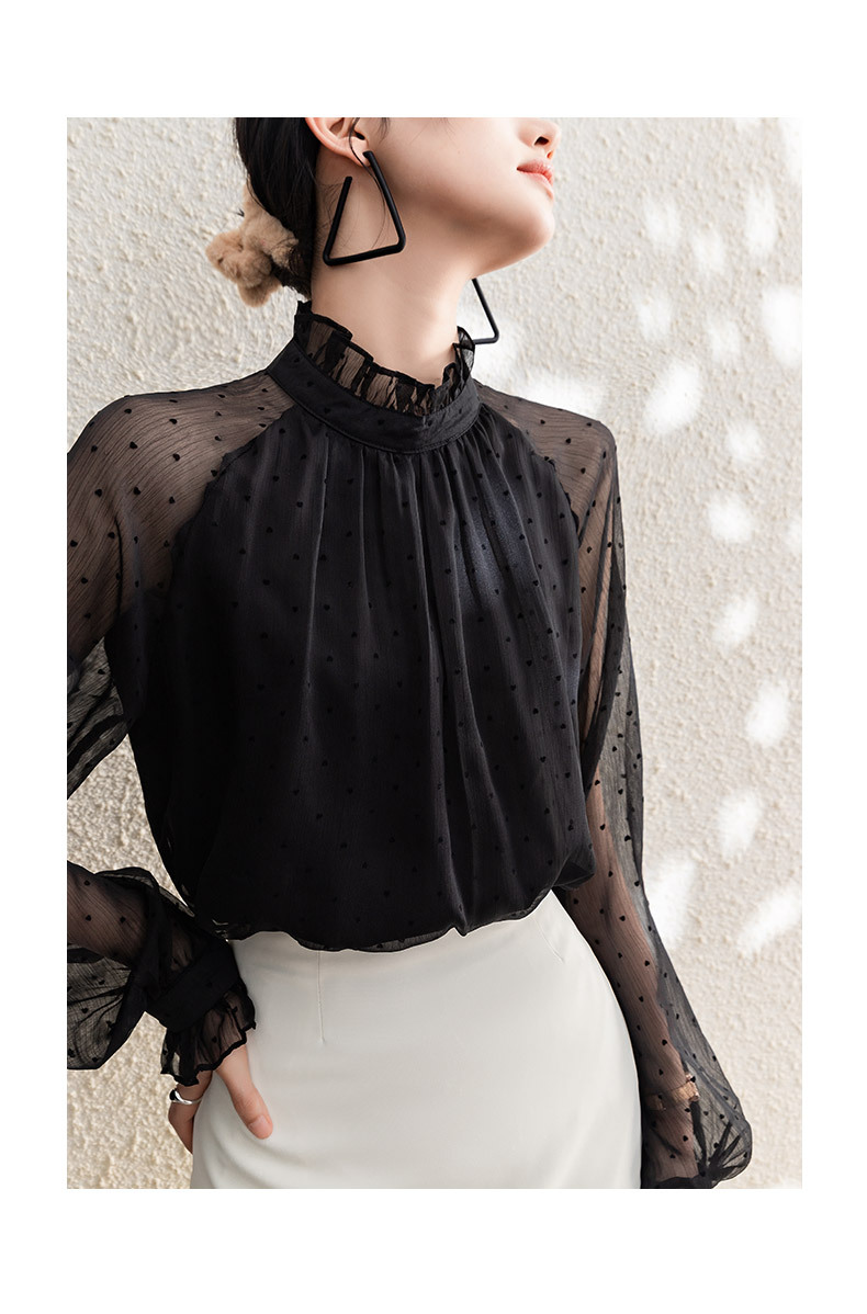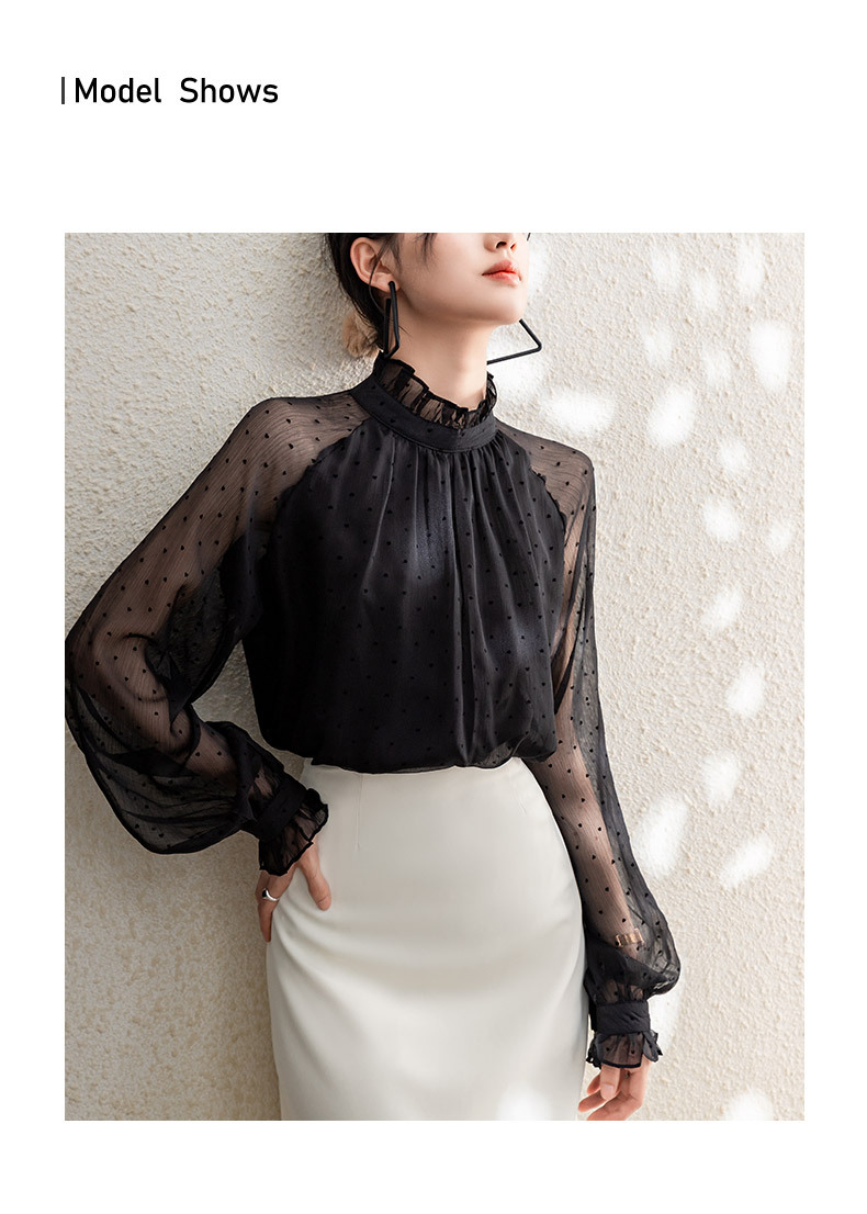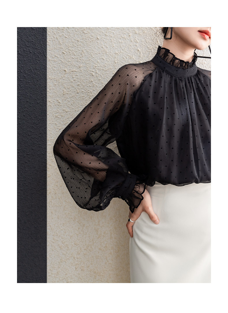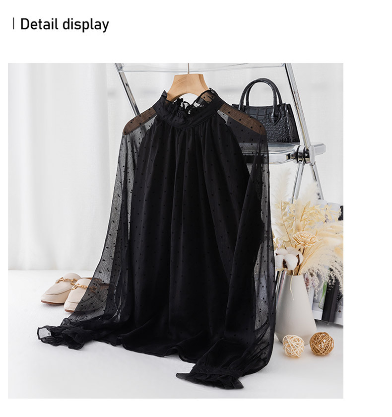 2025 새로운 여름 폴카 도트 곰팡이 스탠드 칼라 아름다운 쉬폰 셔츠 여성 가을 셔츠 루즈 탑 긴 소매