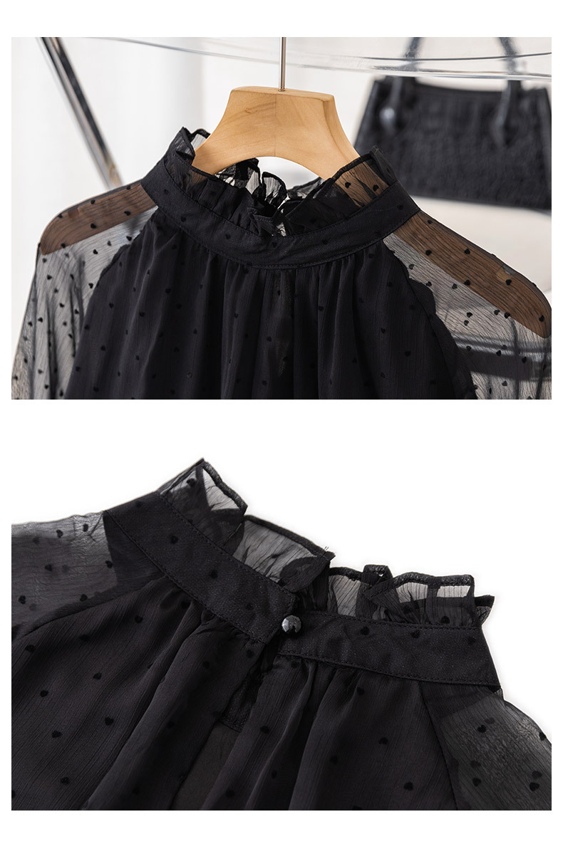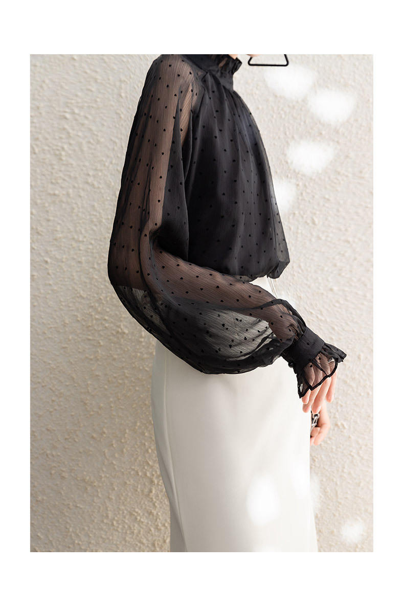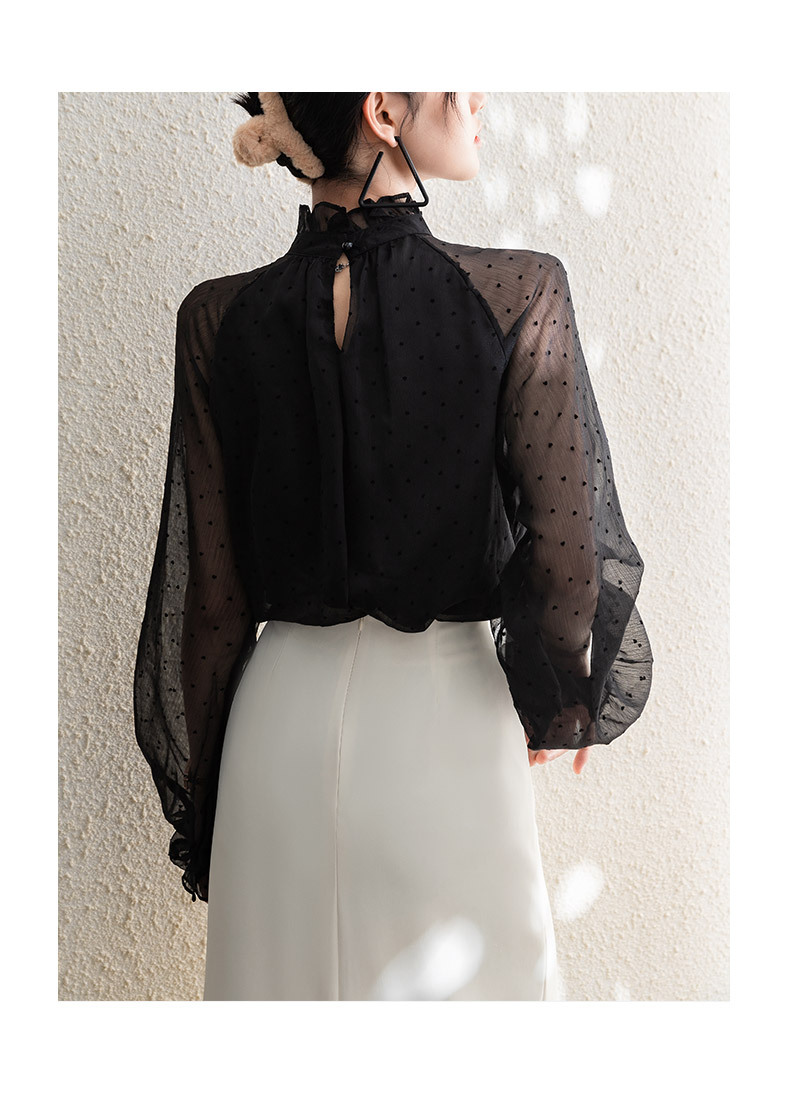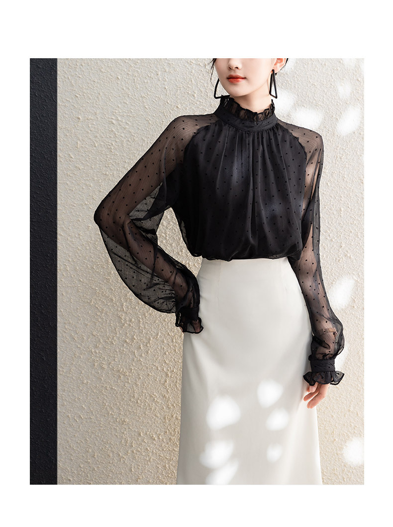 2025 새로운 여름 폴카 도트 곰팡이 스탠드 칼라 아름다운 쉬폰 셔츠 여성 가을 셔츠 루즈 탑 긴 소매